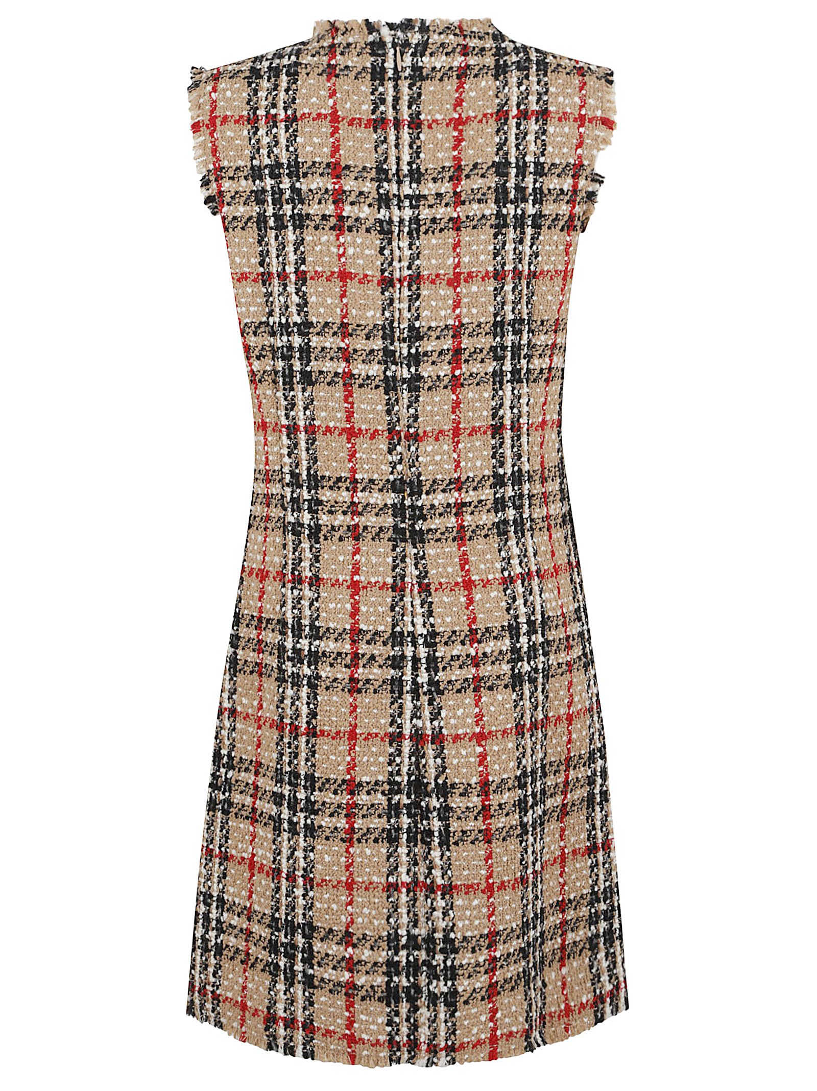 Beige checked pattern with fringed edge, sleeveless, round neckline, zip fastening.
