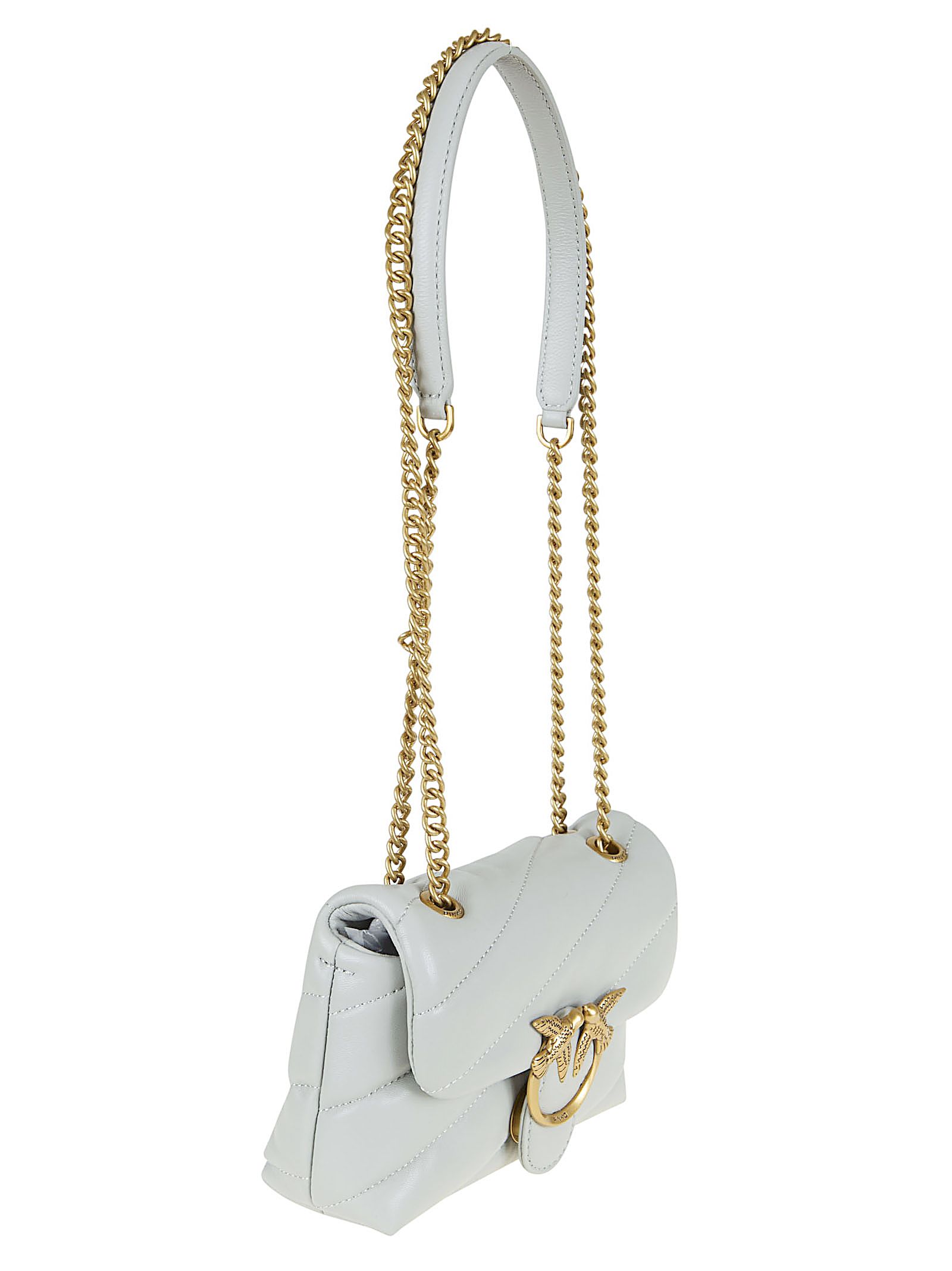 "Love Birds" quilted shoulder bag by PINKOCrafted from quilted leather, featuring a logo plaque, flap with snap button closure, chain link shoulder strap, main compartment, internal zipped pocket and internal lining.