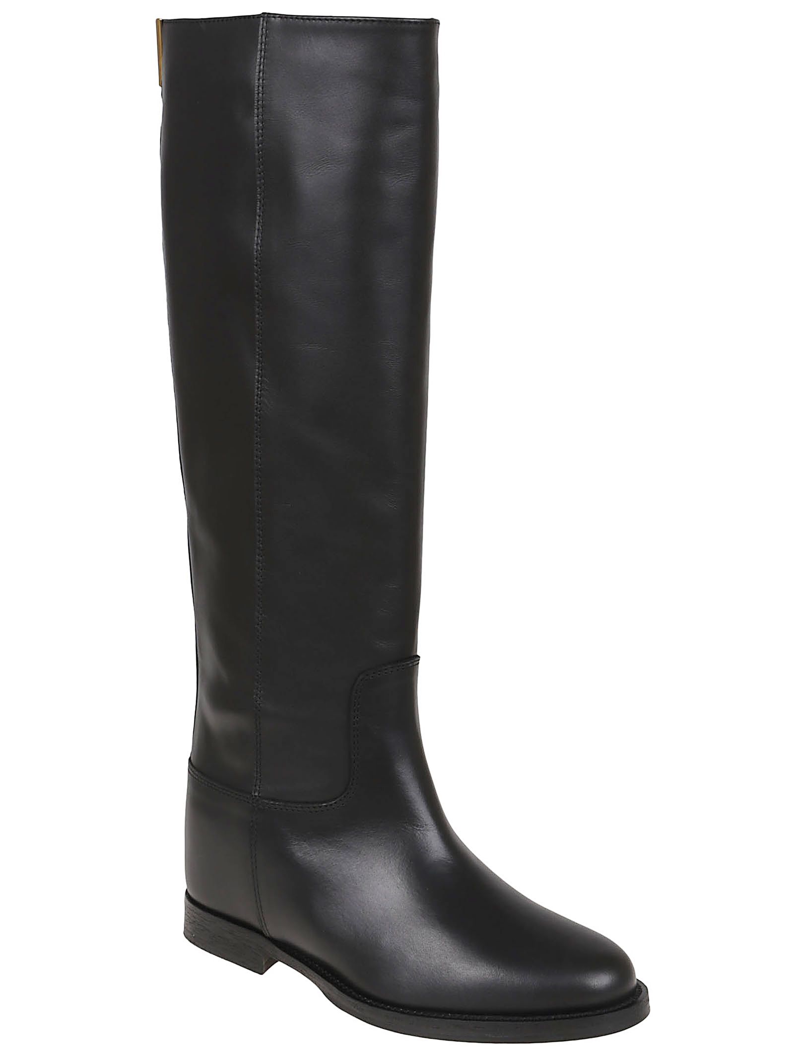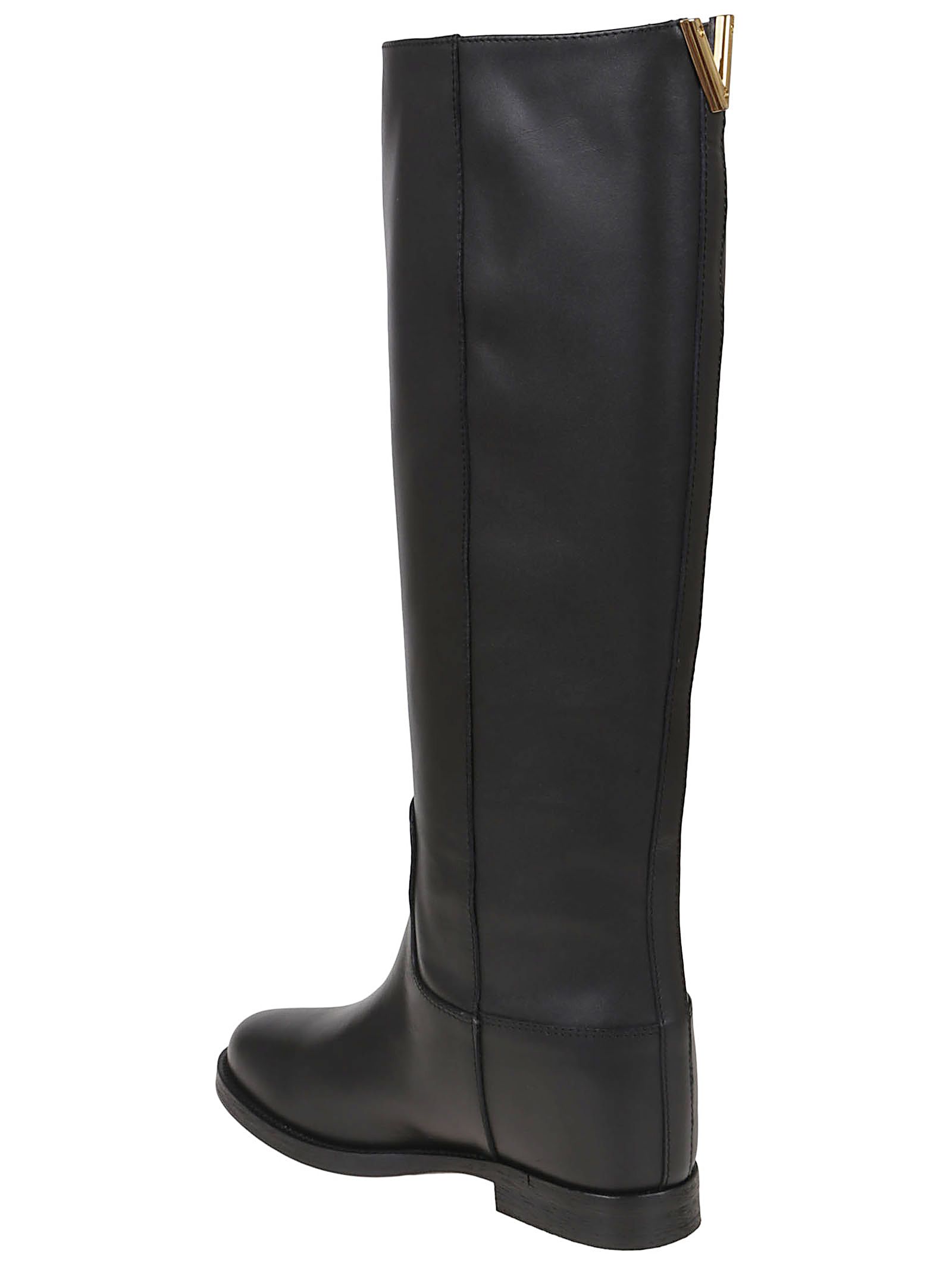 Knee-high boot in smooth-grain calfskin from VIA ROMA 15.Round toe, 5 cm internal wedge, branded leather insole; rubber sole.Features a decorative gold-tone metal plaque on the back.Made in Italy