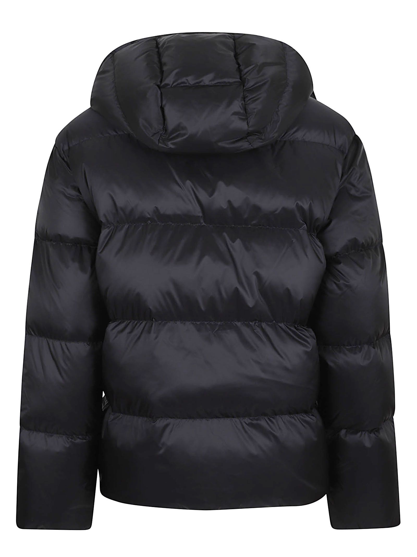 black recycled nylon padded with duck down, quilted design, detachable hood, front zip and snap button fastening, stand-up collar, distinctive Polo Pony motif, zipped chest pocket, long sleeves, elasticated cuffs, two side zipped pockets, fully lined, straight hem.