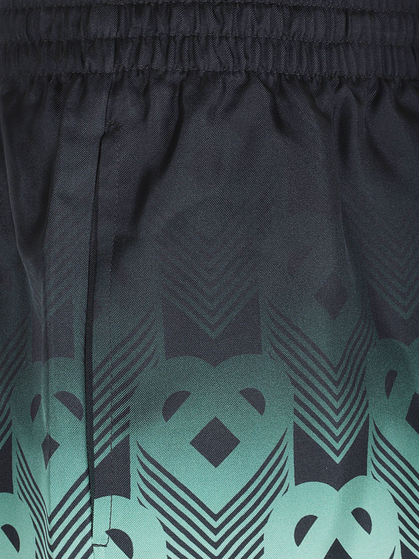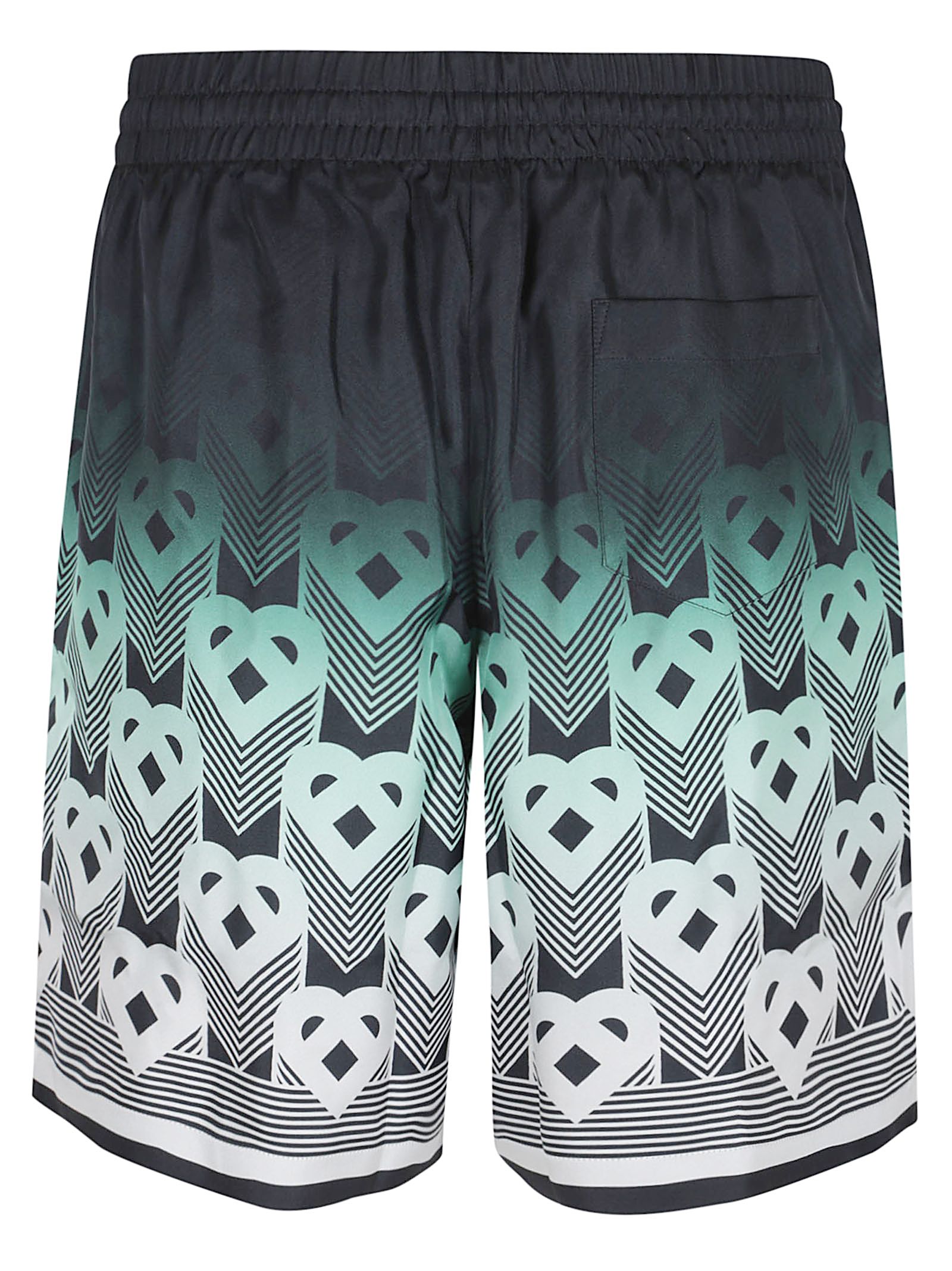 CASABLANCA Gradient Monogram silk twill shorts.Elastic drawstring waistband; side pockets and one back pocket; relaxed fit.Featuring an all-over print with the house`s heart monogram in a mint shade that echoes the color palette of the Park Hyatt, an iconic Tokyo hotel that uses mint and black tones for its interior design, and a striped detail at the hem.