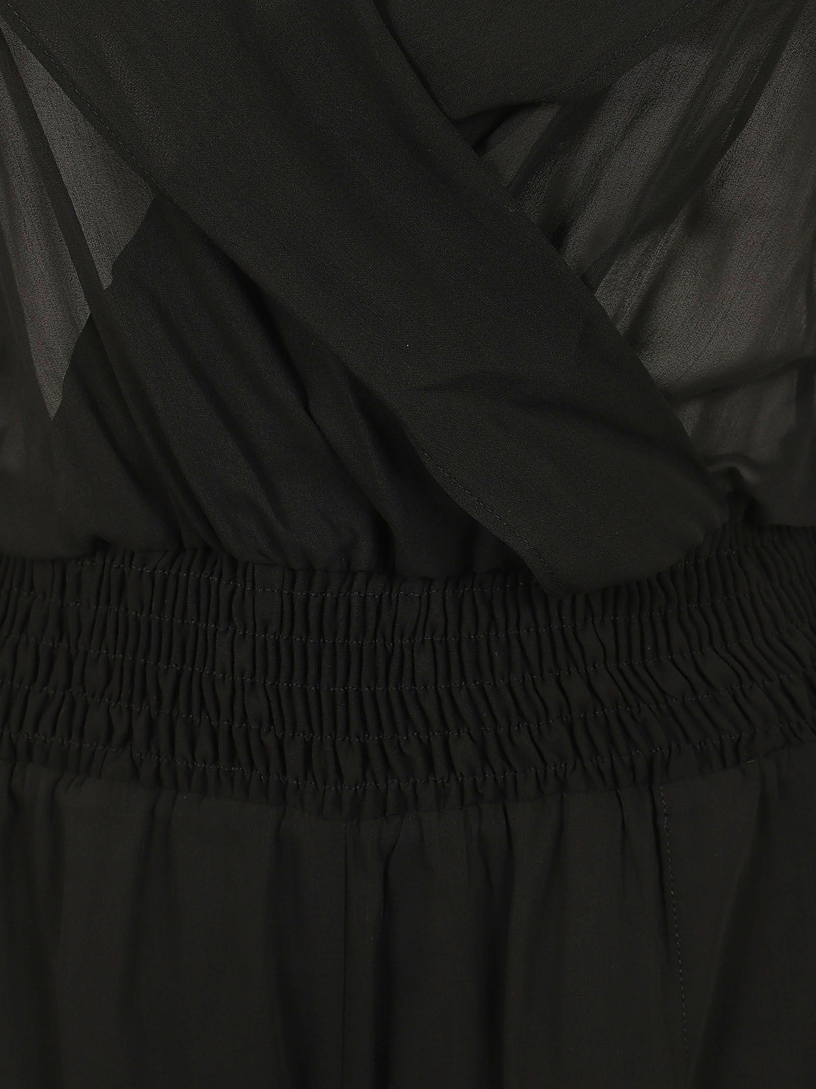 La parte superiore presenta maniche corte a farfalla, uno scollo a V incrociato sul davanti e un ampio scollo sulla schiena.
