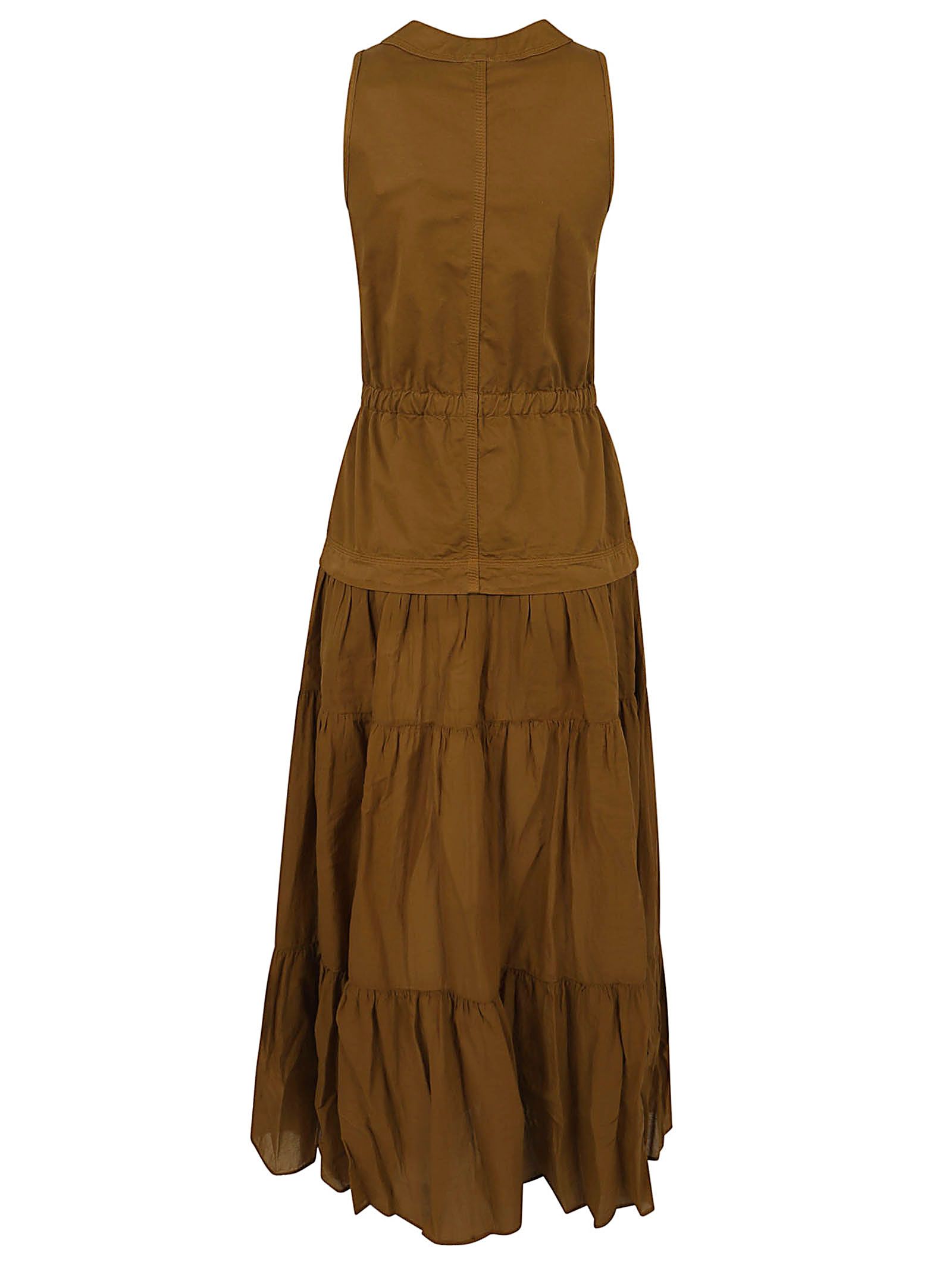 Presenta una parte superiore smanicata con un profondo scollo a V, arricchito da nastri incrociati che richiamano lo stile della corsetteria. I nastri terminano con anellini metallici decorativi.Silhouette: L`abito è valorizzato da una vita elasticizzata e da una gonna ampia caratterizzata da balze che creano movimento e dinamismo.