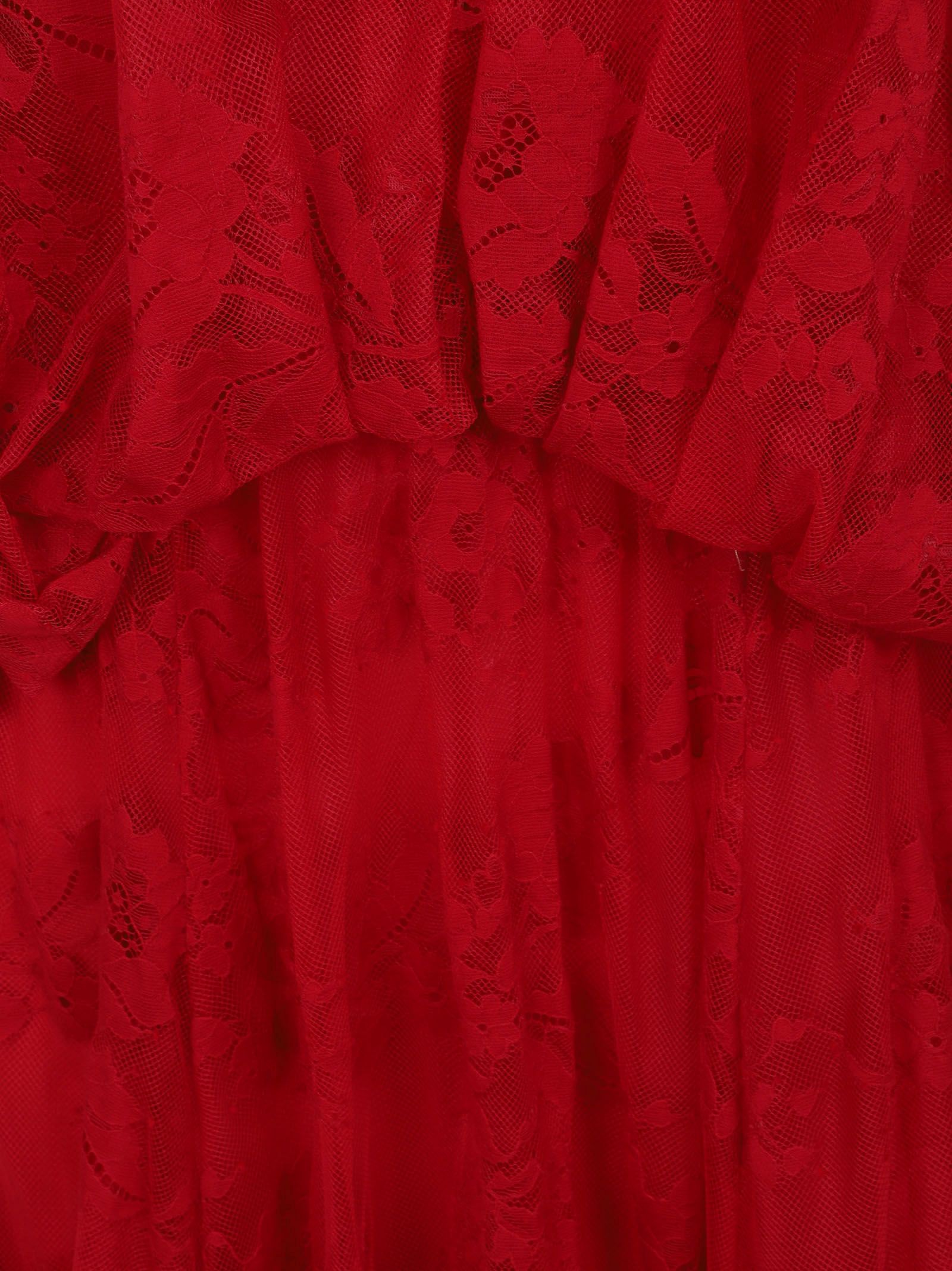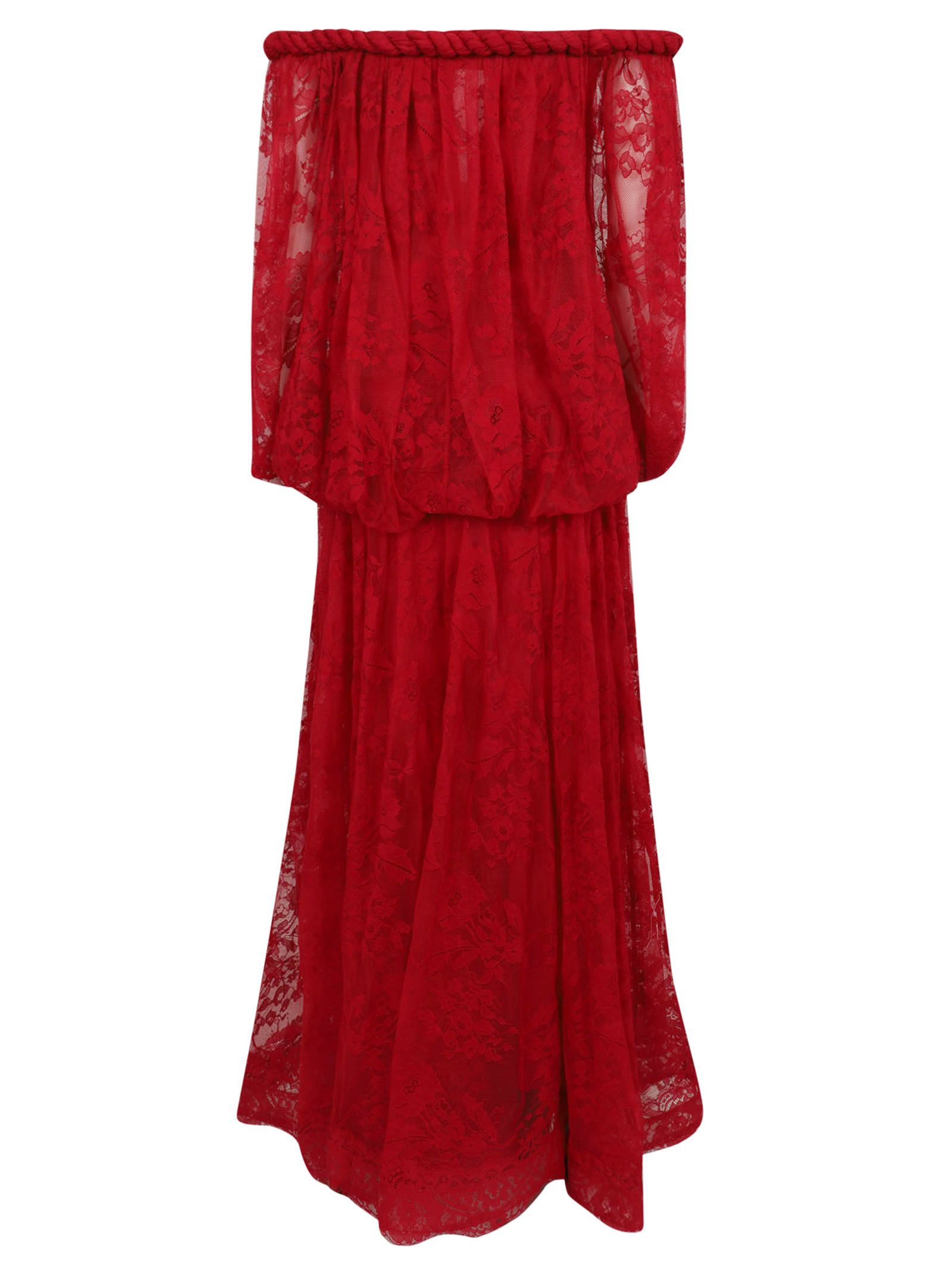 Abito lungo caratterizzato da maniche ampie con scollo a barca o off-the-shoulder.Presenta una profonda scollatura con dettagli in cordoncino intrecciato, polsini elasticizzati e rifiniture in pizzo smerlato.L`abito è realizzato in pizzo di misto cotone con motivo floreale.Il modello ha un taglio morbido ed è elasticizzato sui fianchi per una vestibilità flessibile.
