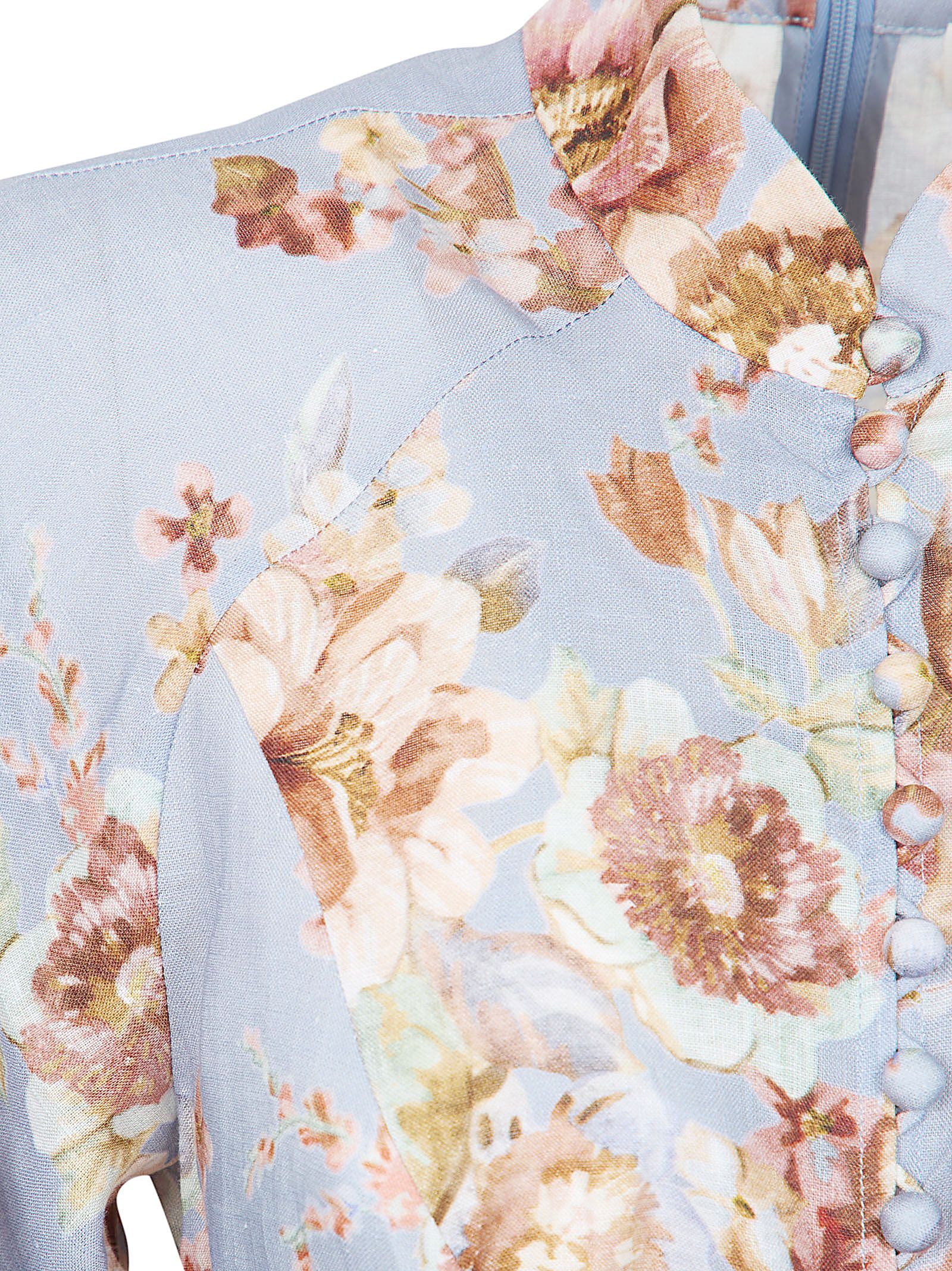 bottoni con stampa floreale azzurro chiaro, maniche lunghe a sbuffo, cintura alla vita da annodare