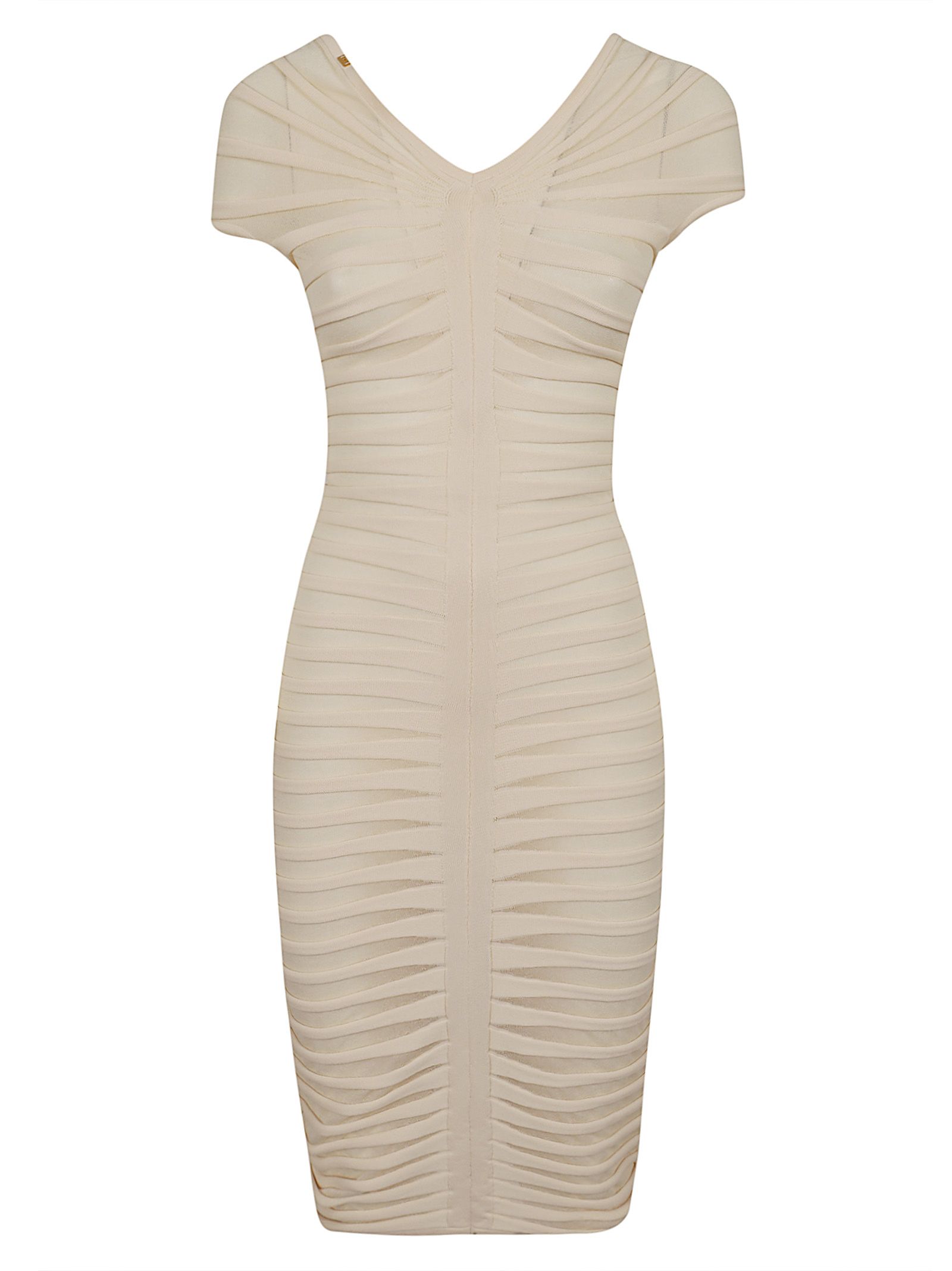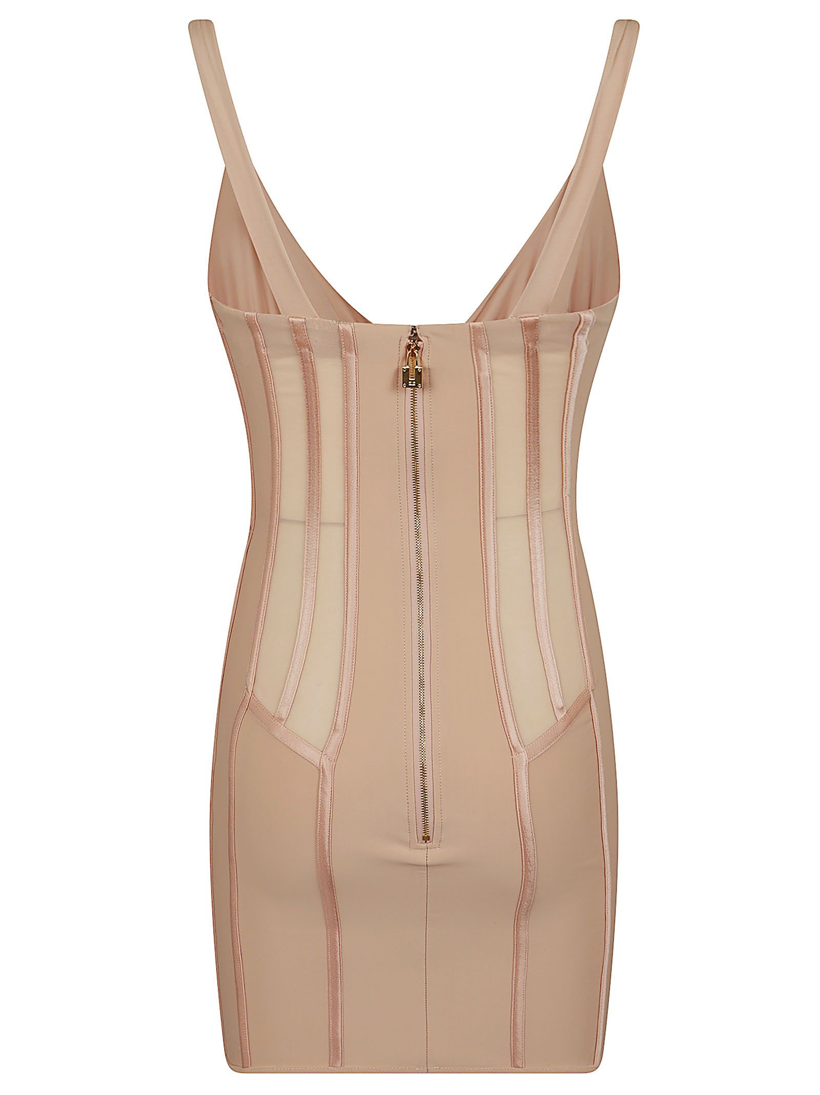 Abito bustier in tessuto bielastico e tulle di Elisabetta Franchi.Design modellante: Caratterizzato da tagli geometrici che scolpiscono la silhouette e inserti in raso.Presenta coppe in jersey e una chiusura frontale con ganci in metallo dorato.Realizzato in un mix di tessuto bielastico, tulle, jersey e raso per una vestibilità slim.