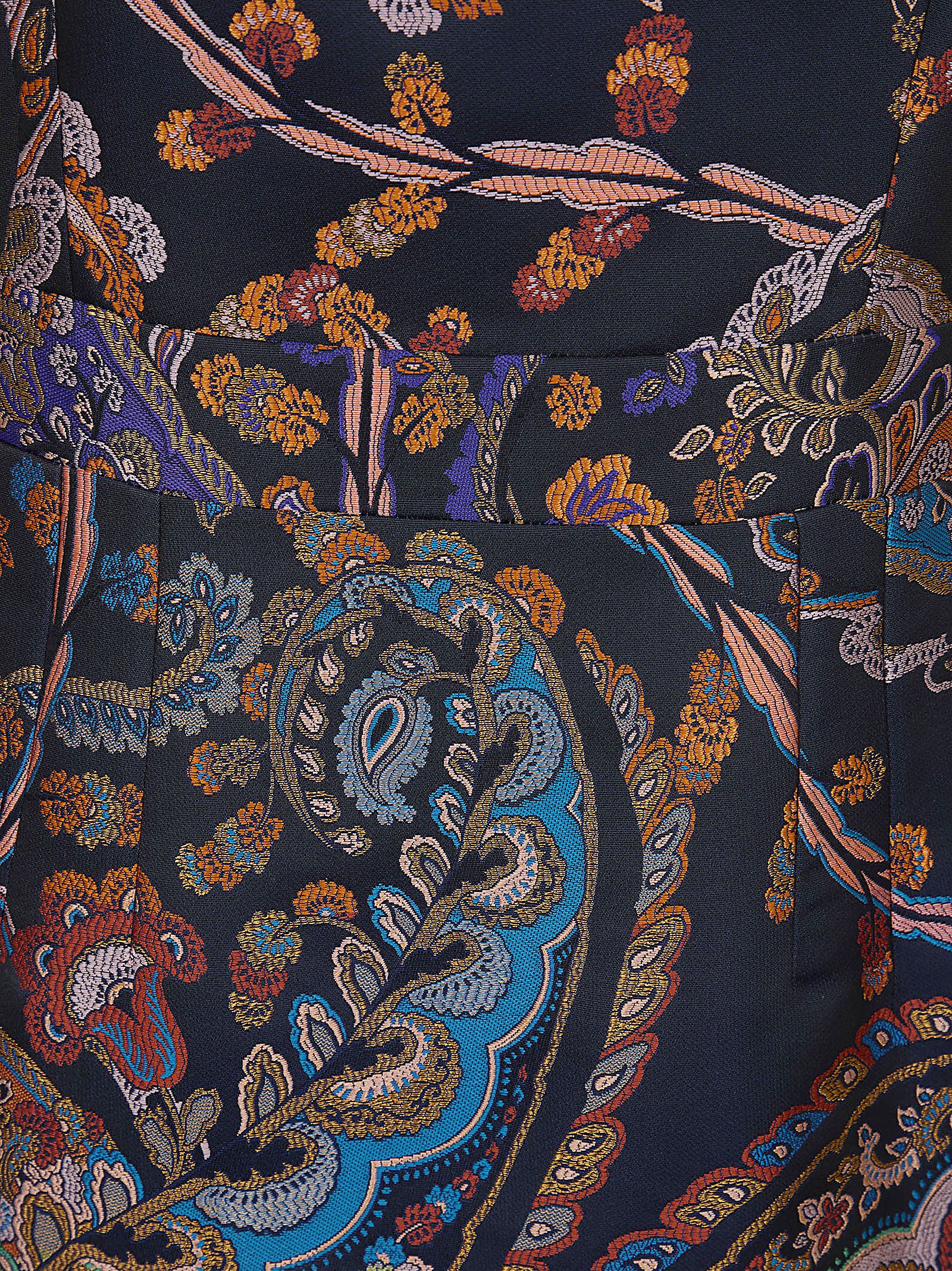 giacca in jacquard blu con stampa floreale, scollo quadrato, chiusura posteriore con zip e spacco sul retro