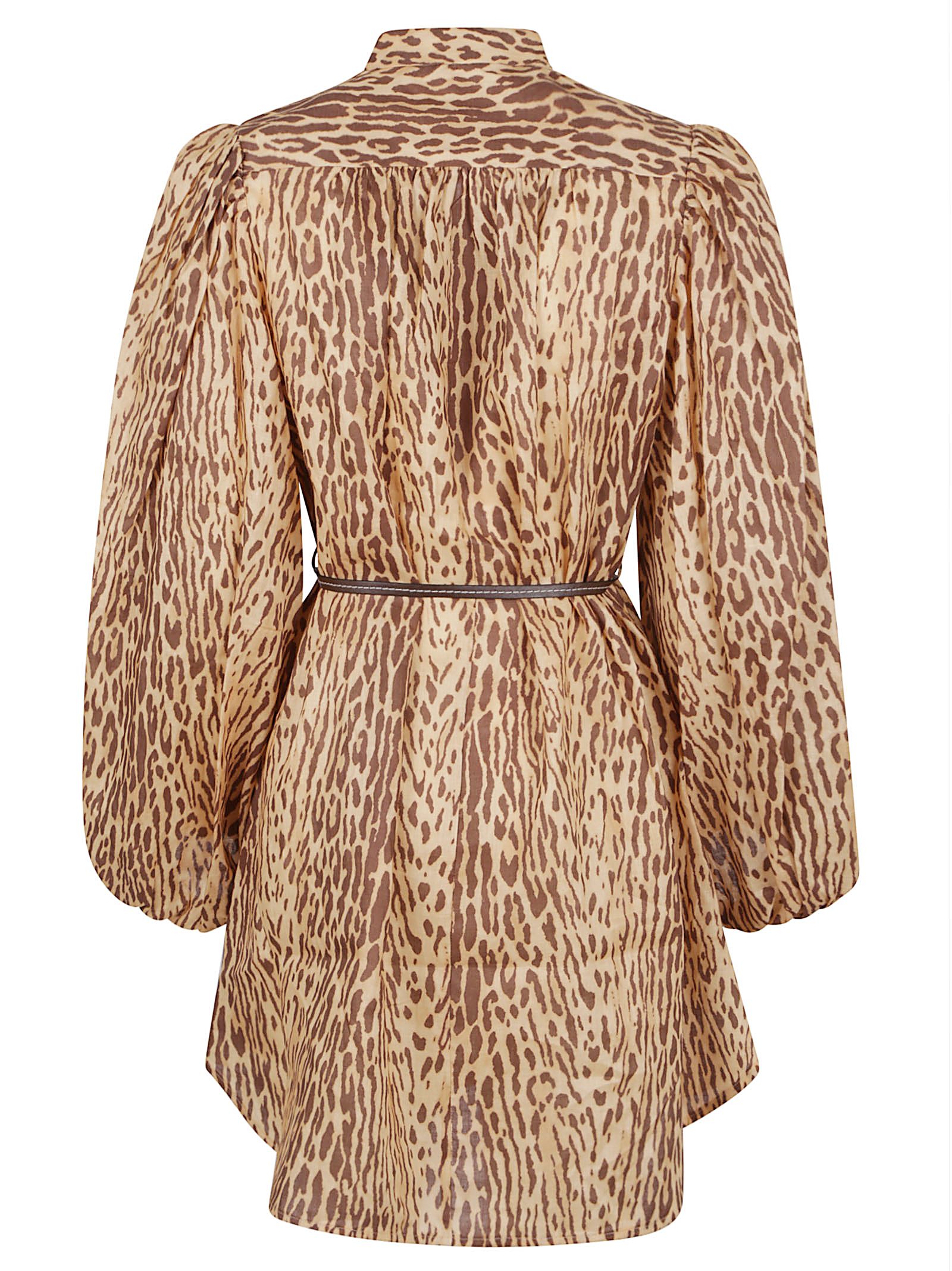 Abito tunica Cascadian Bias in Tan Leopard di cotone di ZIMMERMANN.Colletto rialzato; maniche lunghe a palloncino-Caratterizzata da stampa allover.Caratterizzato da cintura in vita.