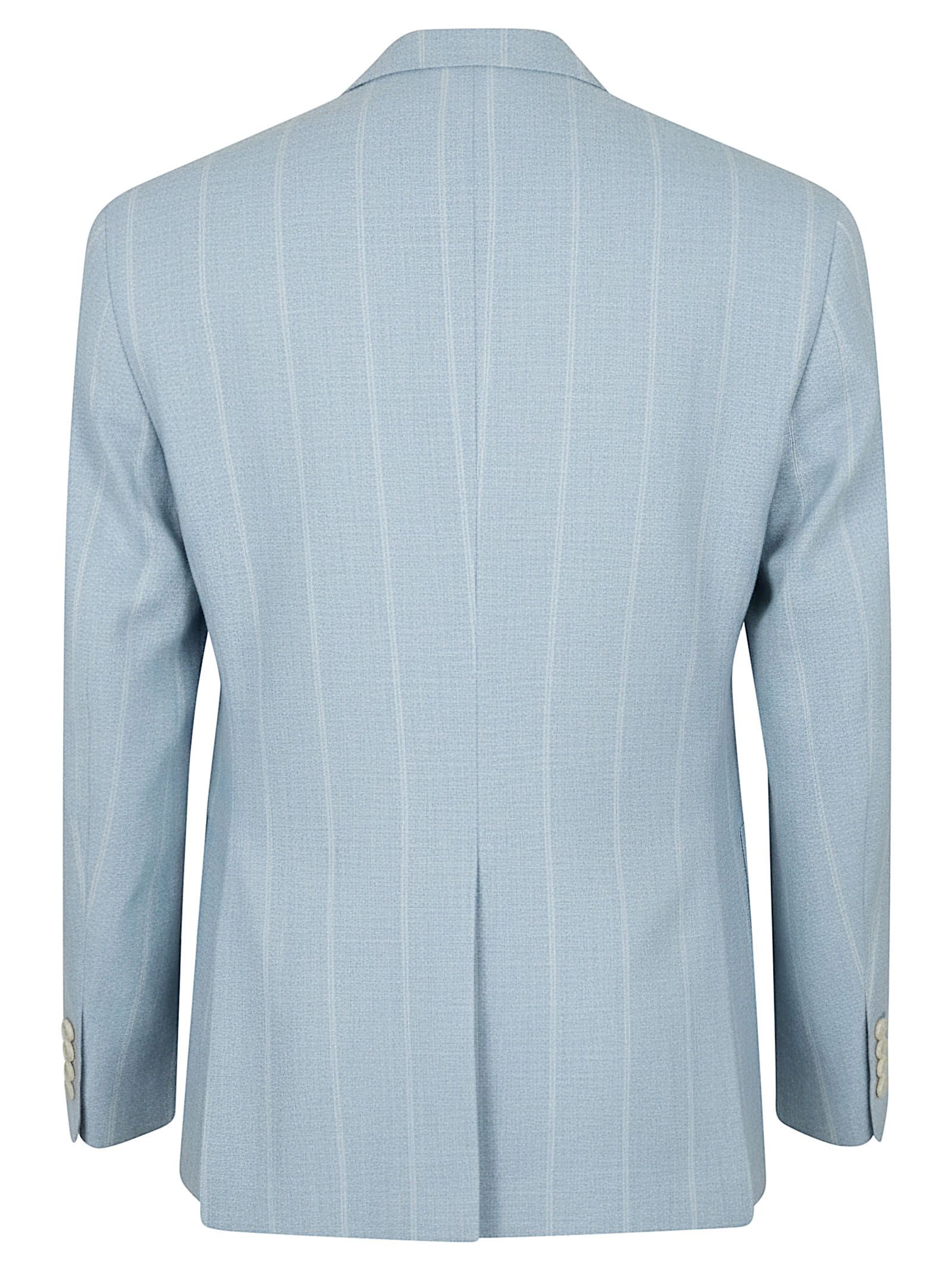 Abito in lana seta e lino gessato di ELEVENTY.Giacca: monopetto, chiusura con due bottoni; due tasche applicate e una a filetto.Pantalone: vita con elastico e coulisse a contrasto, chiusura con zip e bottone; due tasche oblique e due a filetto con patta e bottone sul retro; doppie pinces.