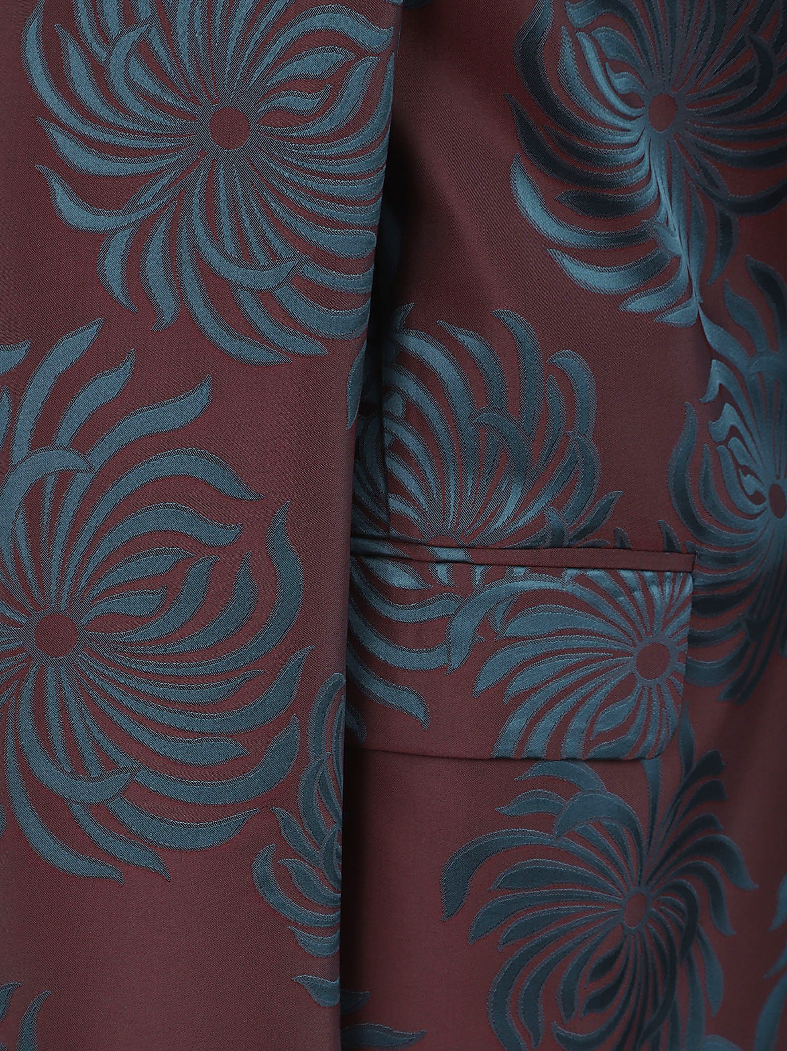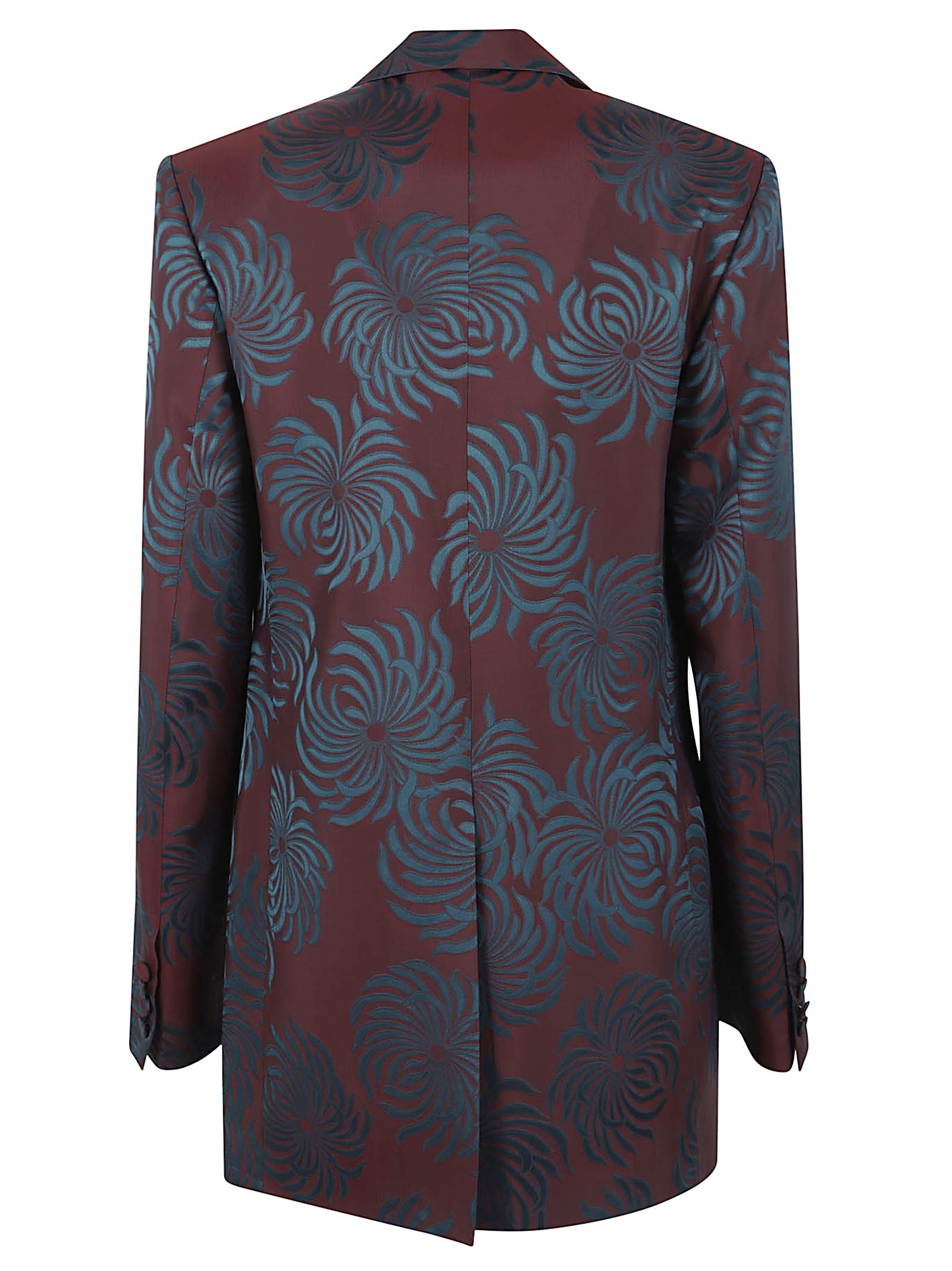 Giacca con un bottone e revere grandi in seta con fiori disegnati .abbinabile al suo pantalone.