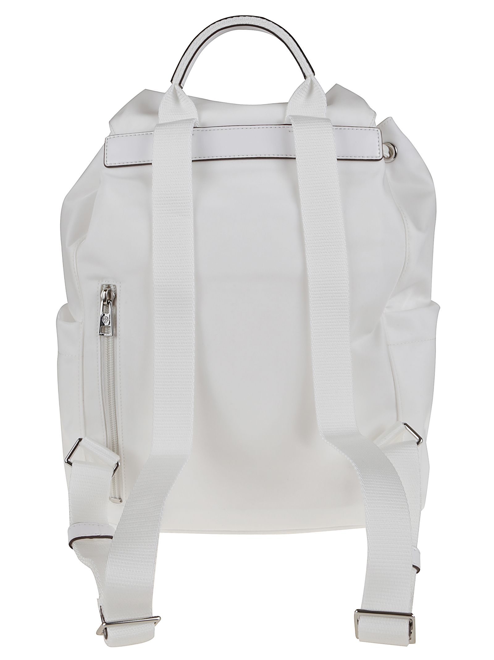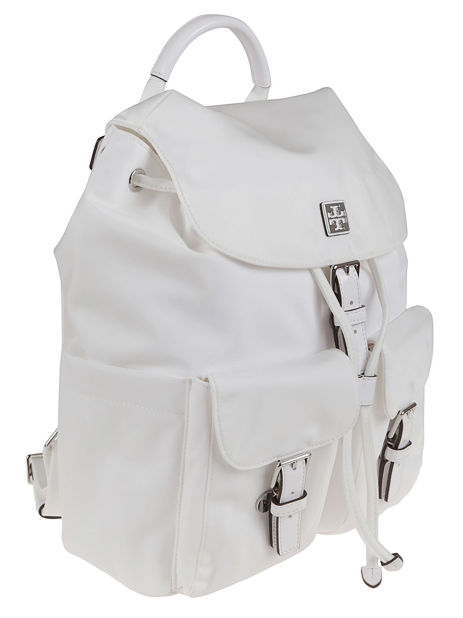Zaino Virginia realizzato in resistente nylon riciclato con rifinitura alternativa alla pelle bio-based di TORY BURCH.Spallacci in tessuto regolabili e manico superiore; chiusura con coulisse, pattina con chiusura magnetica a scatto sotto la fibbia; due tasche esterne anteriori con fibbia, due tasche laterali esterne, una tasca esterna posteriore con zip, una tasca interna anteriore, una tasca interna con zip.Caratterizzato da Logo sulla patta frontale.