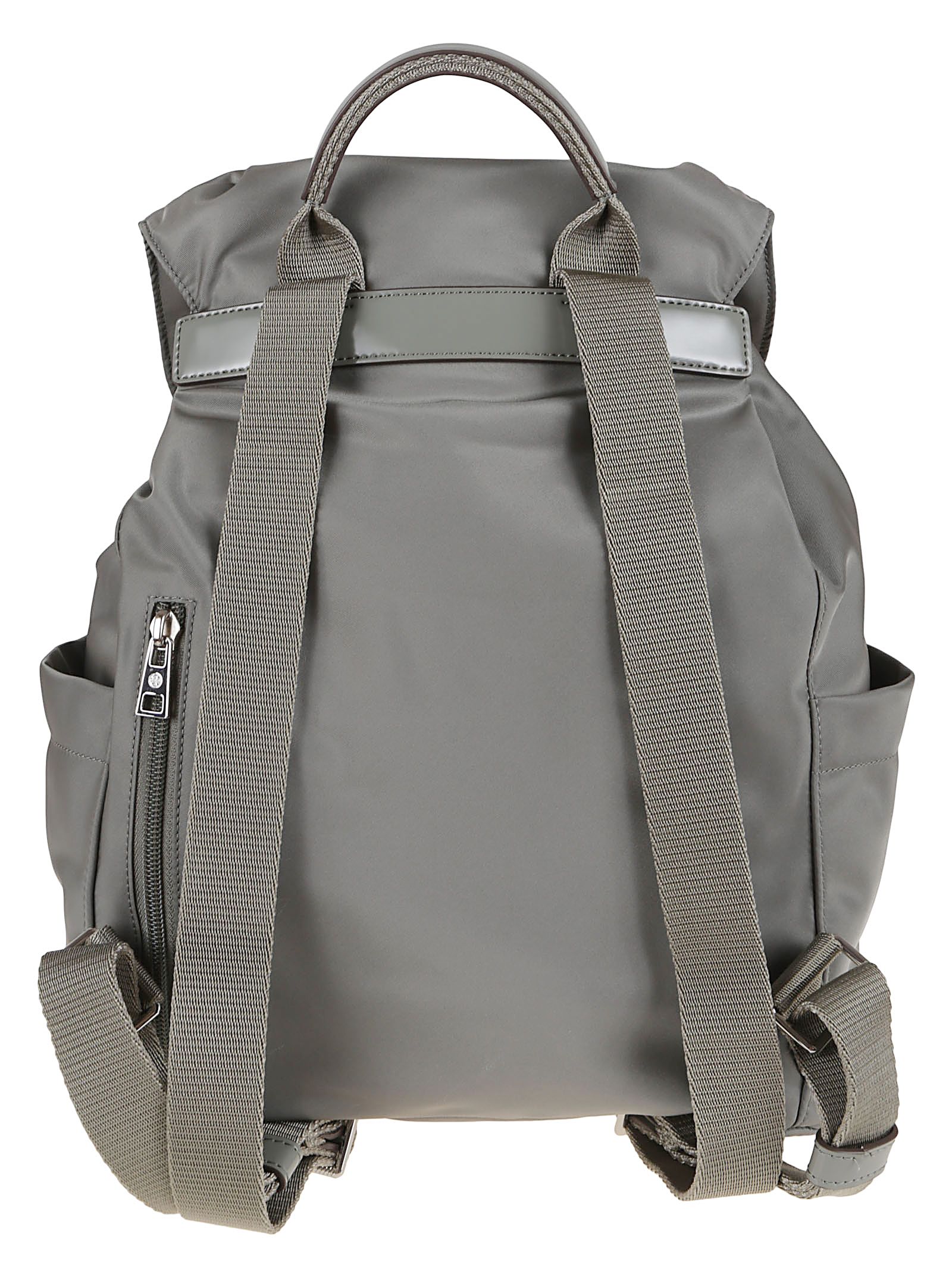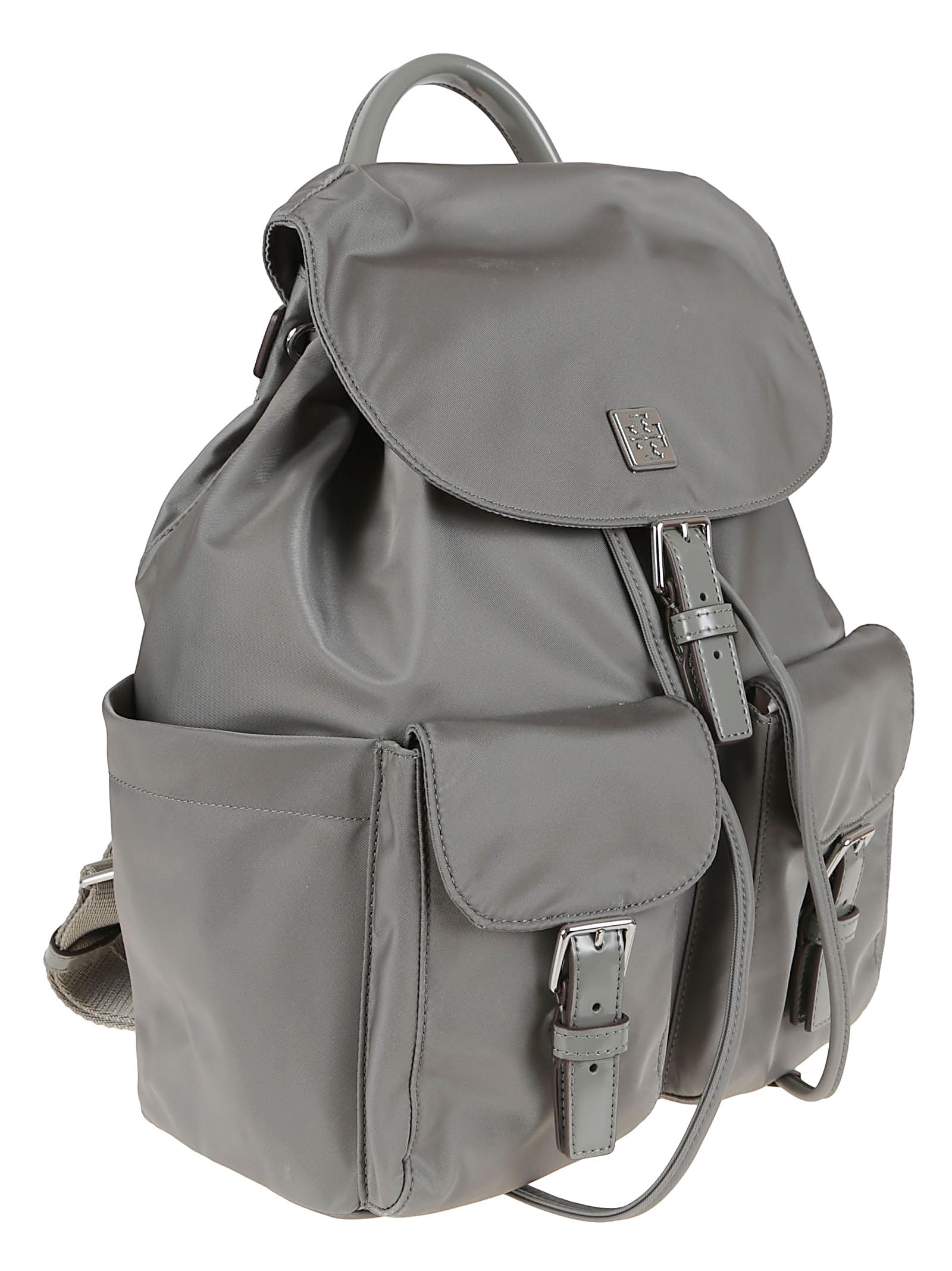 Zaino Virginia realizzato in resistente nylon riciclato con rifinitura alternativa alla pelle bio-based di TORY BURCH.Spallacci in tessuto regolabili e manico superiore; chiusura con coulisse, pattina con chiusura magnetica a scatto sotto la fibbia; due tasche esterne anteriori con fibbia, due tasche laterali esterne, una tasca esterna posteriore con zip, una tasca interna anteriore, una tasca interna con zip.Caratterizzato da Logo sulla patta frontale.