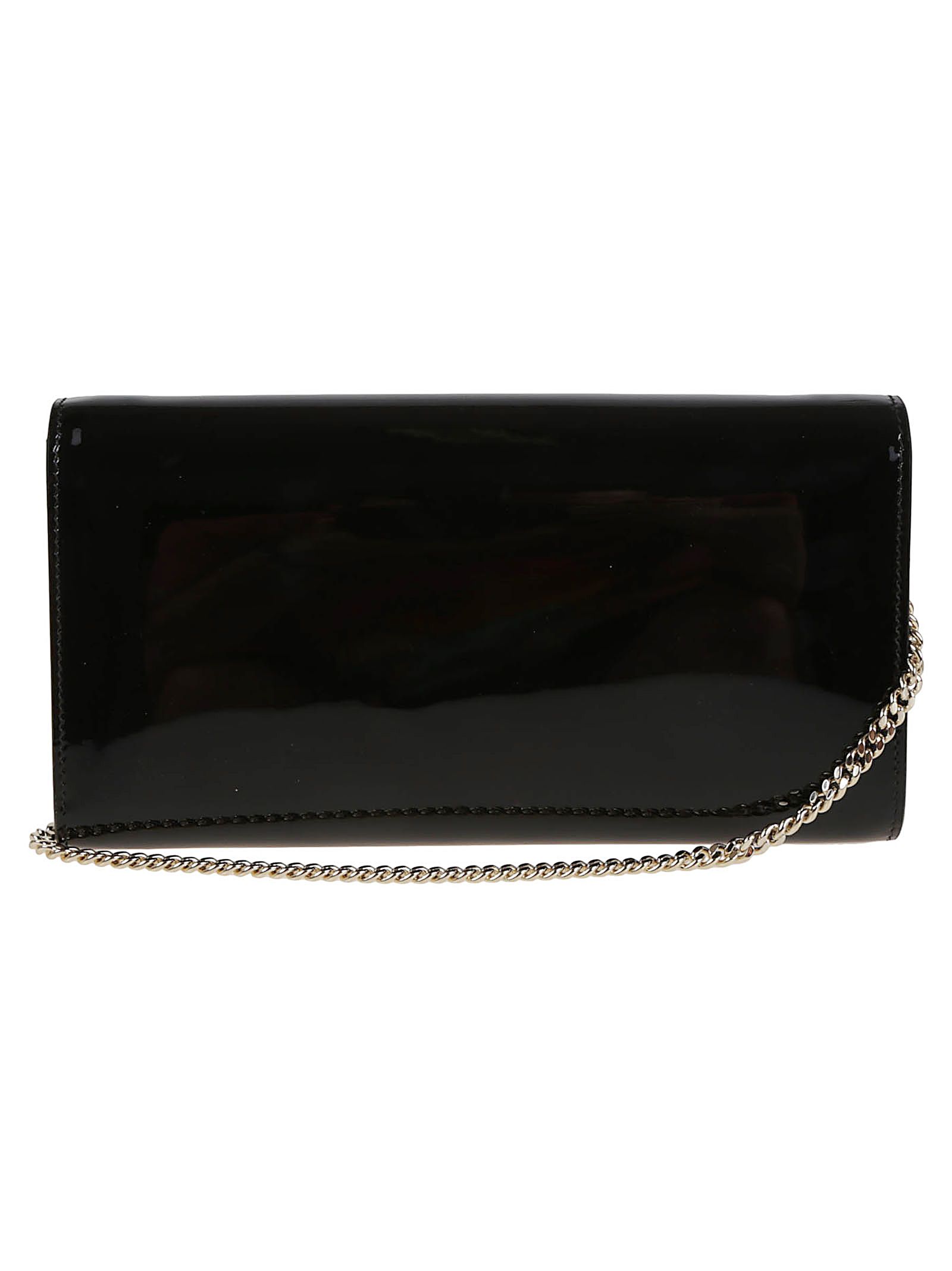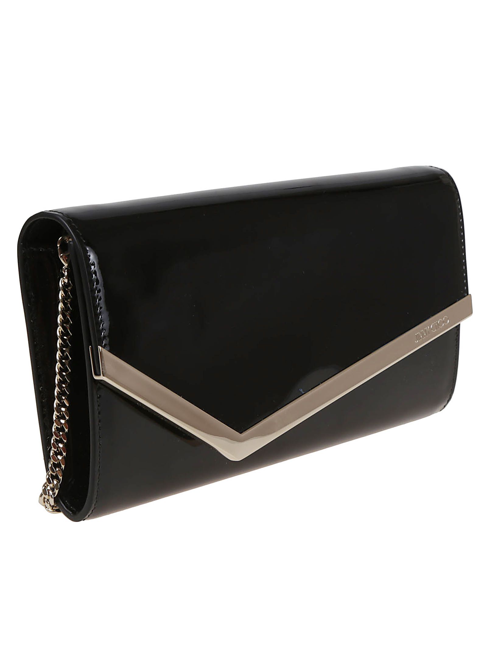 Pochette Emmie in pelle verniciata di JIMMY CHOO.Fodera in pelle; Interno: sei portacarte, una tasca interna con zip e uno scomparto; chiusura con bottone a pressione magnetico con incisione Jimmy Choo sul pannello anteriore; catena rimovibile.Caratterizzata da struttura moderna dai bordi netti.