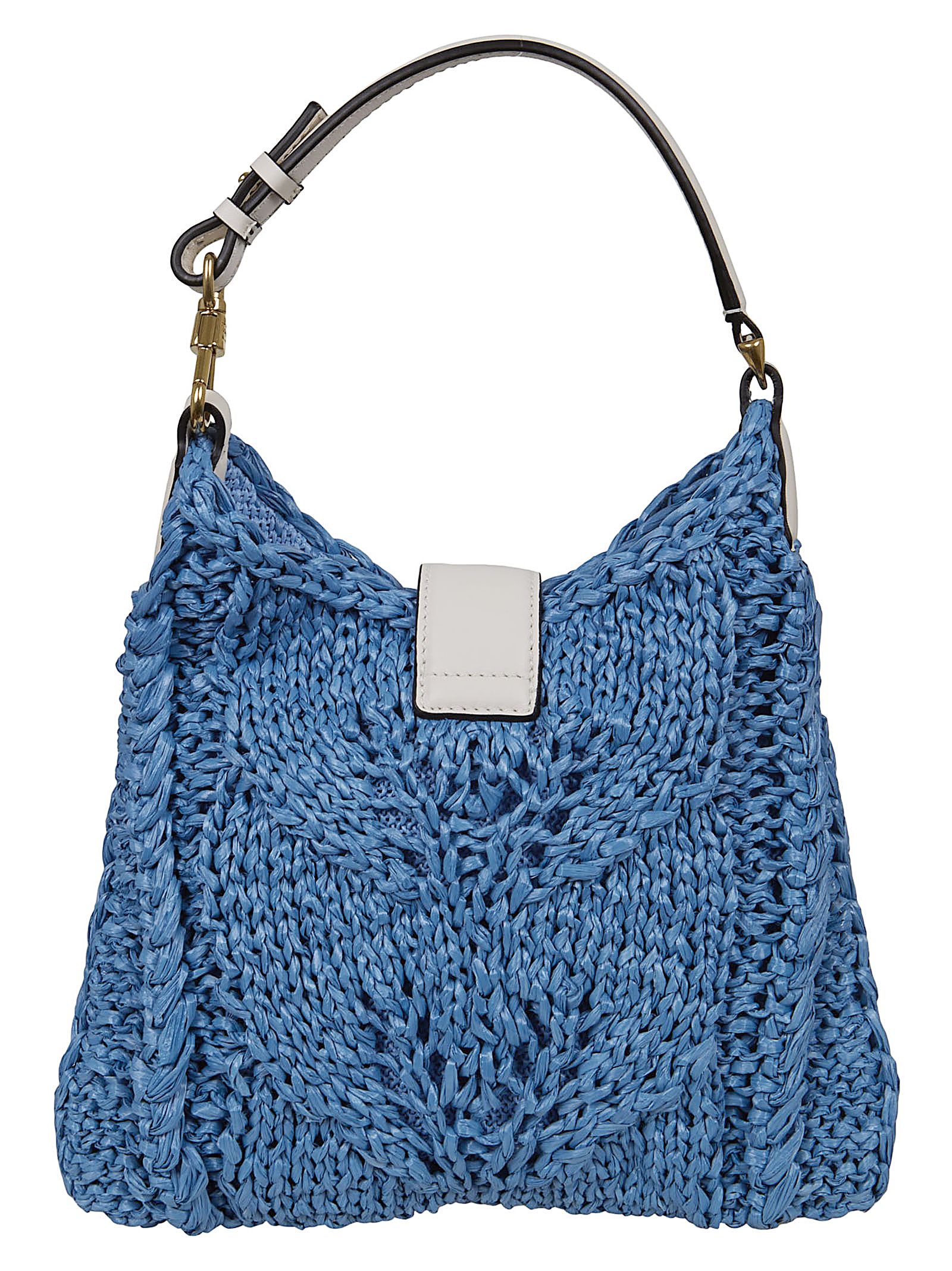 Borsa mini hobo realizzata a mano con filato di rafia di ERMANNO SCERVINO.Forma a sacca; chiusura a clip in metallo e il moschettone Logato.