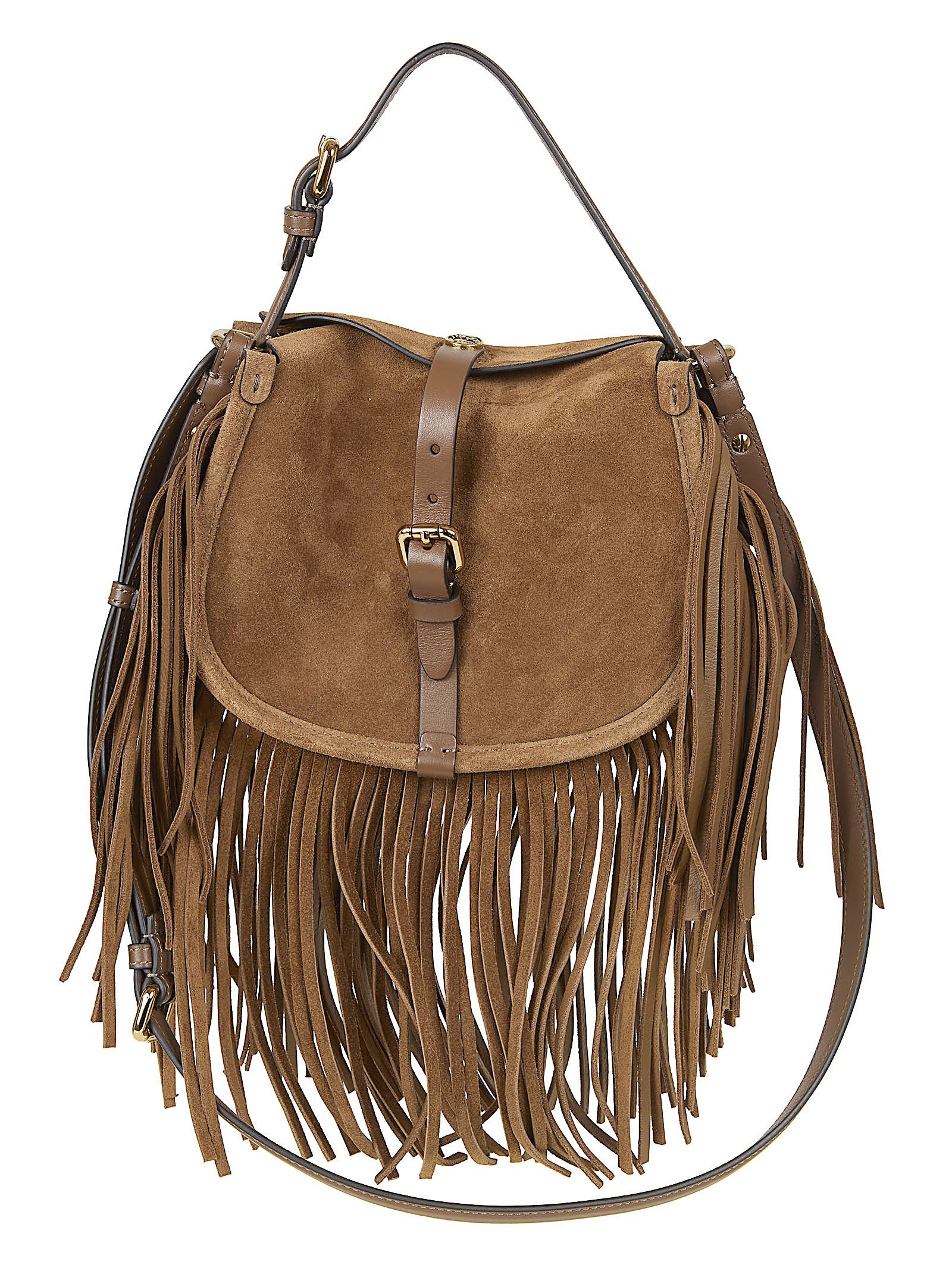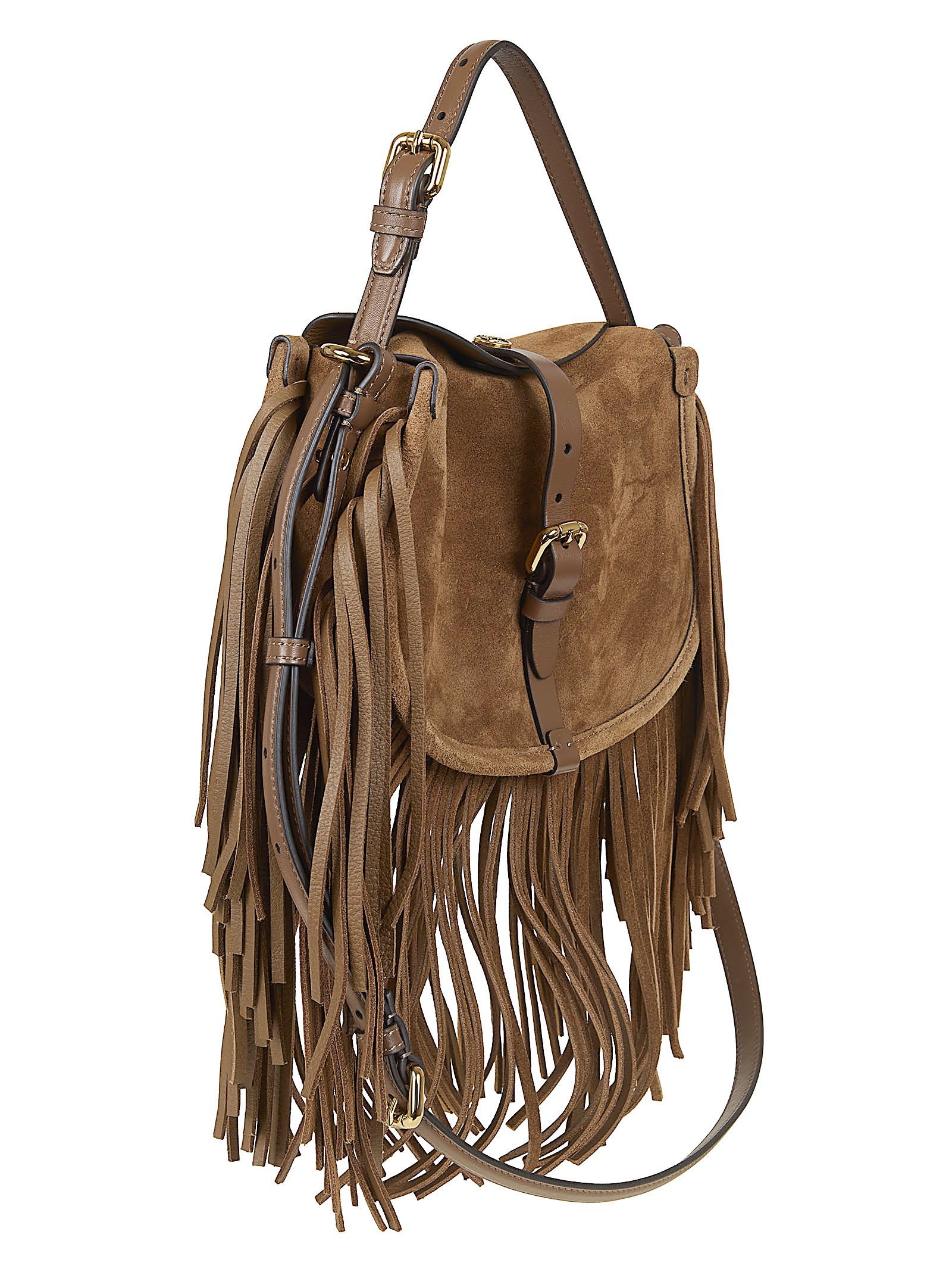 Borsa Pony piccola in suede tinta unita di ETRO.Doppia chiusura: quella principale con bottone magnetico decorato dalla moneta in metallo con Pegaso e quella secondaria con fibbia metallica funzionale; un manico fisso e una tracolla rimovibile; elementi metallici con finitura dorata.Linee morbide arricchita da lunghe frange in tono.
