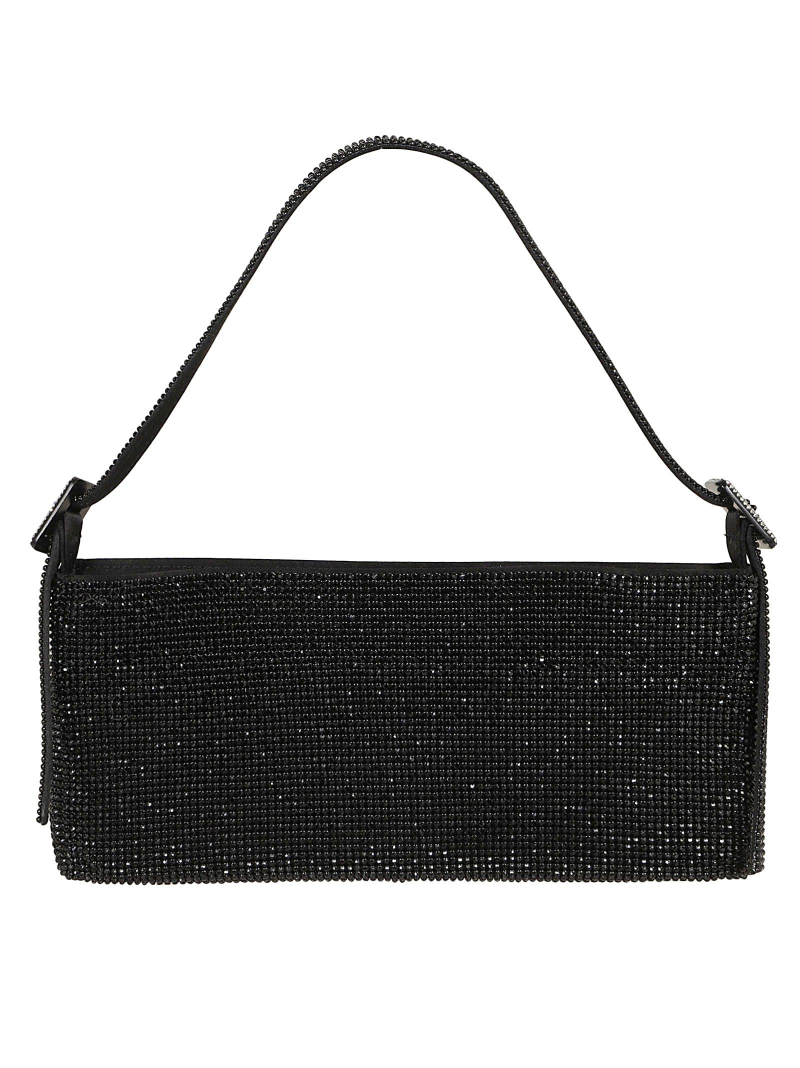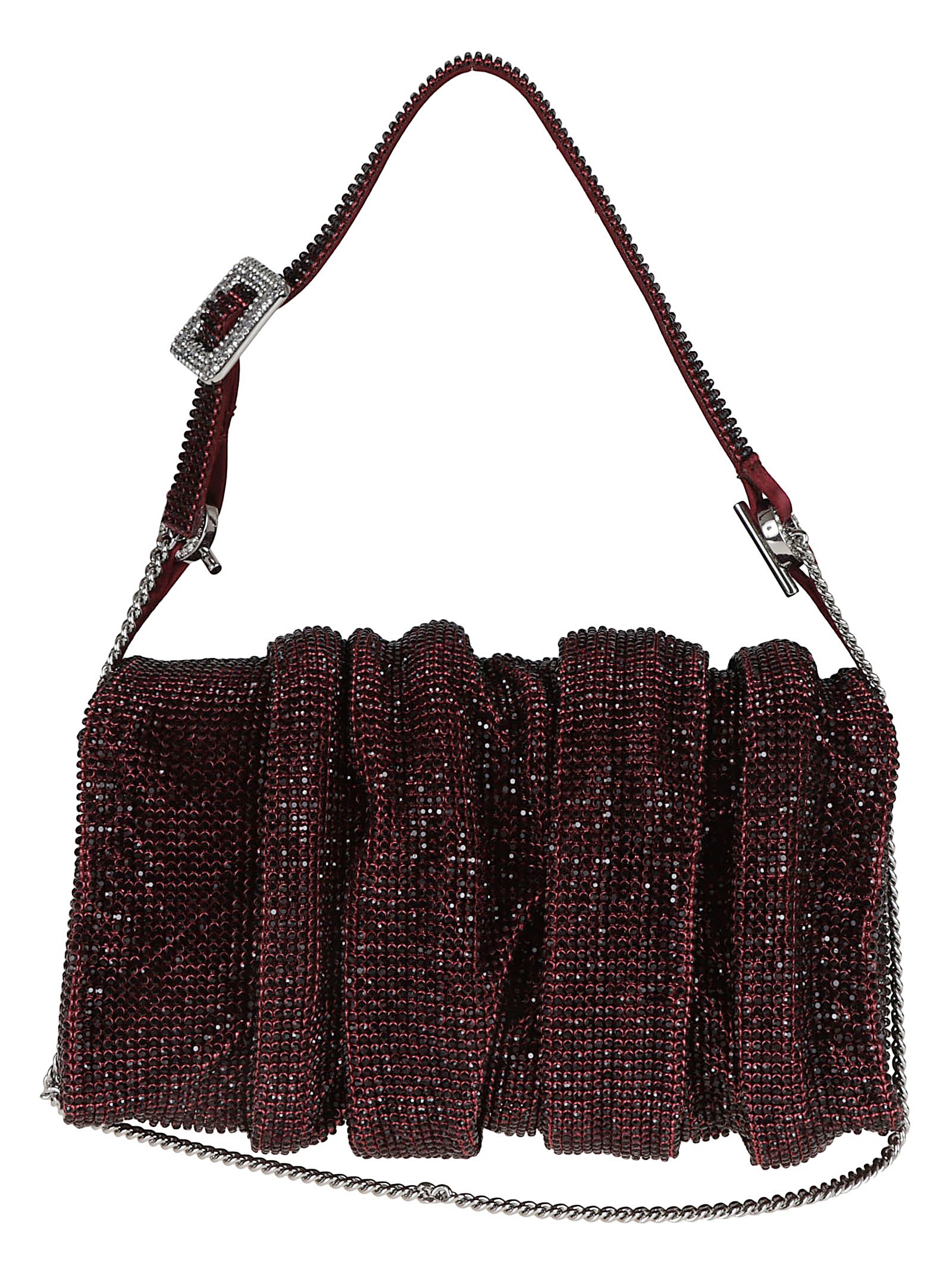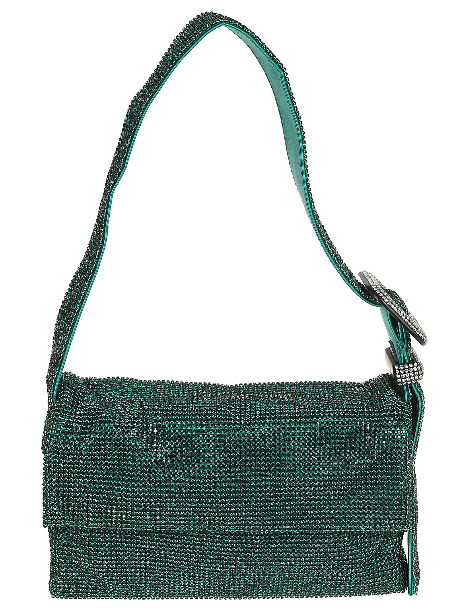 Borsa IRIS MISS fodera raso di seta di BENEDETTA BRUZZICHES.Patta magnetica; manico superiore regolabile con fibbia e occhielli per tracolla a catena.Caratterizzata da onde e tempestata di strass di cristallo.