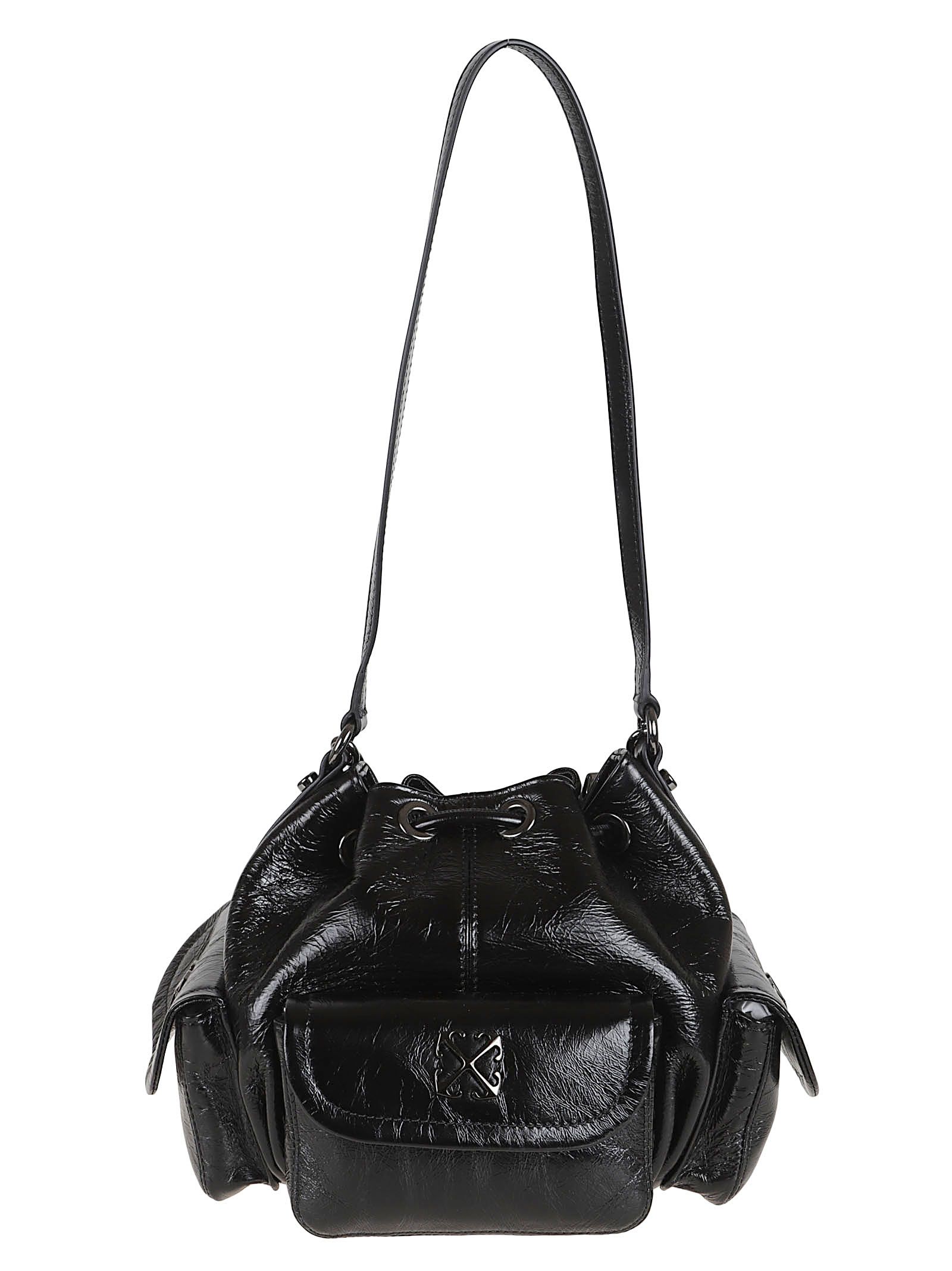 Catena nera come dettaglio, chiusura con coulisse, manico superiore, tasche con pattina frontale.