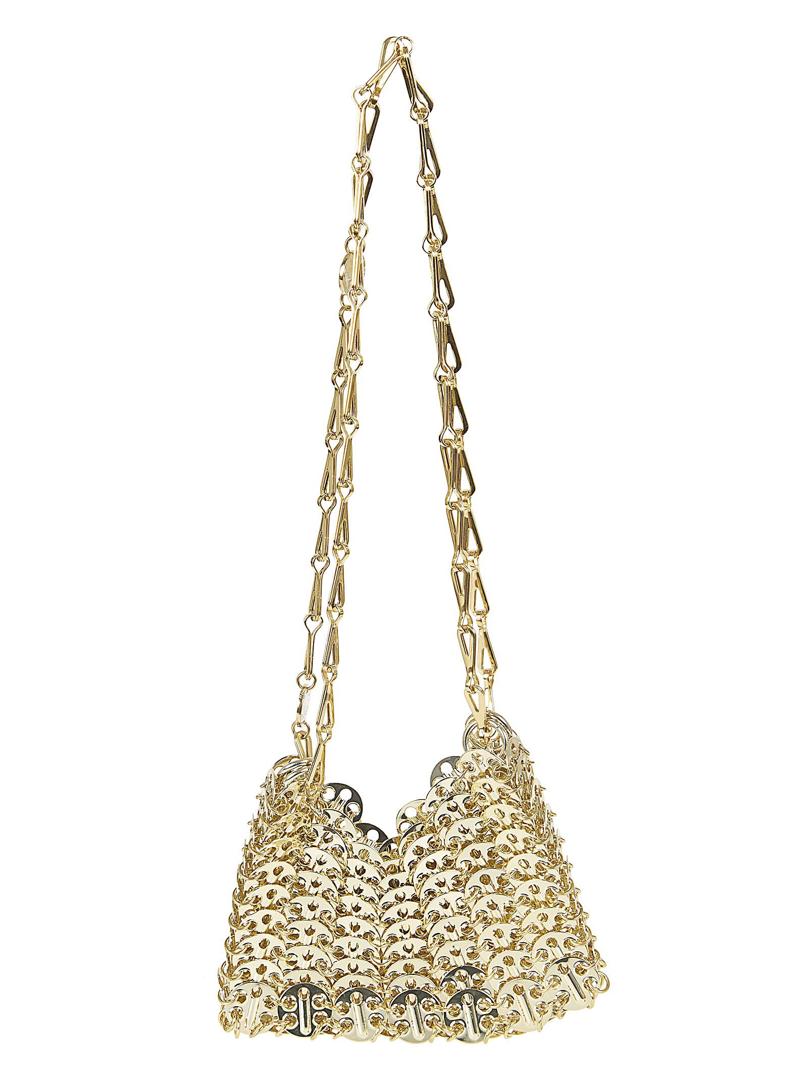 La borsa metallica del 1969 simboleggia l`eleganza innovativa di Rabanne.Realizzata con 282 dischi assemblata a mano da anelli metallici in materiali sperimentali.