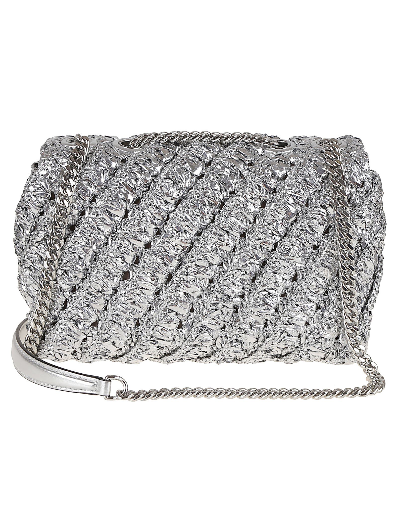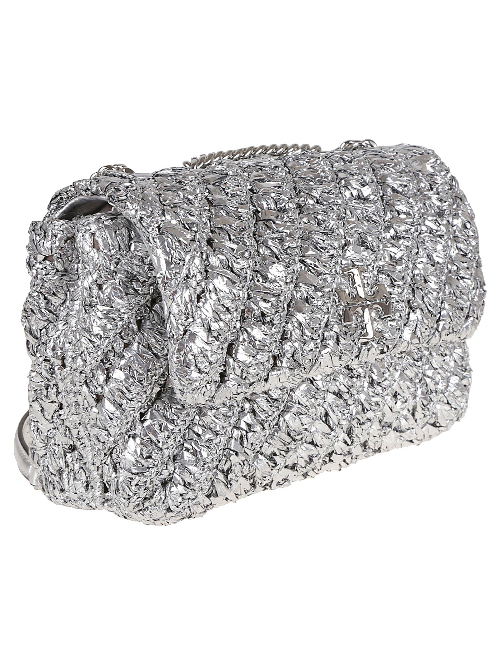 Shoulder bag Kira in nylon metallizzato lavorato a mano all’uncinetto con rifinitura in pelle di TORY BURCH.Pattina con chiusura magnetica; fodera in microfibra con finitura in simil suede tasca interna sul lato anteriore e una tasca interna con zip.Tracolla in catena convertibile.Impreziosita da dettaglio a doppia T smussati.