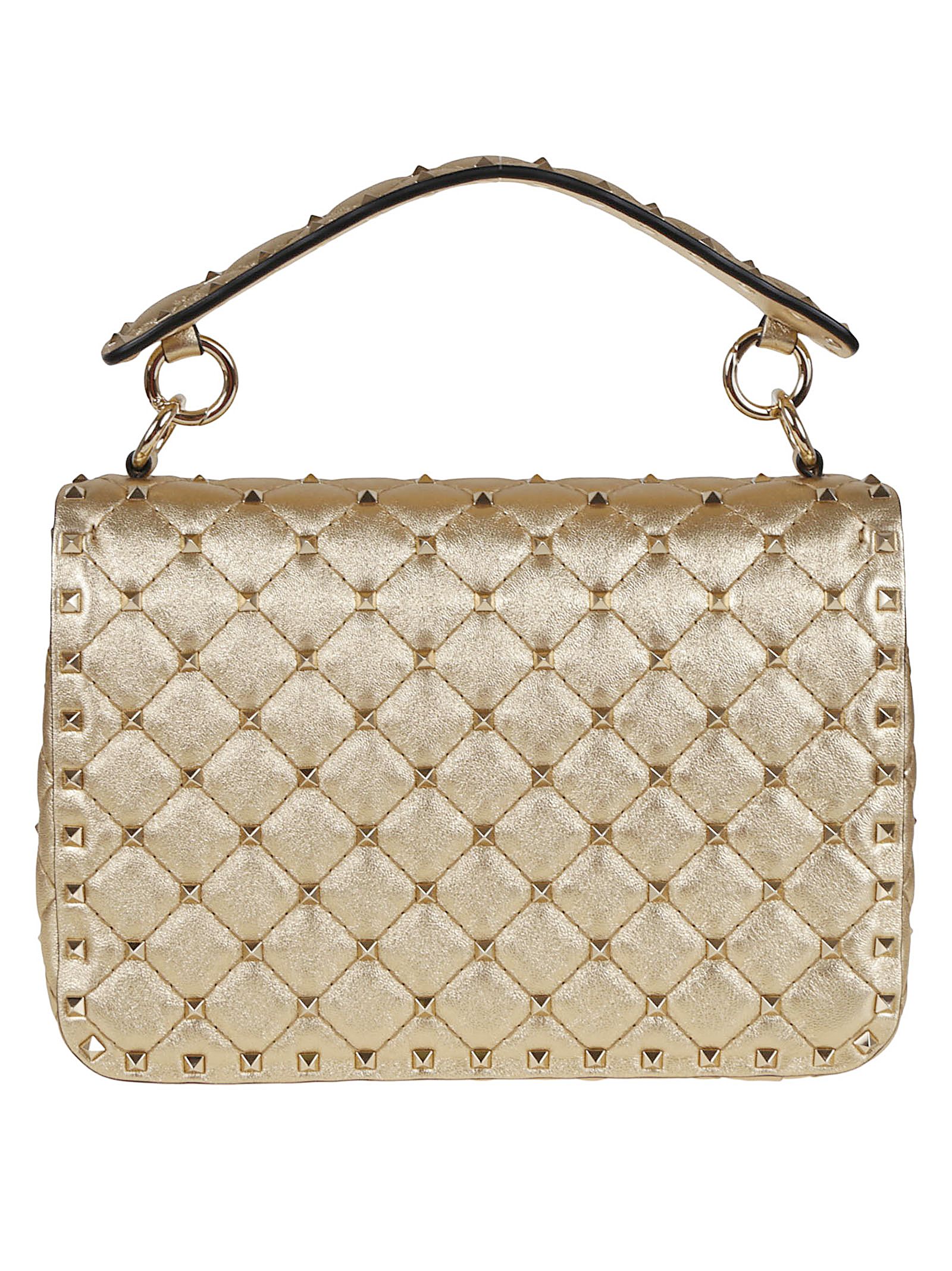Borsa Rockstud Spike di VALENTINO GARAVANI, in nappa laminata, tema a rombi delineati da cuciture tono su tono, impreziosita e decorata con piccole borchie color oro. Chiusura a girello; fodera in nappa. Interno: tasca aperta.Questa borsa può essere portata sia a mano con il suo manico amovibile, sia a tracolla grazie alla catena scorrevole e amovibile colore delle borchie.