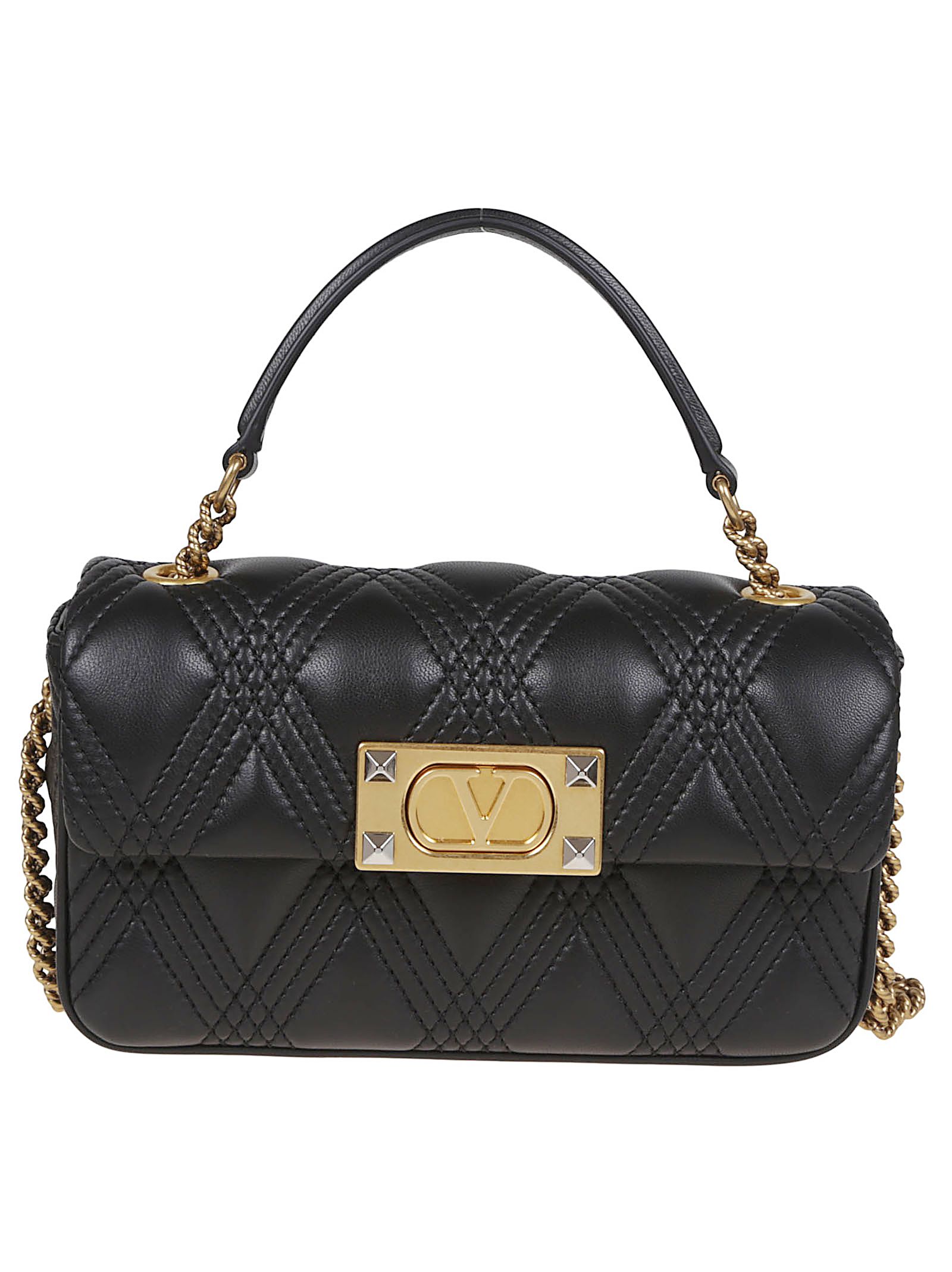 Borsa a spalla Locò in pelle di vitello BY VALENTINO GARAVANI. Chiusura magnetica; una tasca piatta presente all`interno. Caratterizzata da VLogo Signature nella parte frontale, color ottone anticato come le altre parti metalliche. Ideale da essere indossata sia a spalla/cross-body grazie alla catena scorrevole e amovibile; sia a mano grazie al manico anch`esso amovibile.
