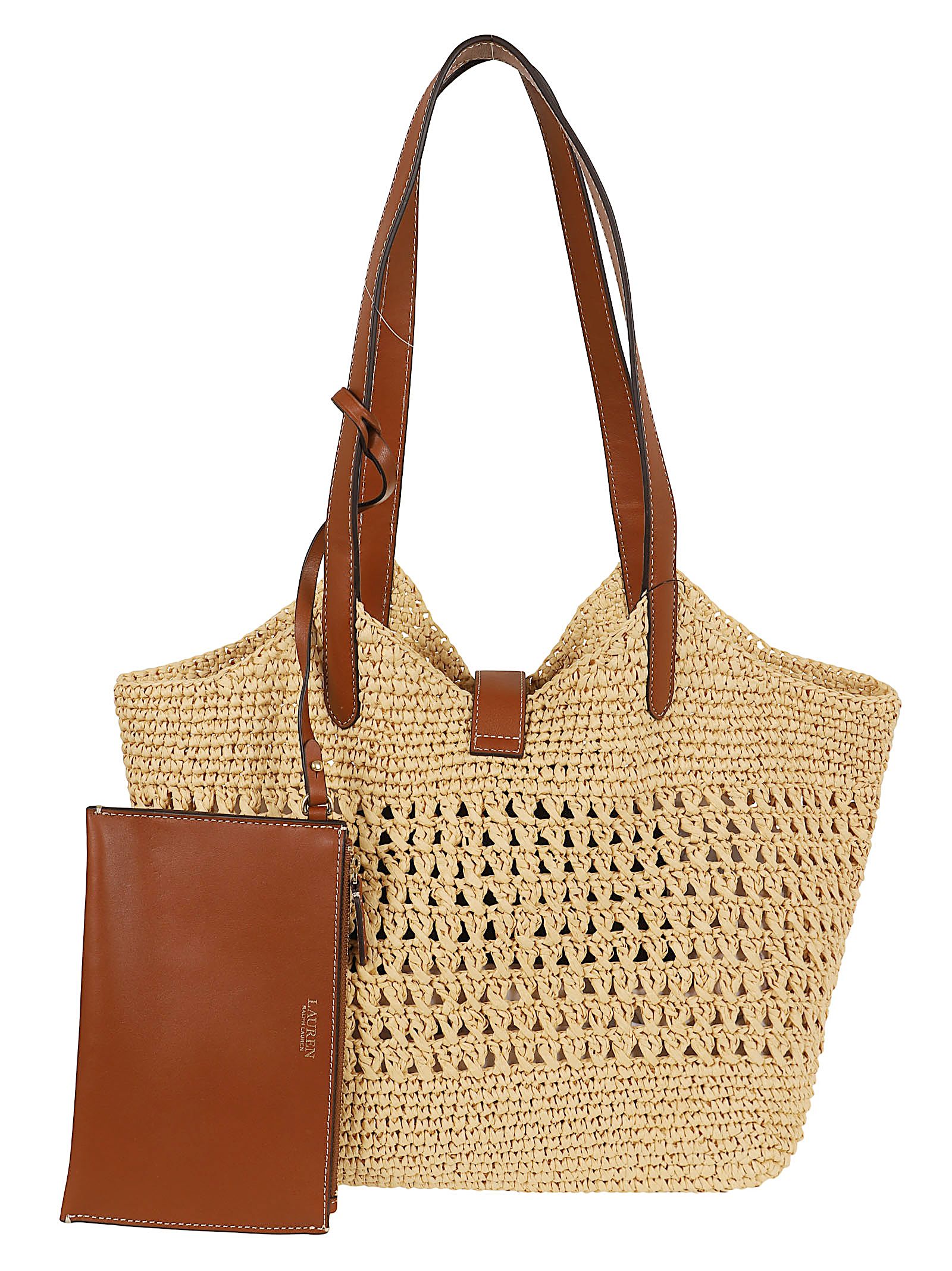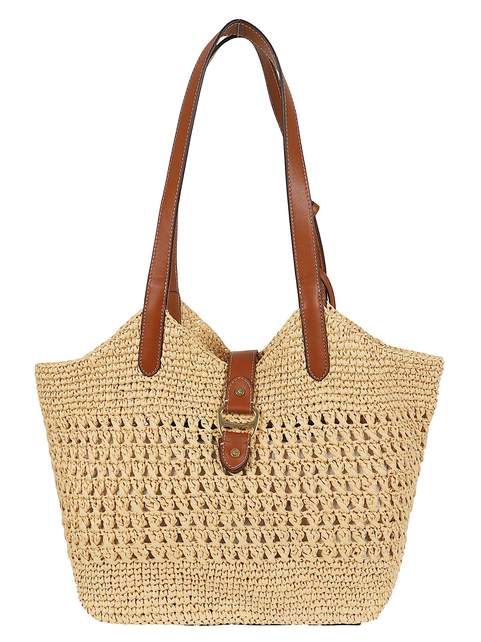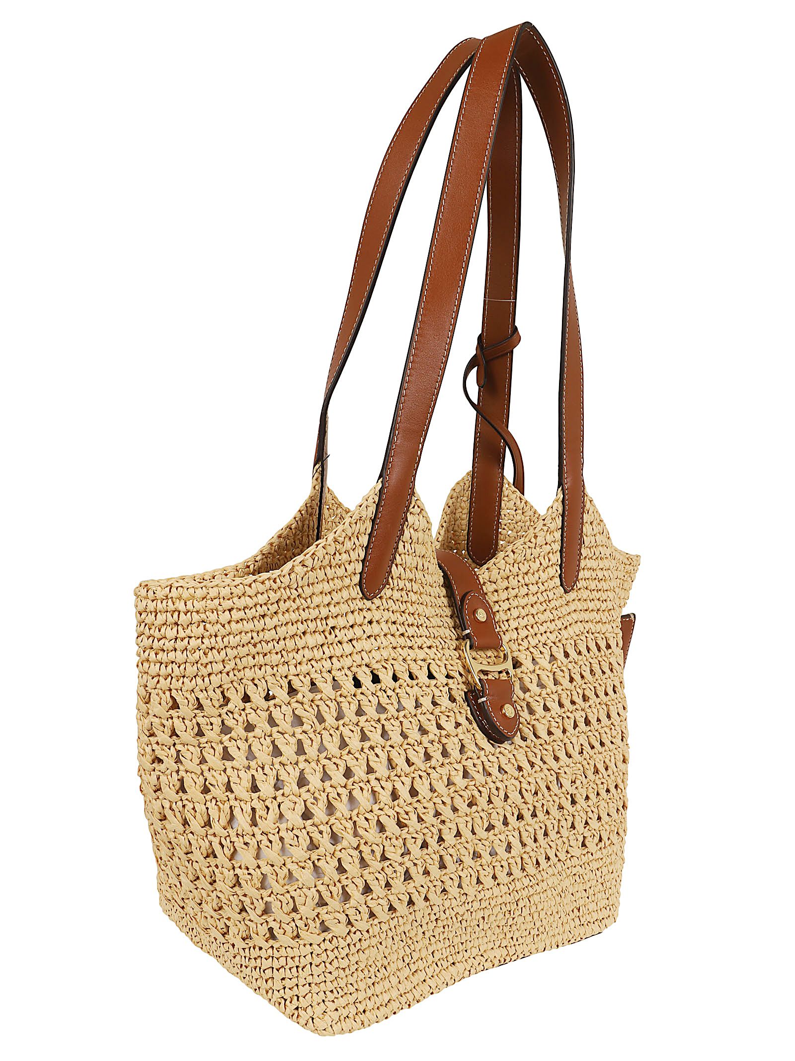 Shopper realizzata in paglia intrecciata a mano con dettagli in pelle. Presenta una silhouette all`uncinetto con una trama traforata e manici in pelle marrone.Dispone di un cinturino frontale in pelle con chiusura a gancio o magnetica e finiture in ottone.