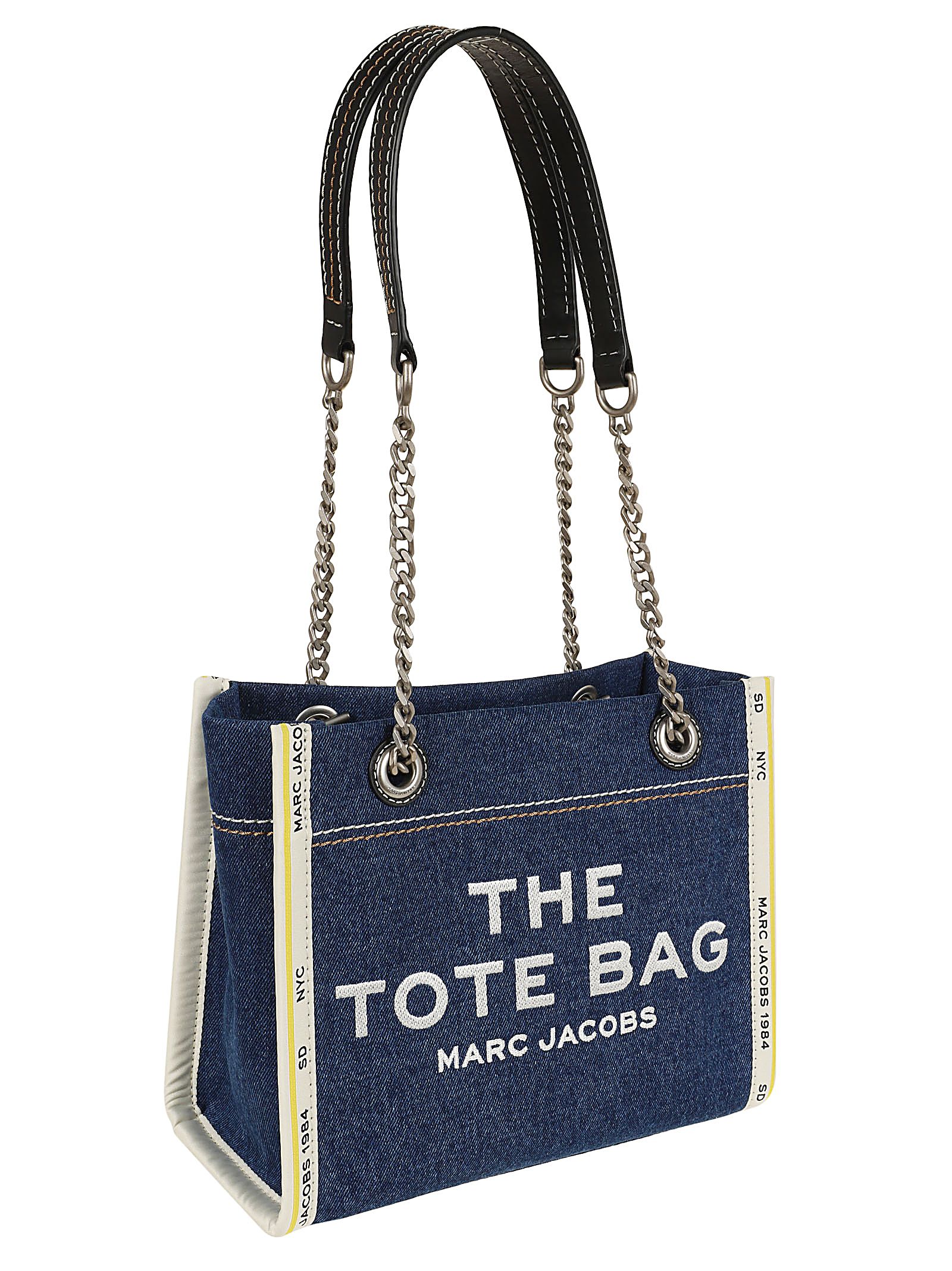 THE SMALL TOTE in denim strutturato BY MARC JACOBS.Chiusura superiore con cerniera; tracolla a catena rialzata con dettagli di protezione in pelle.Caratterizzata ed impreziosita da ricamato con logo a contrasto nella parte frontale.