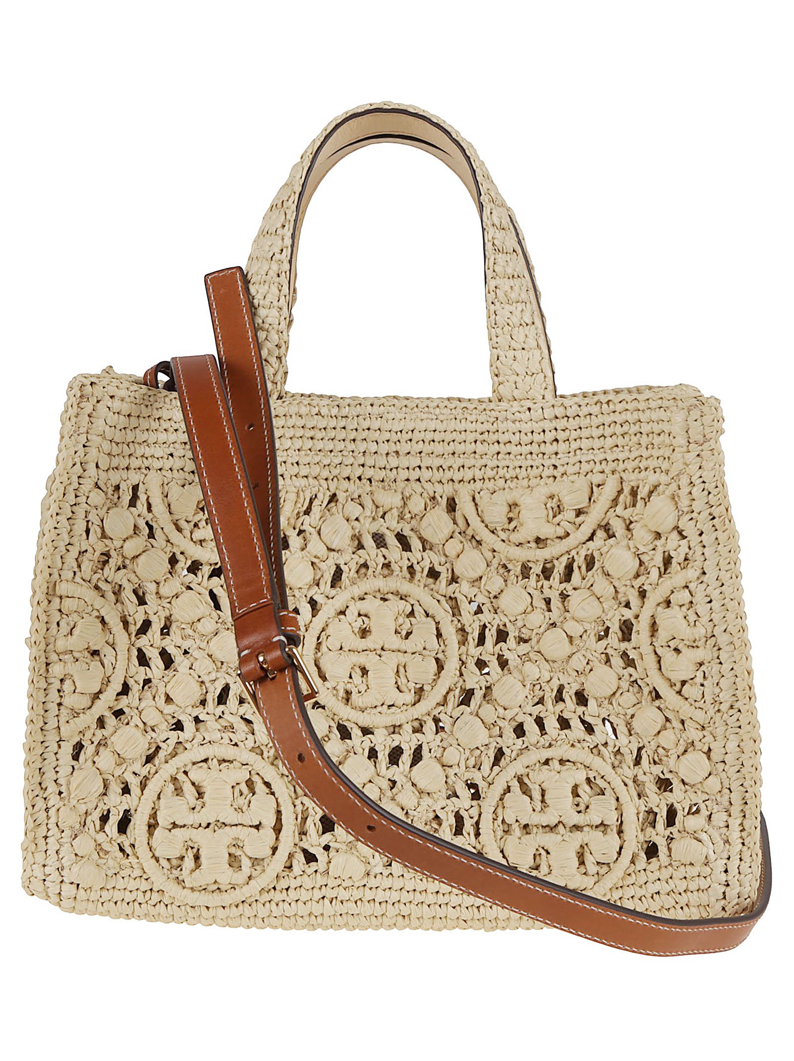 Shopping T Monogram in rafia naturale intrecciata a mano e rifinita in pelle raffinata di TORY BURCH.Tasca interna rimovibile con zip; chiusura magnetica; manici superiori e tracolla regolabile e rimovibile.