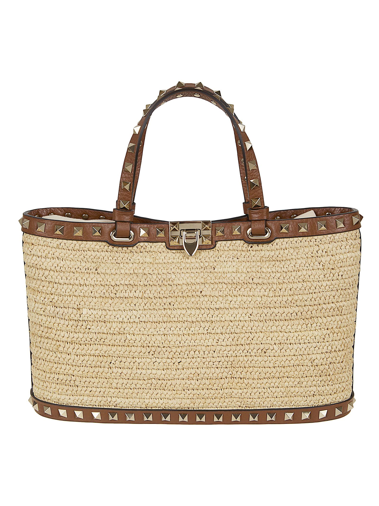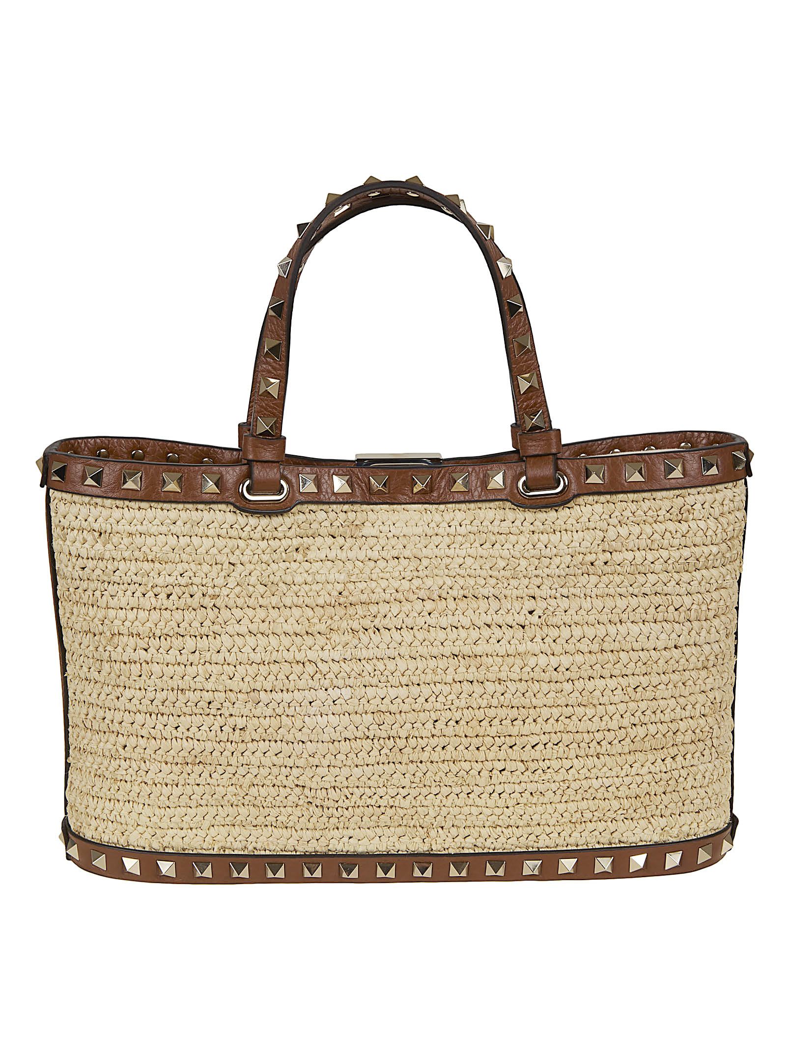 Small borsa shopping Rockstud in rafia naturale e profili in pelle di VALENTINO GARAVANI.Interno: fodera in nappa; due vani porta carte. Chiusura a gancio; può essere indossata a spalla/cross-body o a mano grazie ai manici e alla catena (55cm) amovibile.Caratterizzata da Rockstud lungo i profili.