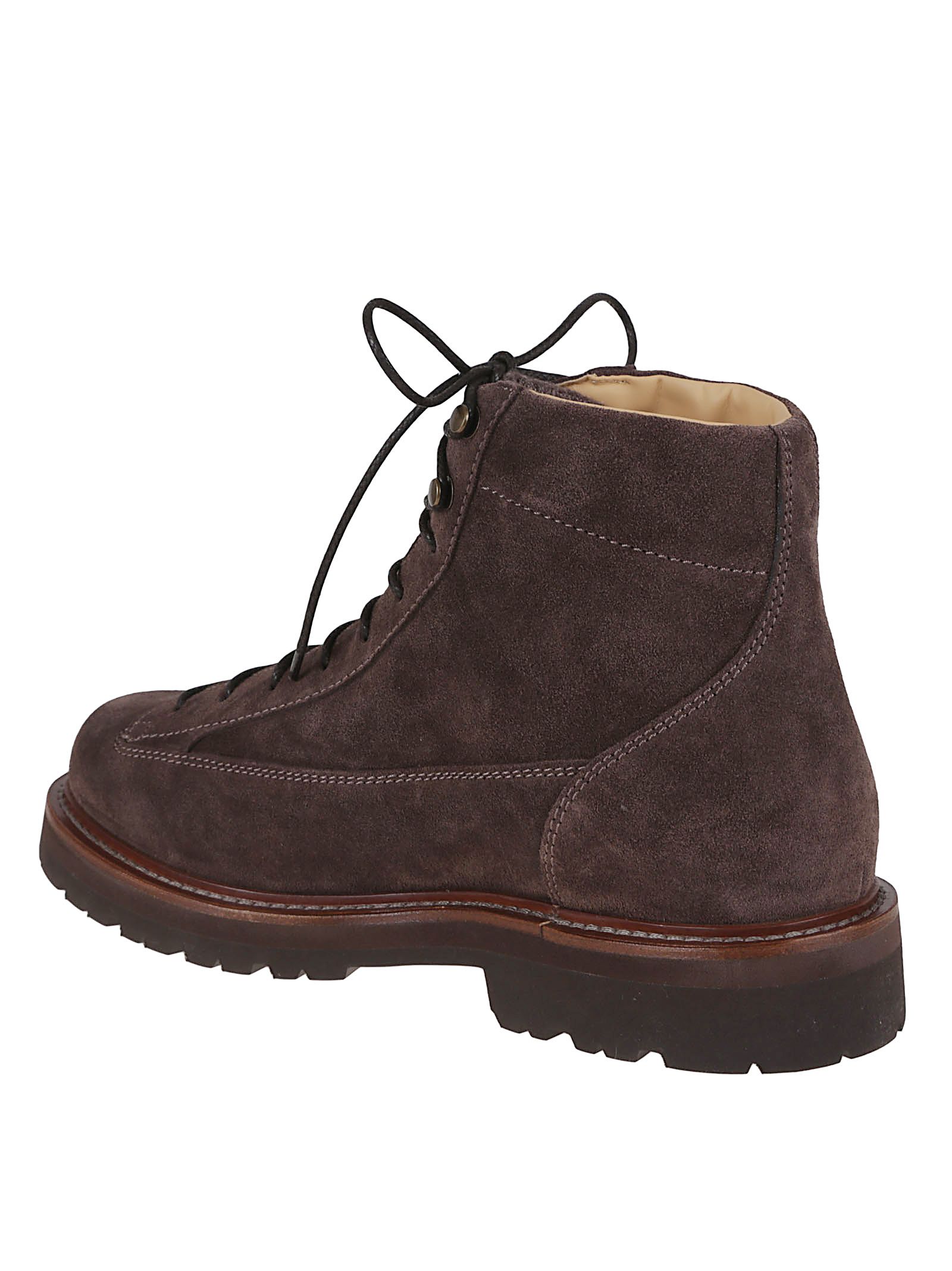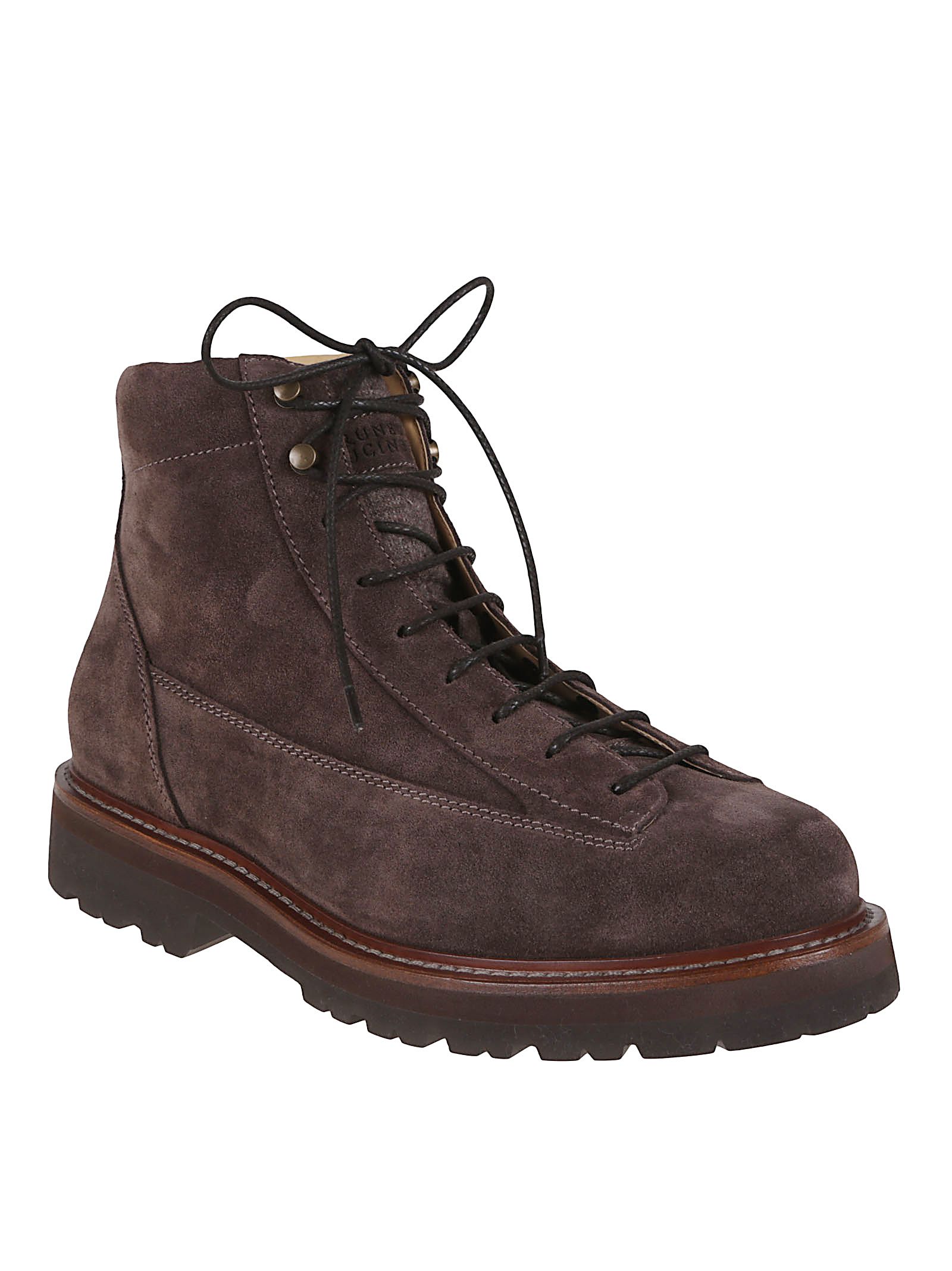 Boot Urban Outdoor in consistenza vellutata del camoscio di BRUNELLO CUCINELLI.Chiusura con lacci tondi in tessuto cerato; fodera in pelle e fondo in gomma.Caratterizzato da colorazione intensa e profonda grazie al particolare finissaggio cerato e contrasto con la linguetta in gessato bottonato di seta, lana e cashmere.