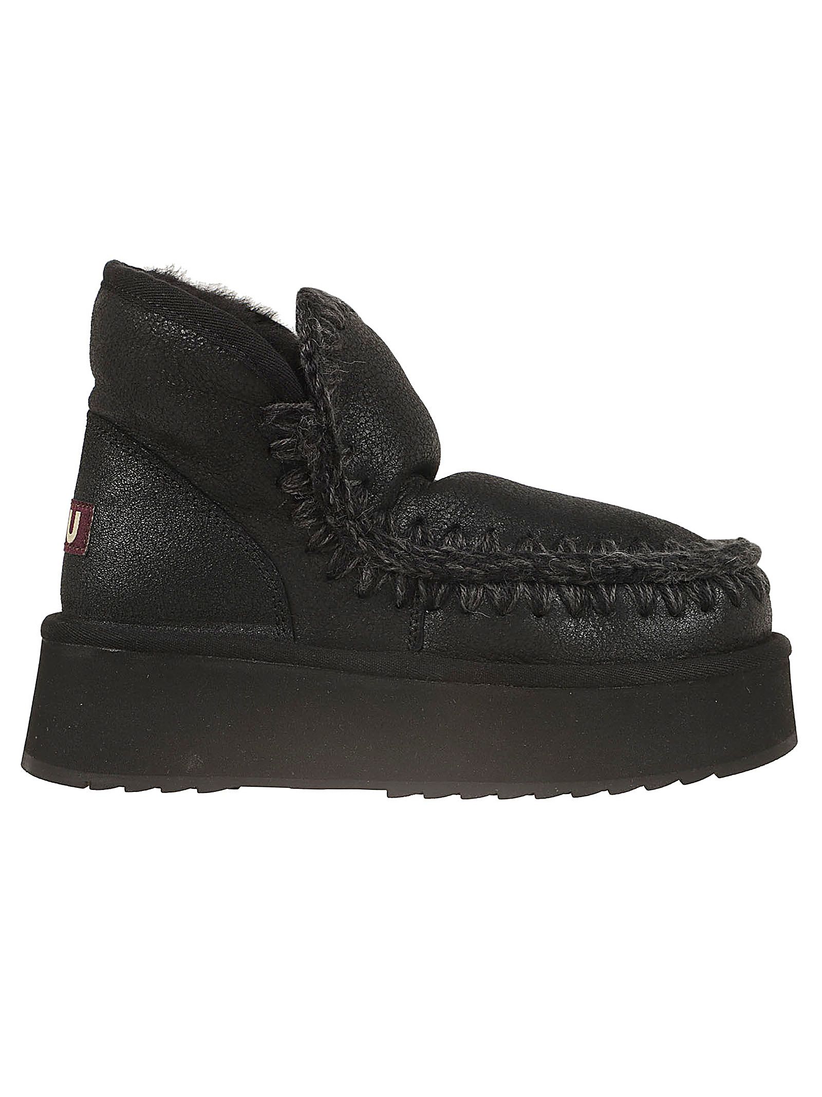 Stile slip-on alla caviglia, realizzata in pelle scamosciata, toppa con logo sul retro, rifiniture con impunture a vista, punta rotonda, soletta con marchio, suola con plateau, fodera in montone.