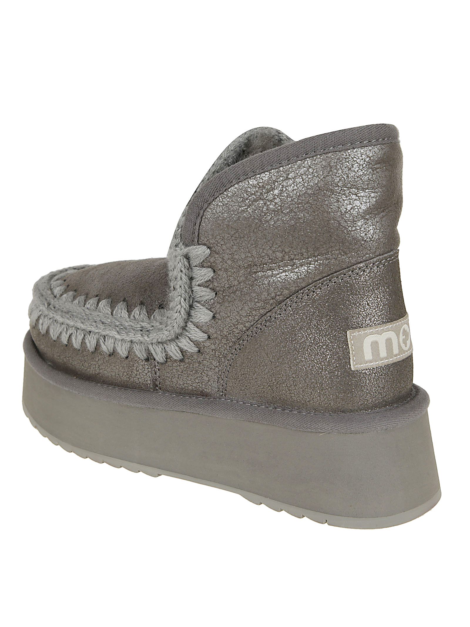 Stivale Mini Eskimo Platform di MOU.Realizzati in pelle di ovina scamosciata con impunture a vista realizzate a mano, caratterizzato da suola flatform da 50 mm, toppa con logo sul retro, punta tonda fodera in montone suola in gomma.