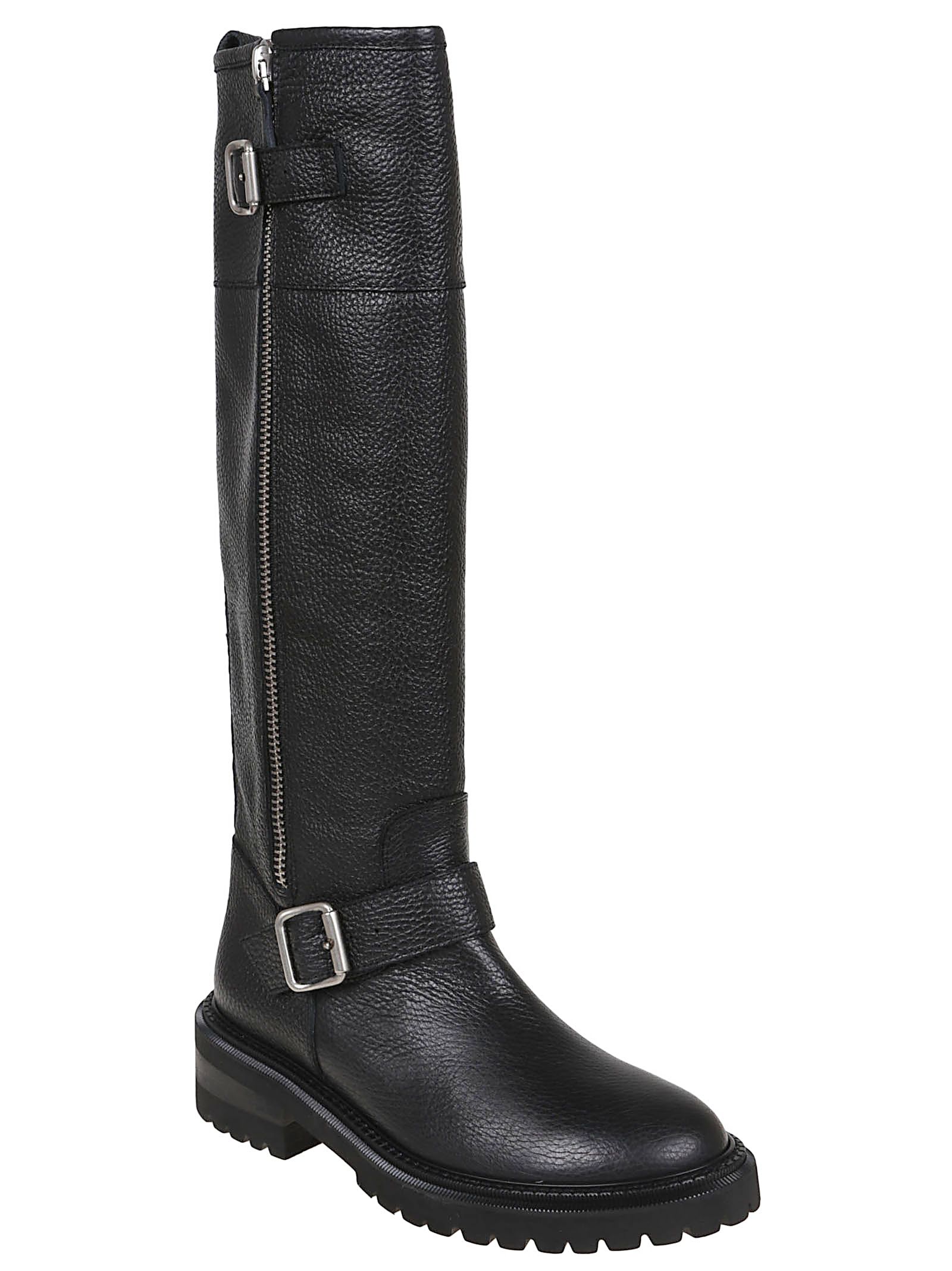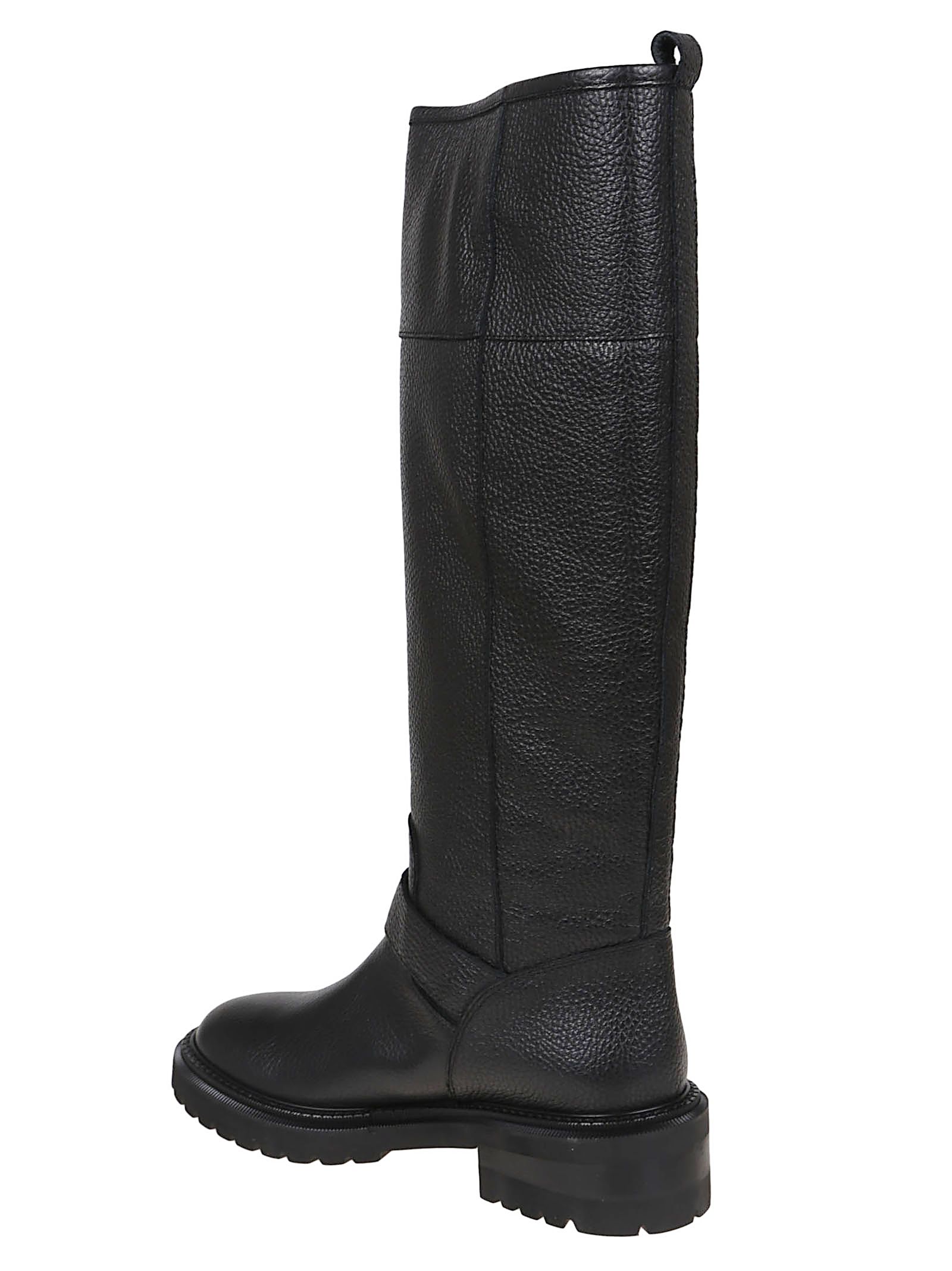 "Stivale in pelle nera con zip laterale, dettaglio di fibbia, punta rotonda, soletta con marchio e suola in gomma."