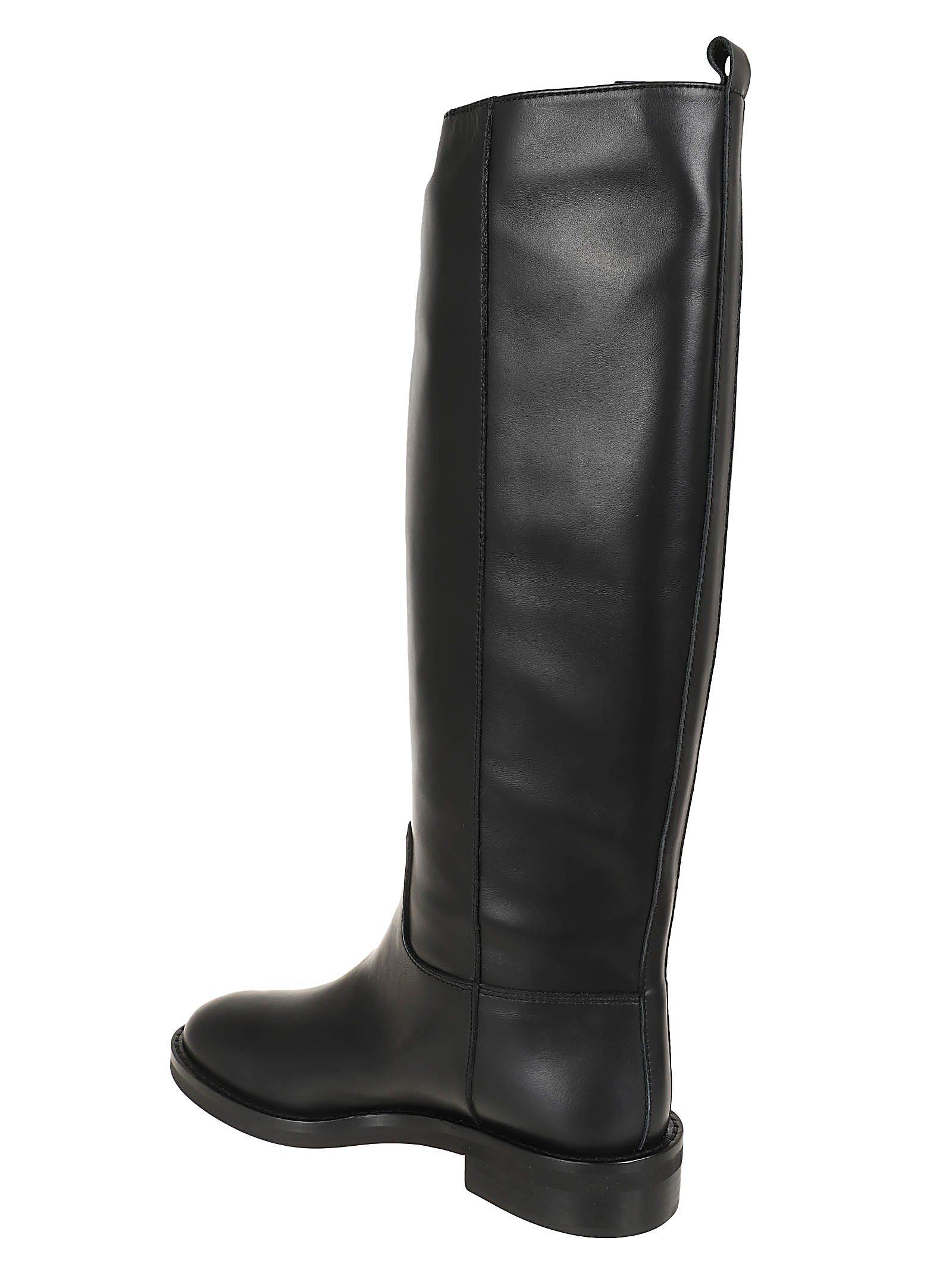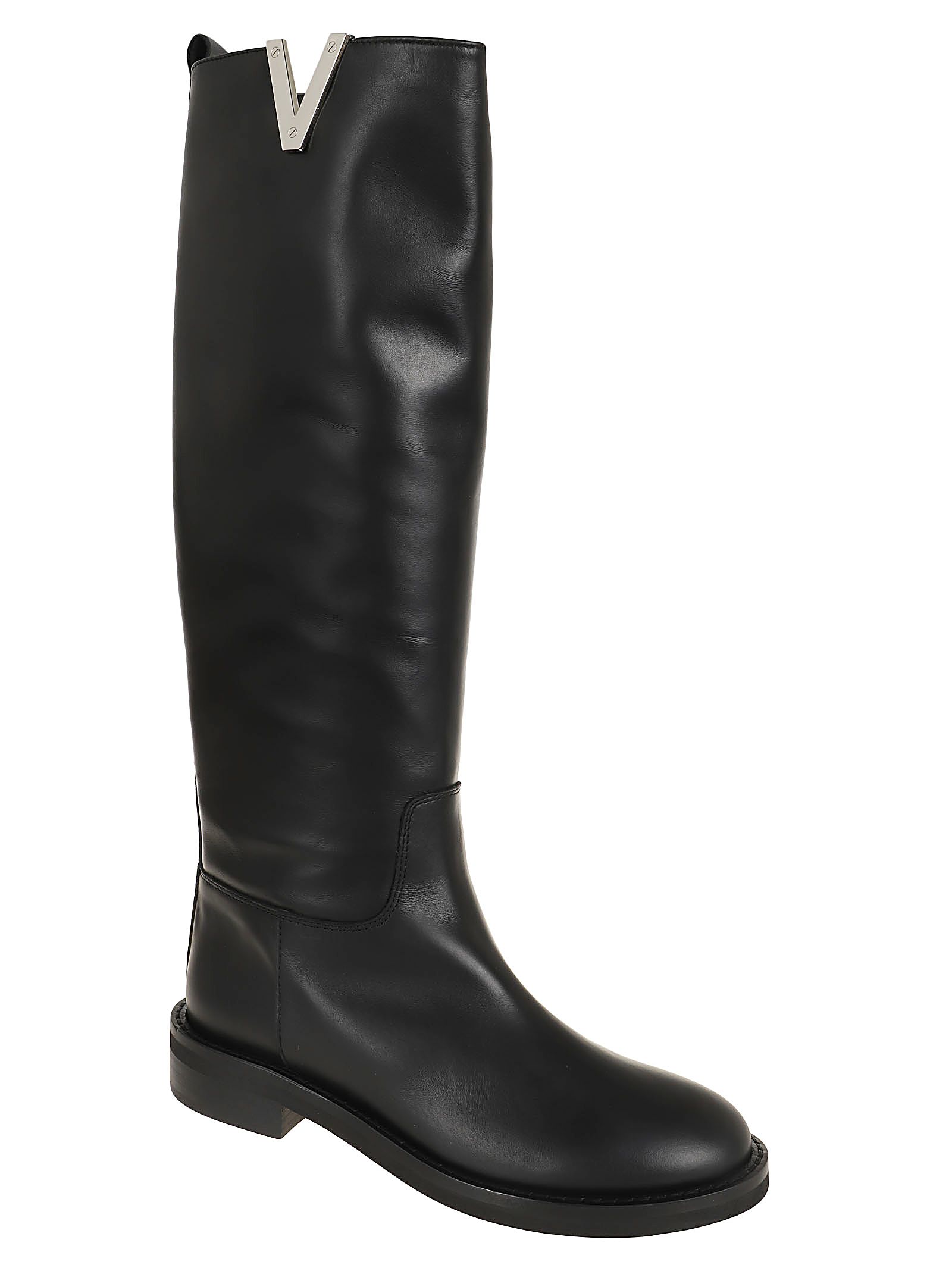 Stivale al ginocchio in pelle di vitello nera a grana liscia, caratterizzato da placca decorativa in metallo color argento e linguetta in pelle, punta tonda,Suola in gomma. Made in Italy.