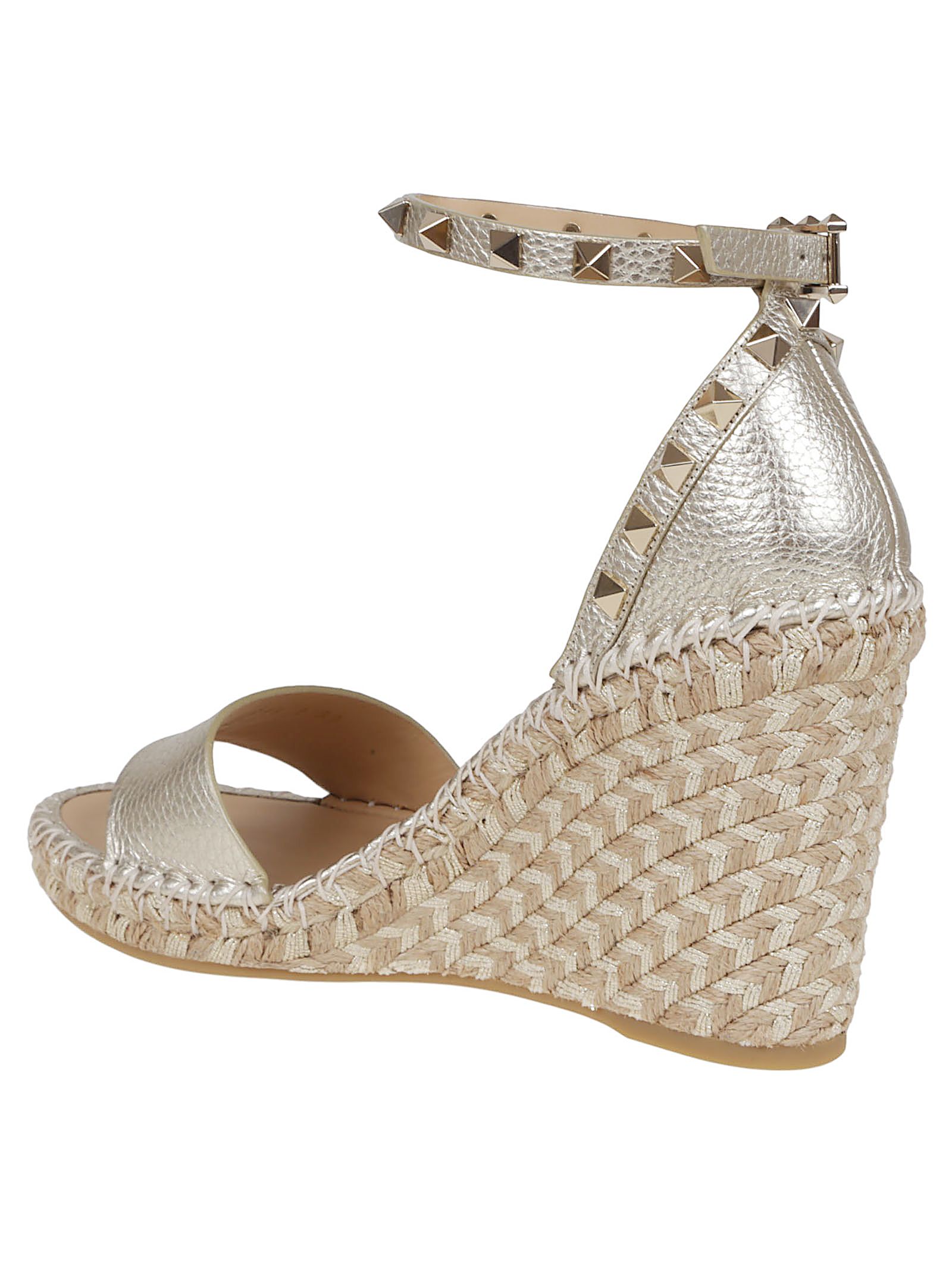 Zeppa Rockstud Double in pelle di vitello stampa Alce di VALENTINO GARAVANI. Chiusura con cinturino alla caviglia tono su tono, impreziosita da borchie color platino. Caratterizzata da zeppa ricoperta in corda.