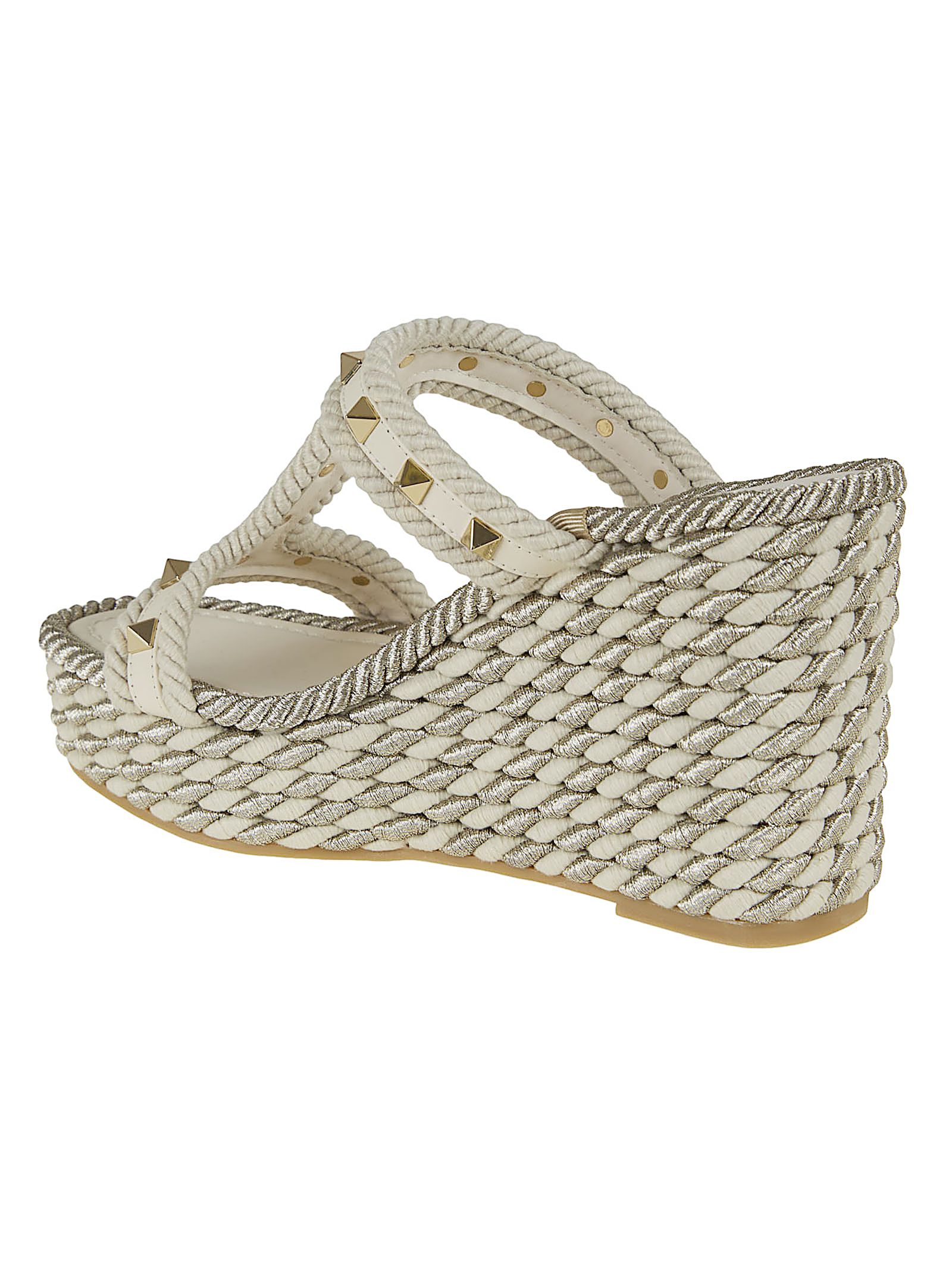 Zeppa Rockstud in pelle di vitello di VALENTINO GARAVANI.Caratterizzata da zeppa fasciata con torchon di seta e filo metallizzato come sulla fascia del piede, impreziosita da borchie.