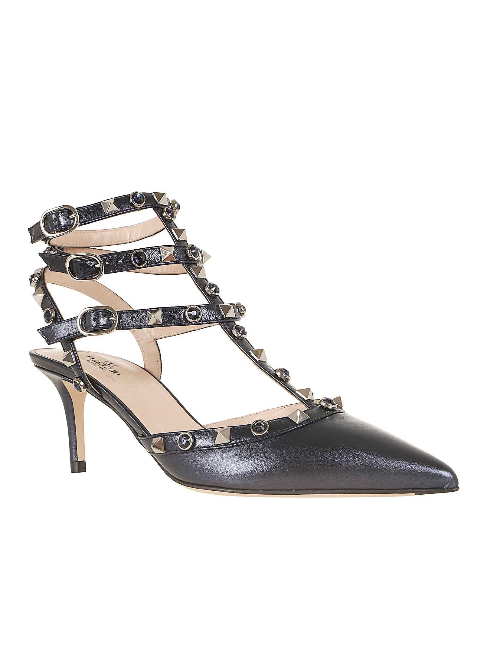 Caratterizzato da una silhouette a punta con cinturini multipli a gabbia che avvolgono la caviglia, decorati con le celebri borchie piramidali del marchio.