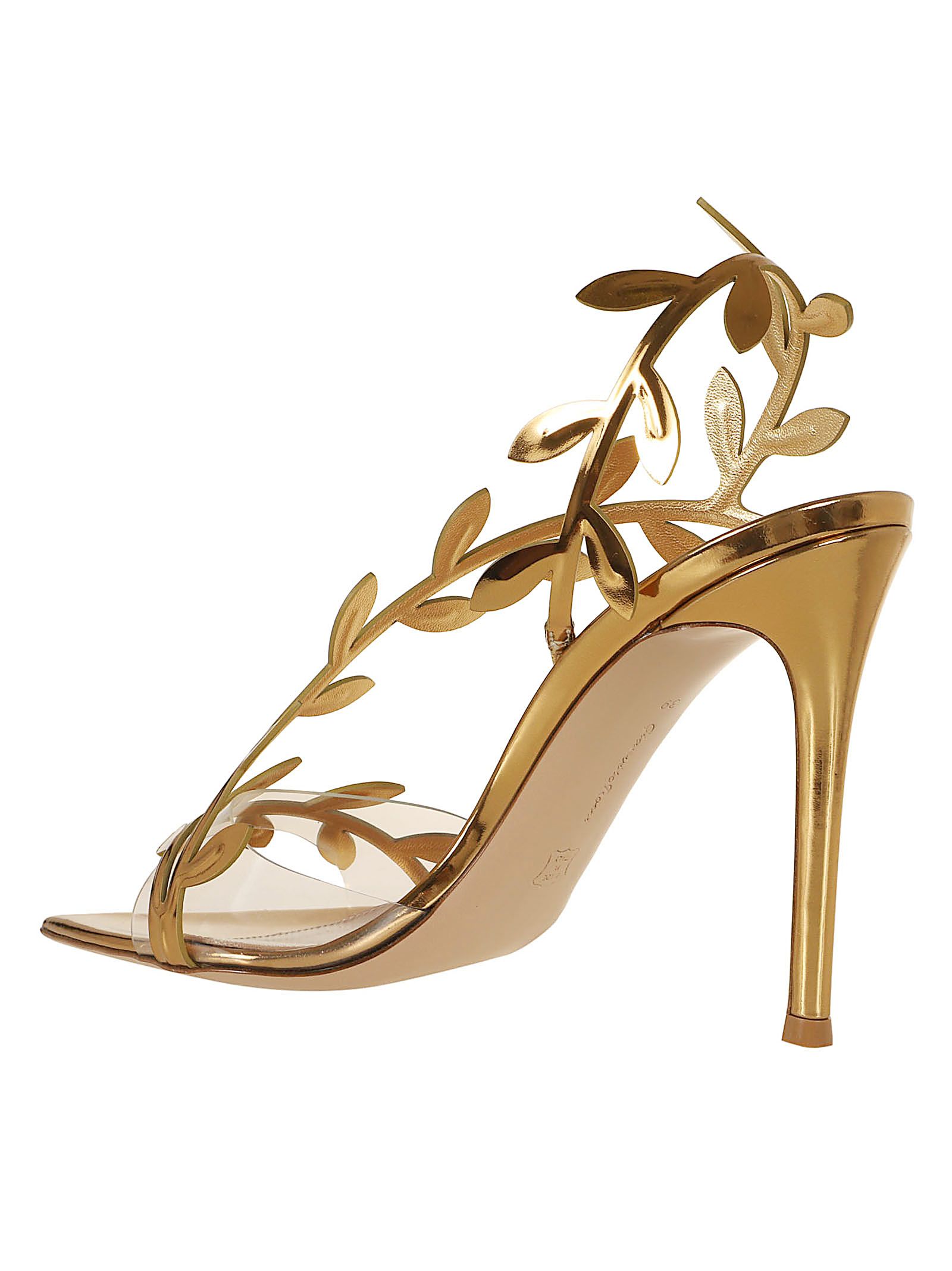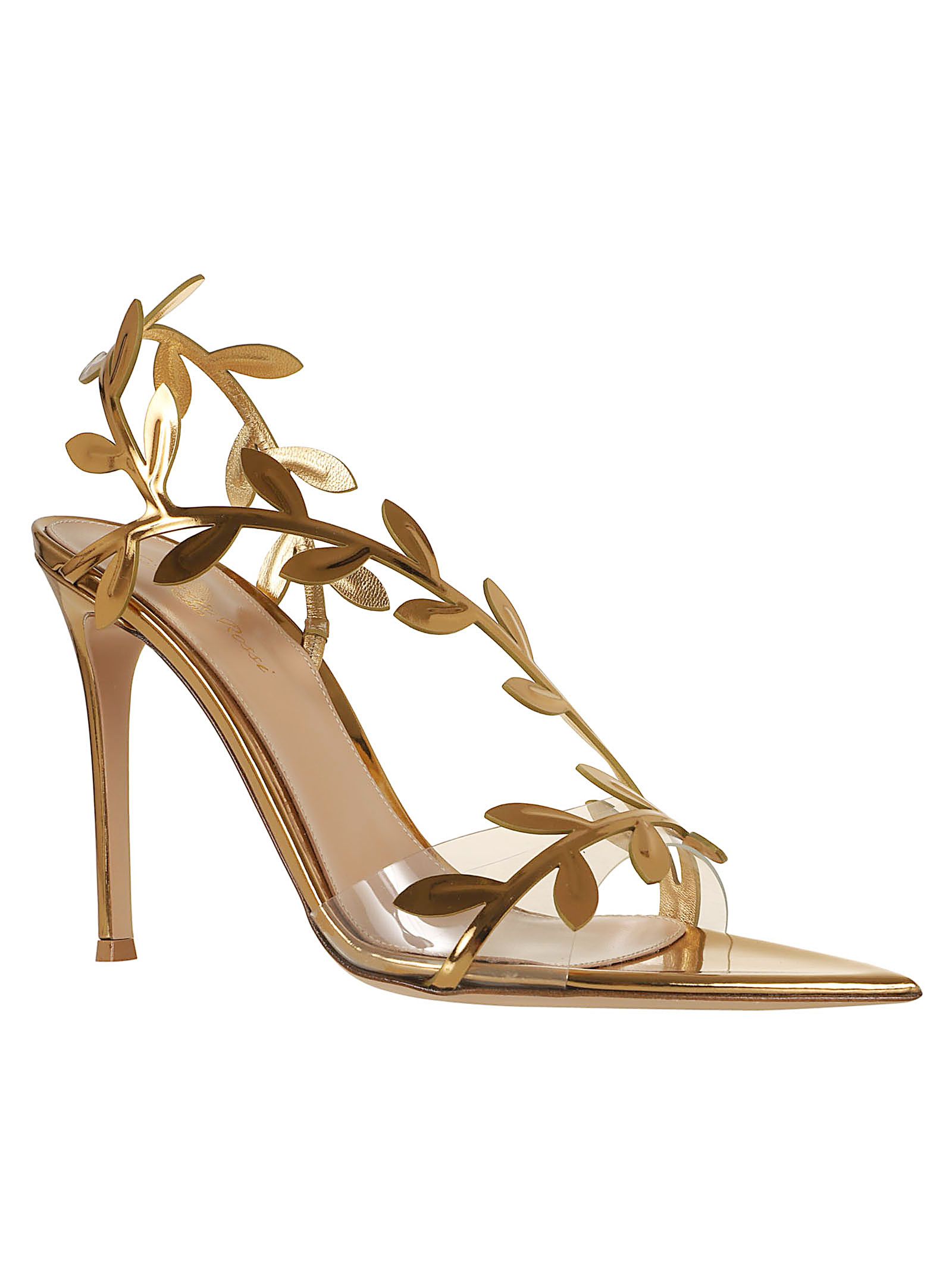 Modello Flavia di Gianvito Rossi, una calzatura di lusso caratterizzata da un elegante motivo a foglie rampicanti.