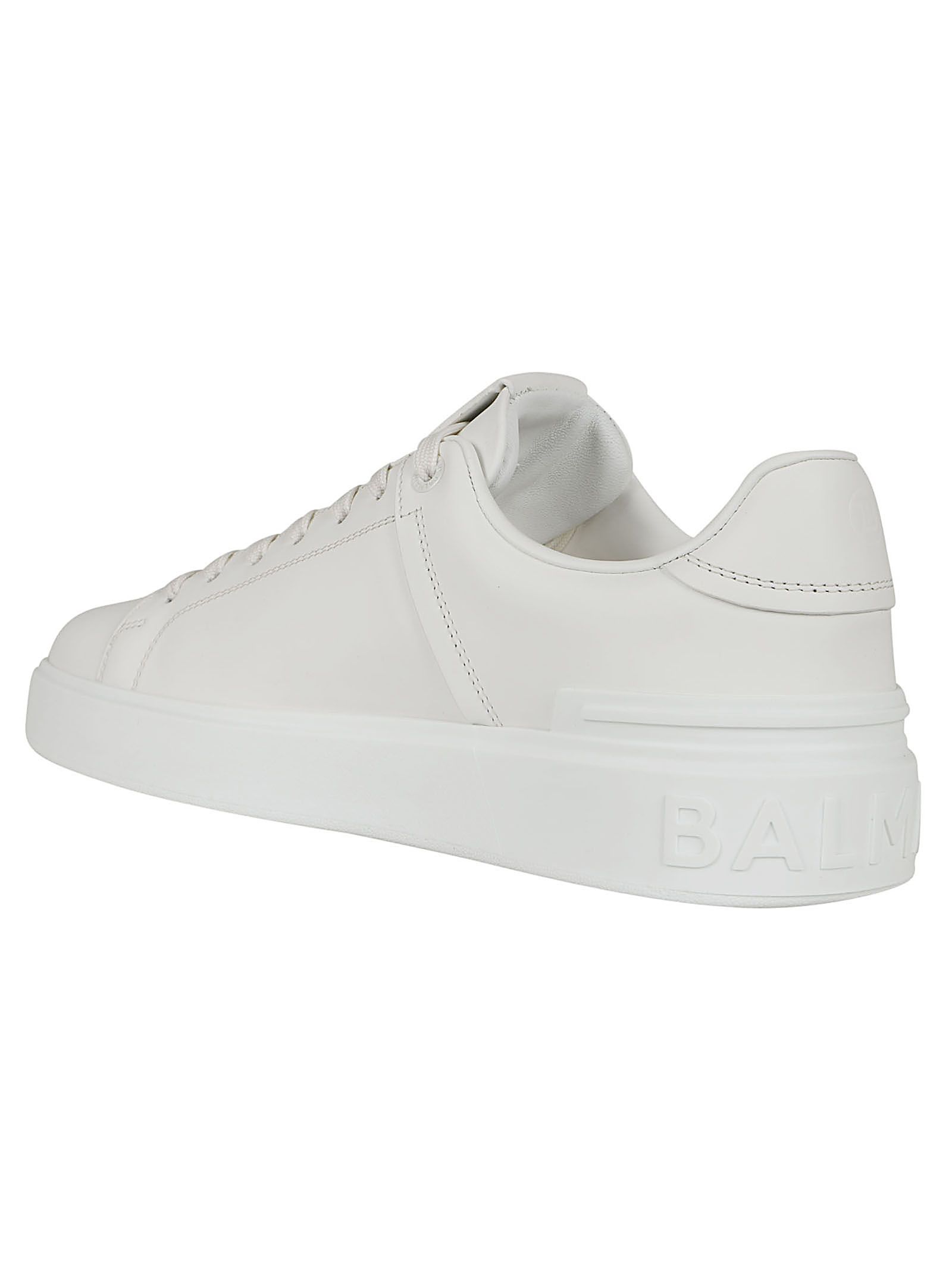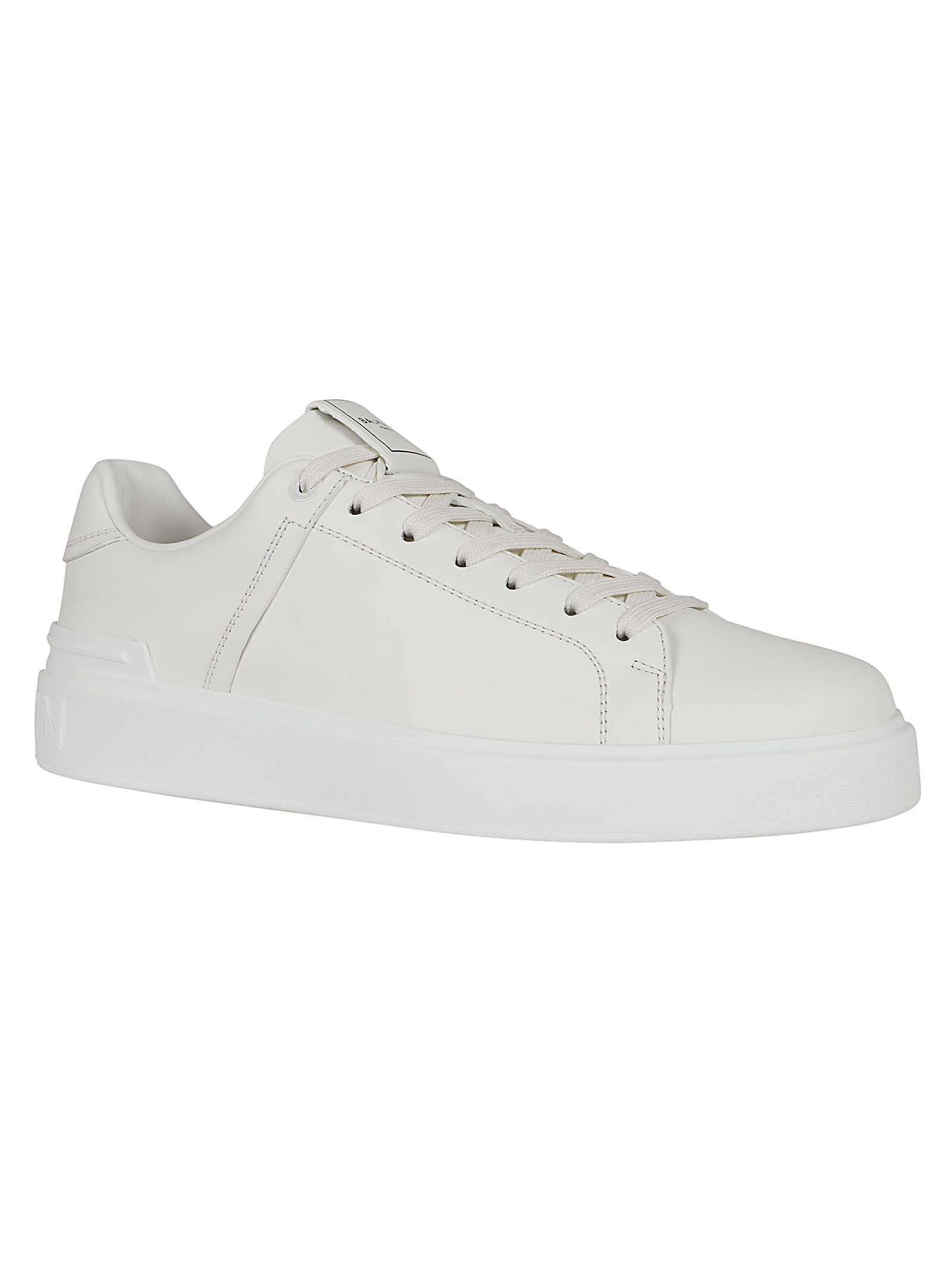 Sneakers B-Court in pelle di Balmain caratterizzate da pelle di agnello bianca, toppa con logo sulla linguetta, chiusura frontale con bottoni, soletta con marchio, punta smussata, logo in rilievo sul retro e suola piatta in gomma.