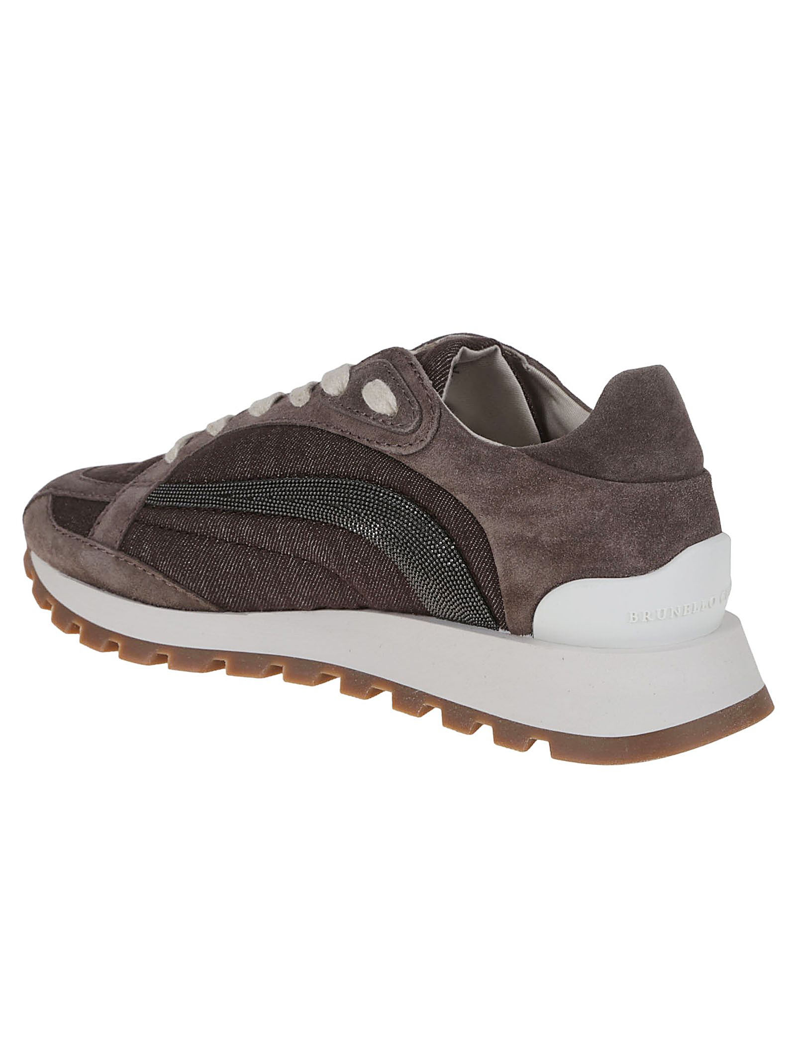 Runners in camoscio di BRUNELLO CUCINELLI.Texture vellutata; chiusura con lacci piatti in cotone; fodera in shearling e fondo in gomma TPU.Caratterizzata ed impreziosita da prezioso elemento brillante che traccia una scia laterale.