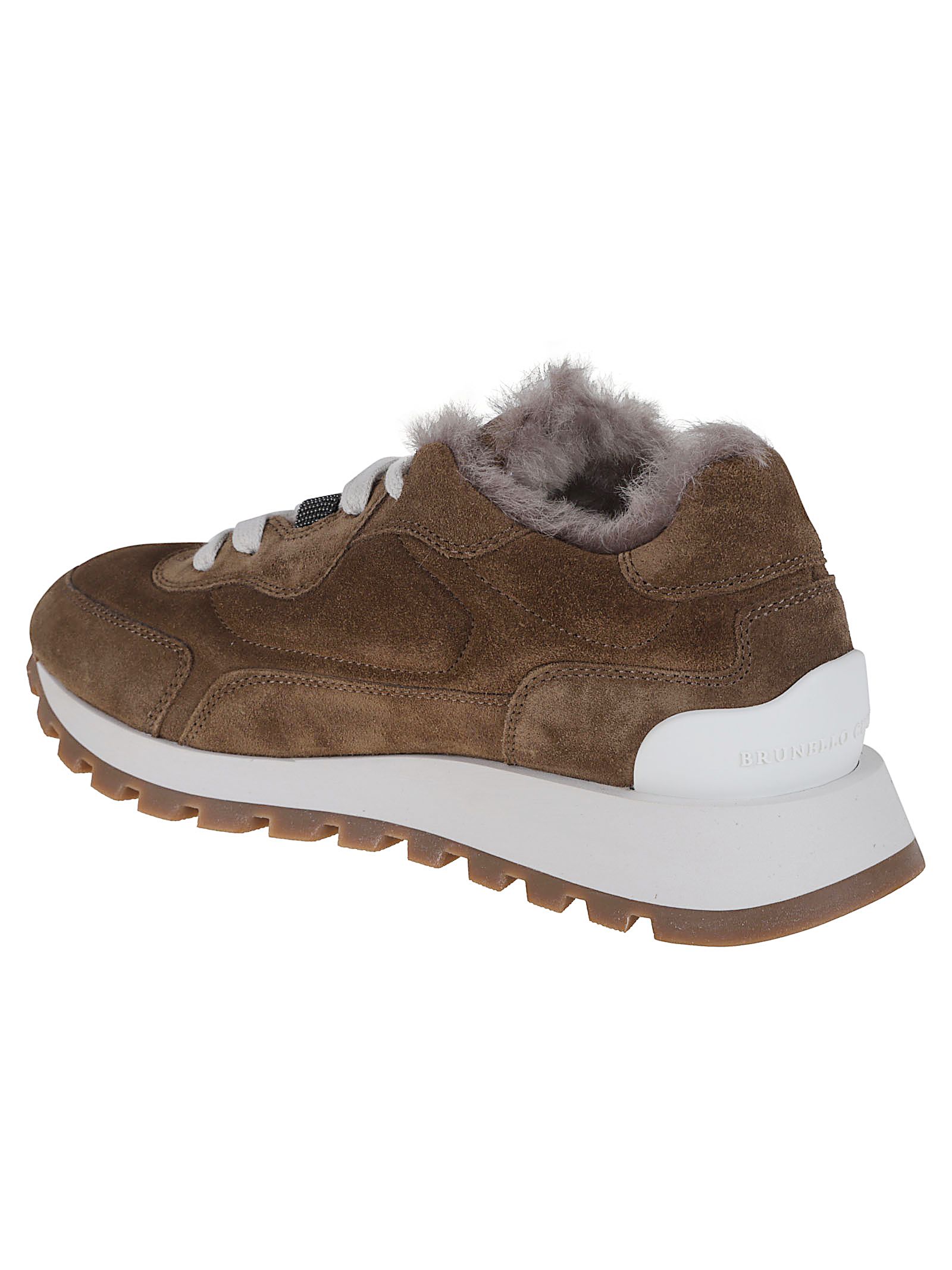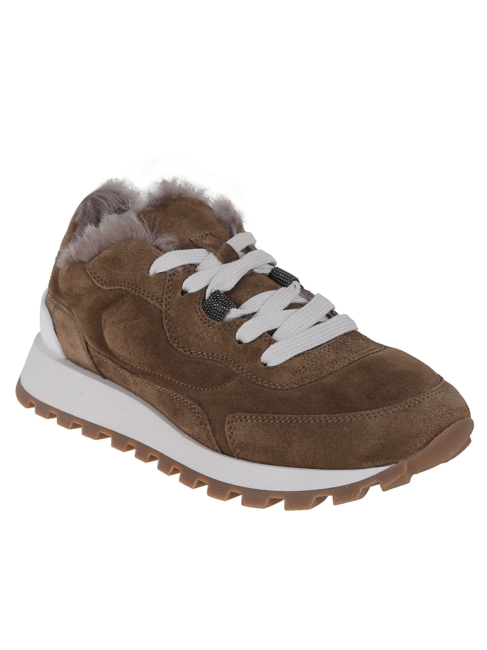 Sneakers in vellutato camoscio di BRUNELLO CUCINELLI.Chiusura con lacci piatti in cotone; soletta estraibile e suola in micro leggero.Caratterizzata da decorazione in monile Nickel-free e fodera in soffice shearling.