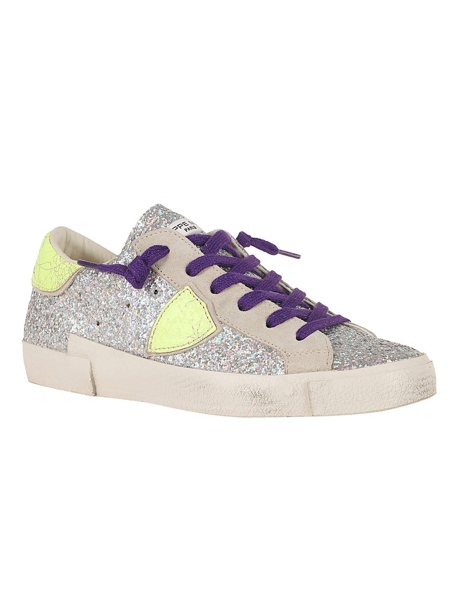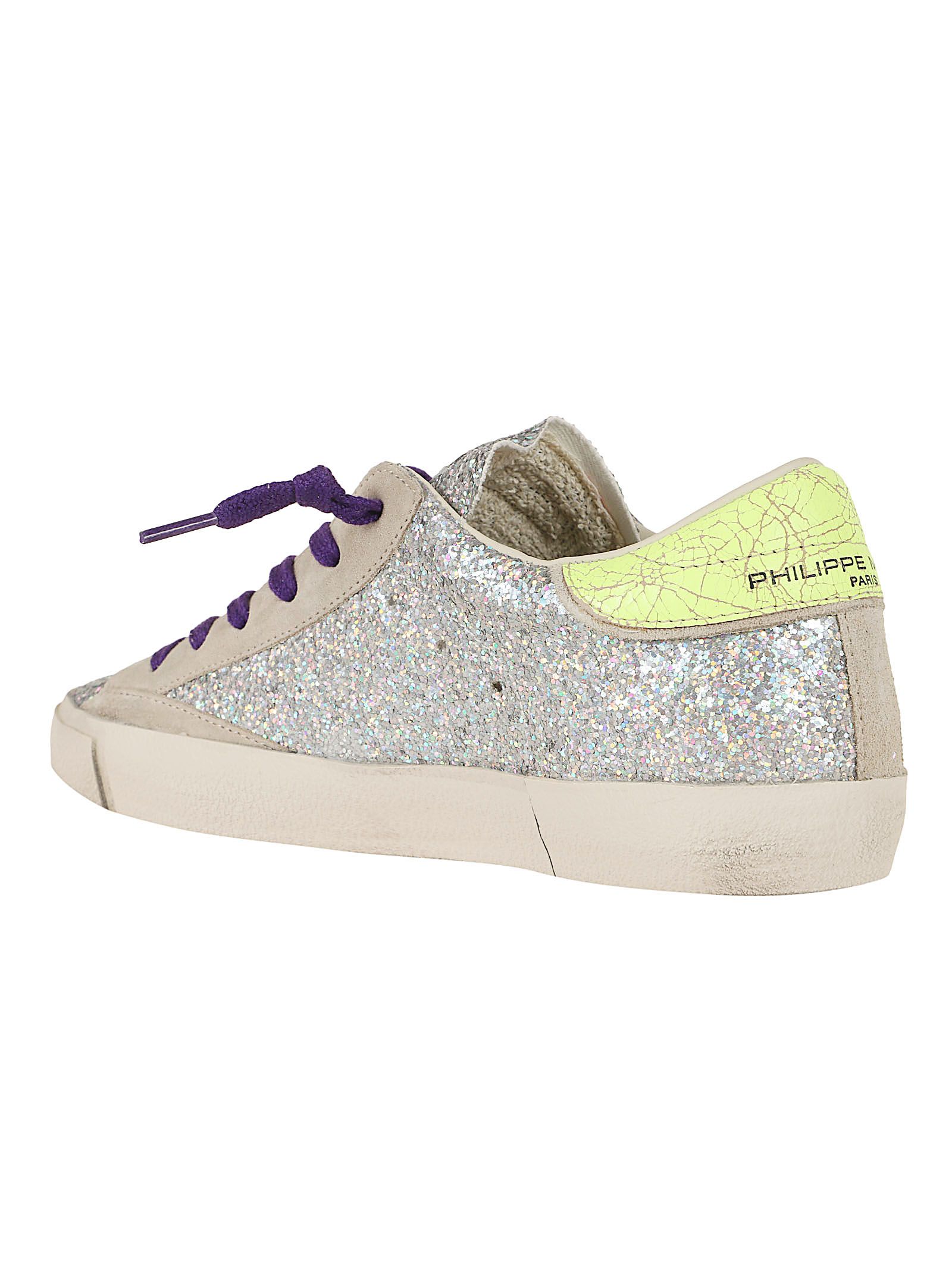 Queste sneakers ono caratterizzate da una tomaia interamente ricoperta di glitter argento, con passalacci in suede beige e accenti in giallo neon sullo scudetto laterale e sul talloncino. I lacci viola aggiungono un contrasto vivace al design.