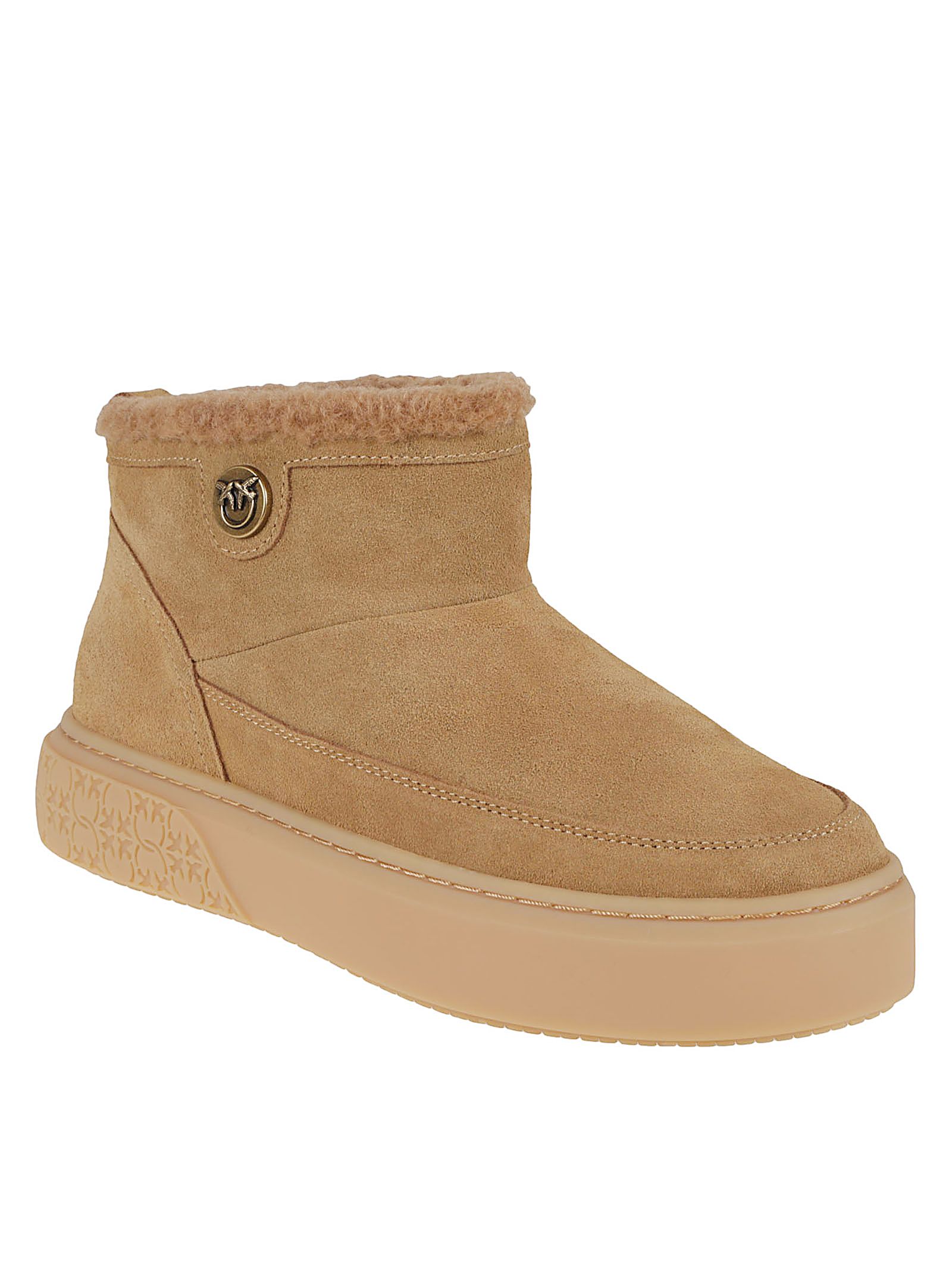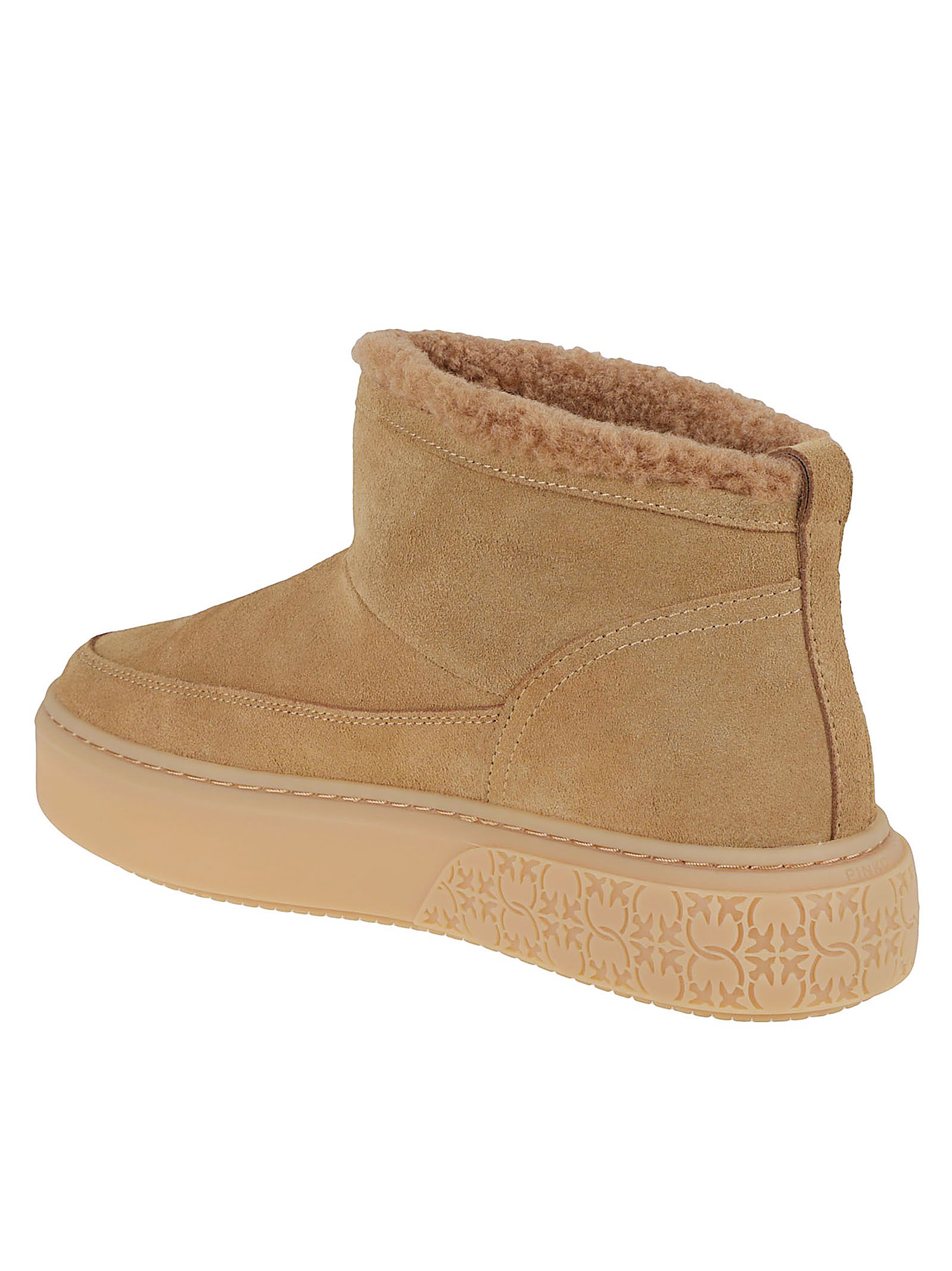 "suede di cognac con applicazioni, dettaglio in pelliccia, suola piatta, suola decorata"