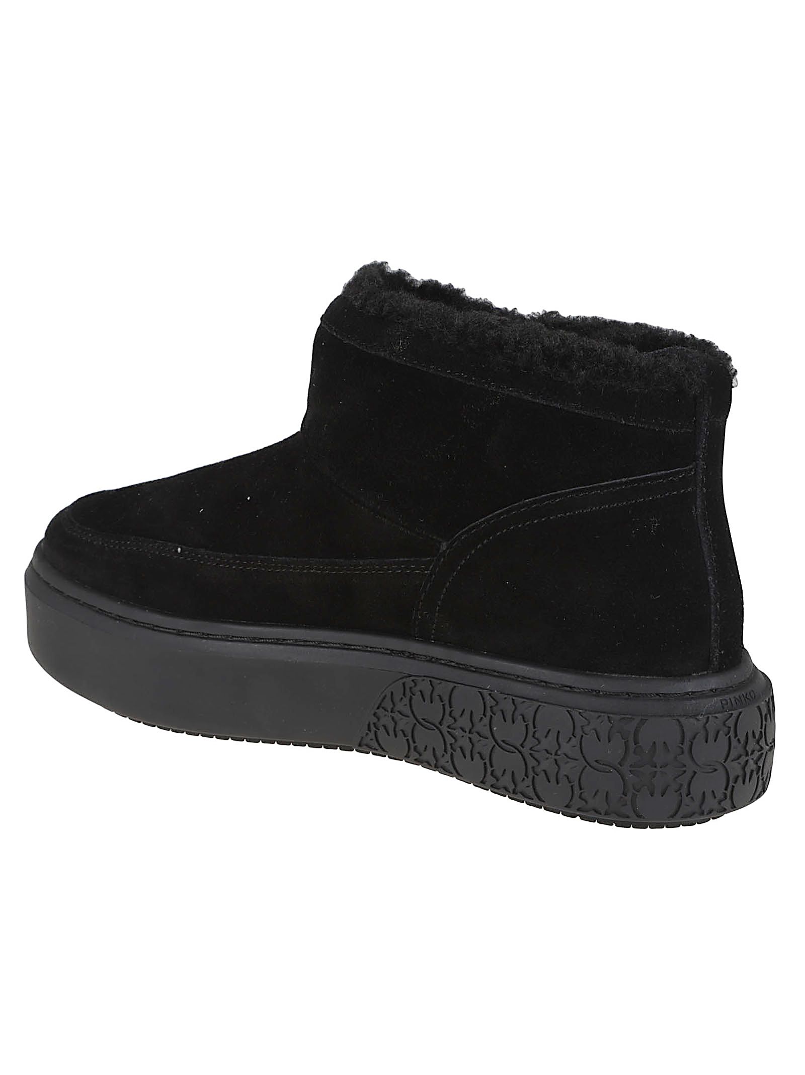 "suede nero con applicazioni, dettaglio in pelliccia, suola piatta, suola decorata