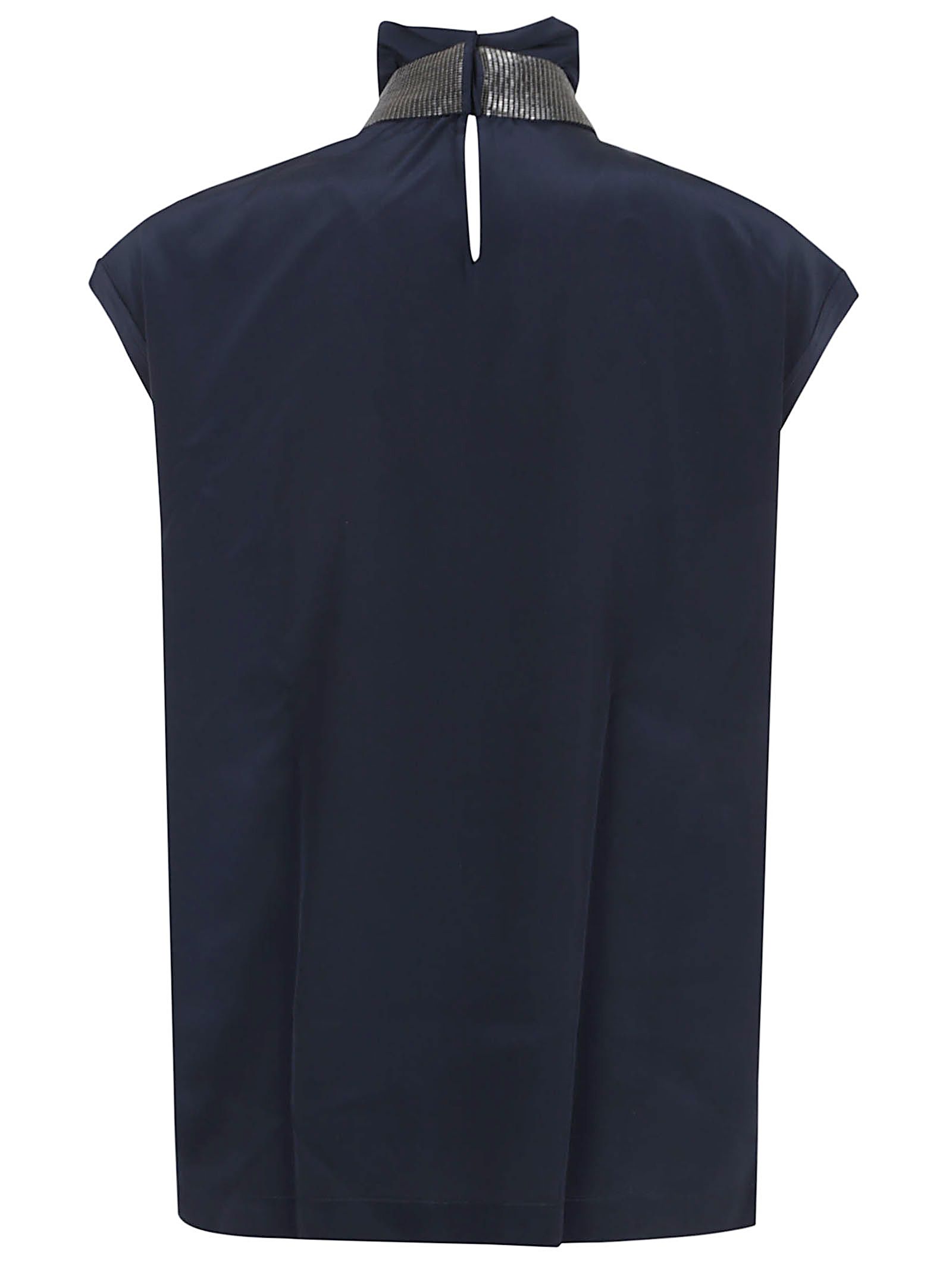 Top in crêpe de Chine di pura seta di BRUNELLO CUCINELLI.Collo alto; apertura a goccia con bottone dietro il collo; senza maniche; texture leggera e lievemente crespaImpreziosita da collana gioiello removibile, realizzata in preziose perline tubolari dall`effetto metallizzato.
