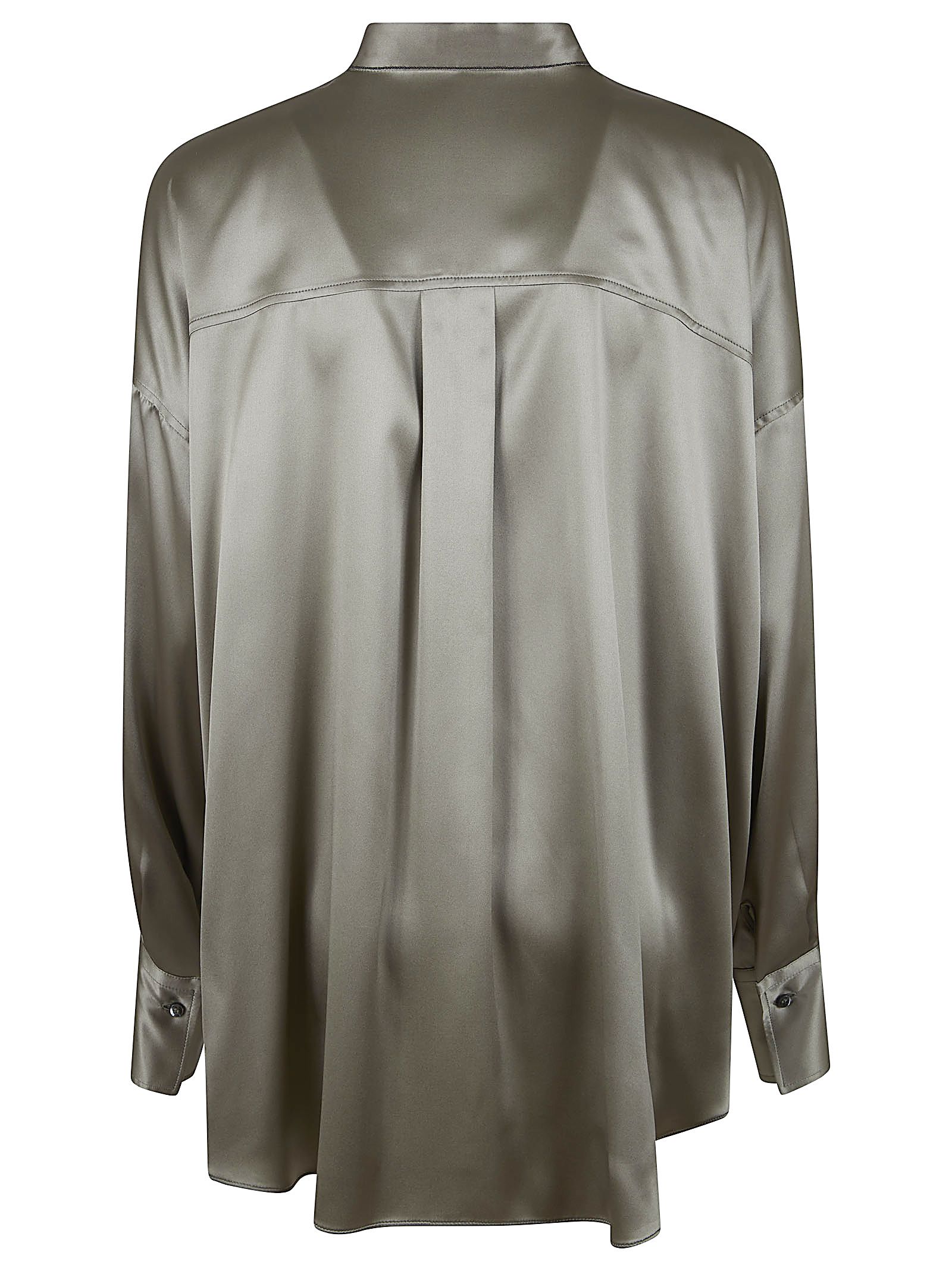 Camicia in raso di seta stretch di BRUNELLO CUCINELLI.Collo alla coreana; maniche lievemente ampie; chiusura con cannoncino e bottoni in madreperla come sui polsini; design vestibilità fluida e cangiante del tessuto che seguono le forme del corpo. Caratterizzata da brillante ricamo in monile dietro il collo.
