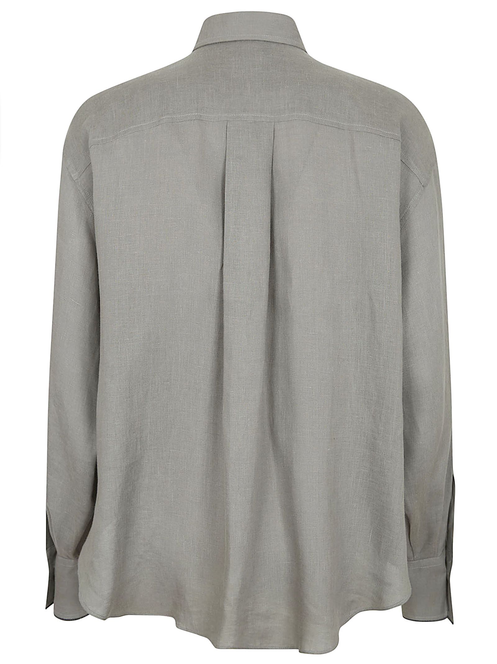 Camicia in puro lino di BRUNELLO CUCINELLI.Ispirato ai classici modelli maschili; colletto classico; chiusura con cannoncino e bottoni di madreperla, presenti anche sui polsini; maniche lievemente ampie.Impreziosita da decorazione in monile Nickel-free sui polsini.