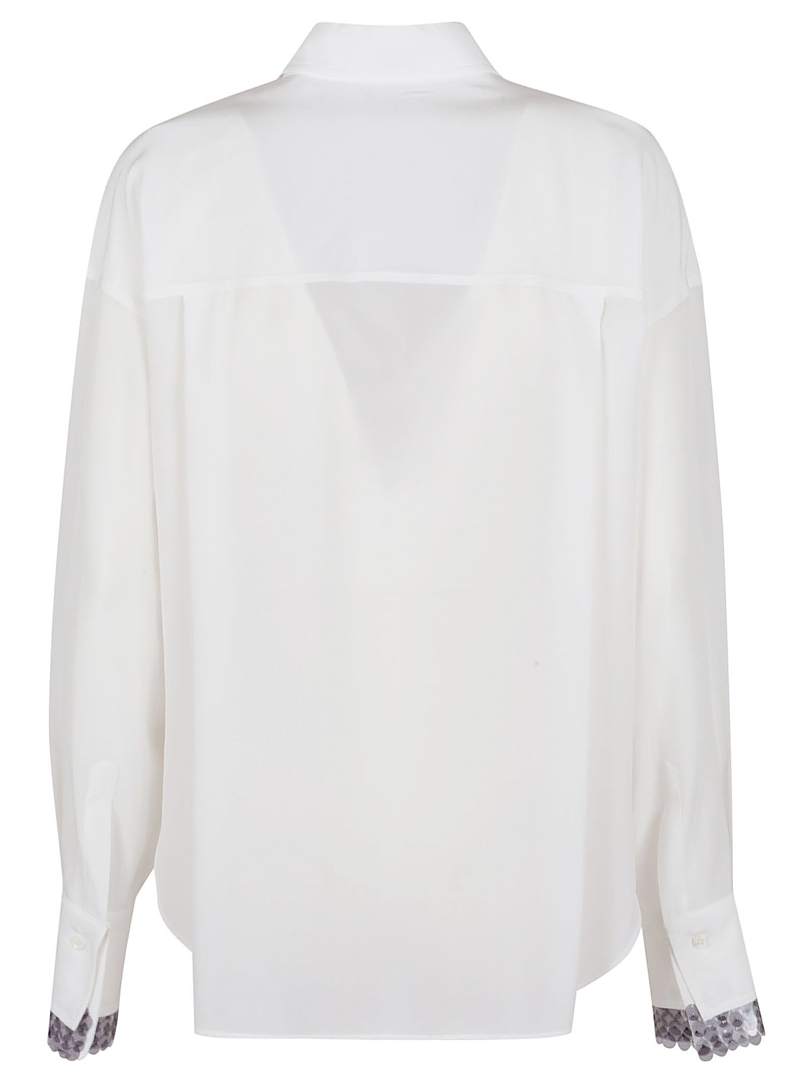 bianco seta maniche lunghe chiusura con bottoni polsini decorati con paillettes colletto classico