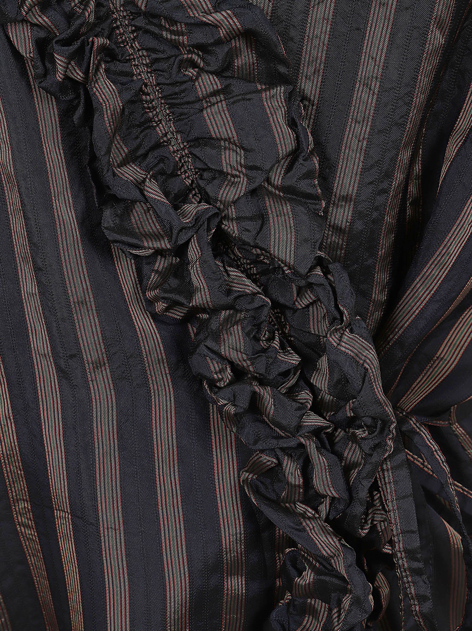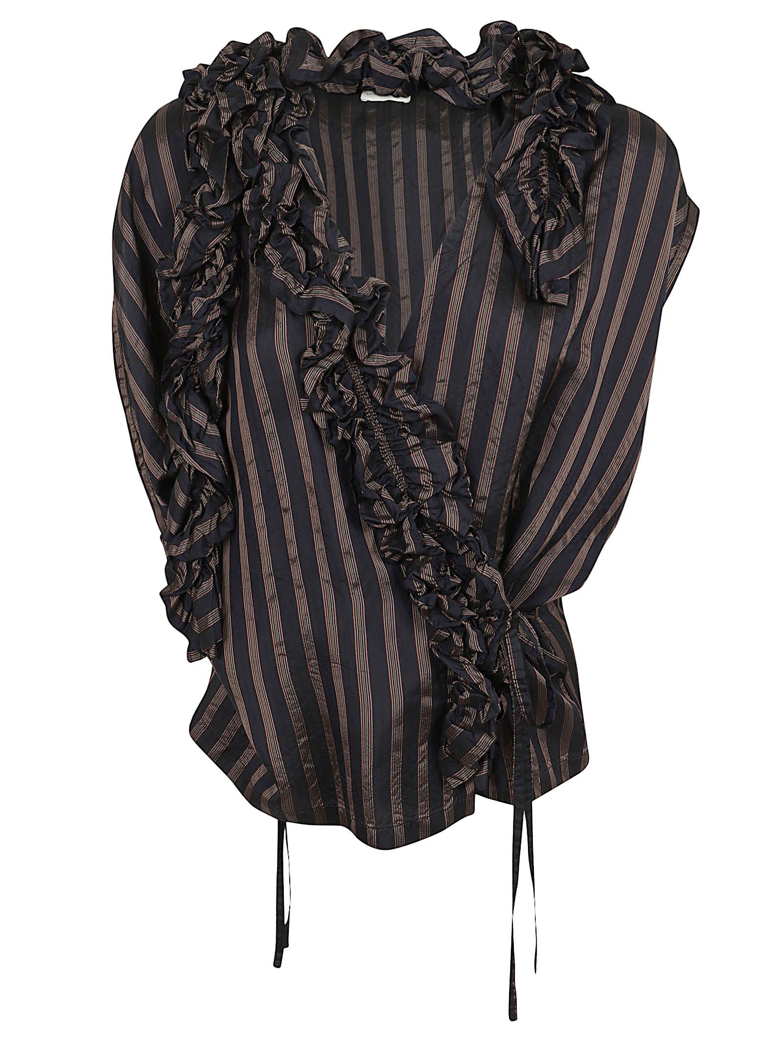 Top a righe caratterizzato da un design d`avanguardia con vistosi volant. Si tratta di una blusa a portafoglio con scollo a V e senza maniche.Presenta eleganti drappeggi e volant lungo la parte anteriore, completati da una chiusura laterale con lacci.Realizzata al 100% in cupro, un tessuto simile alla seta.