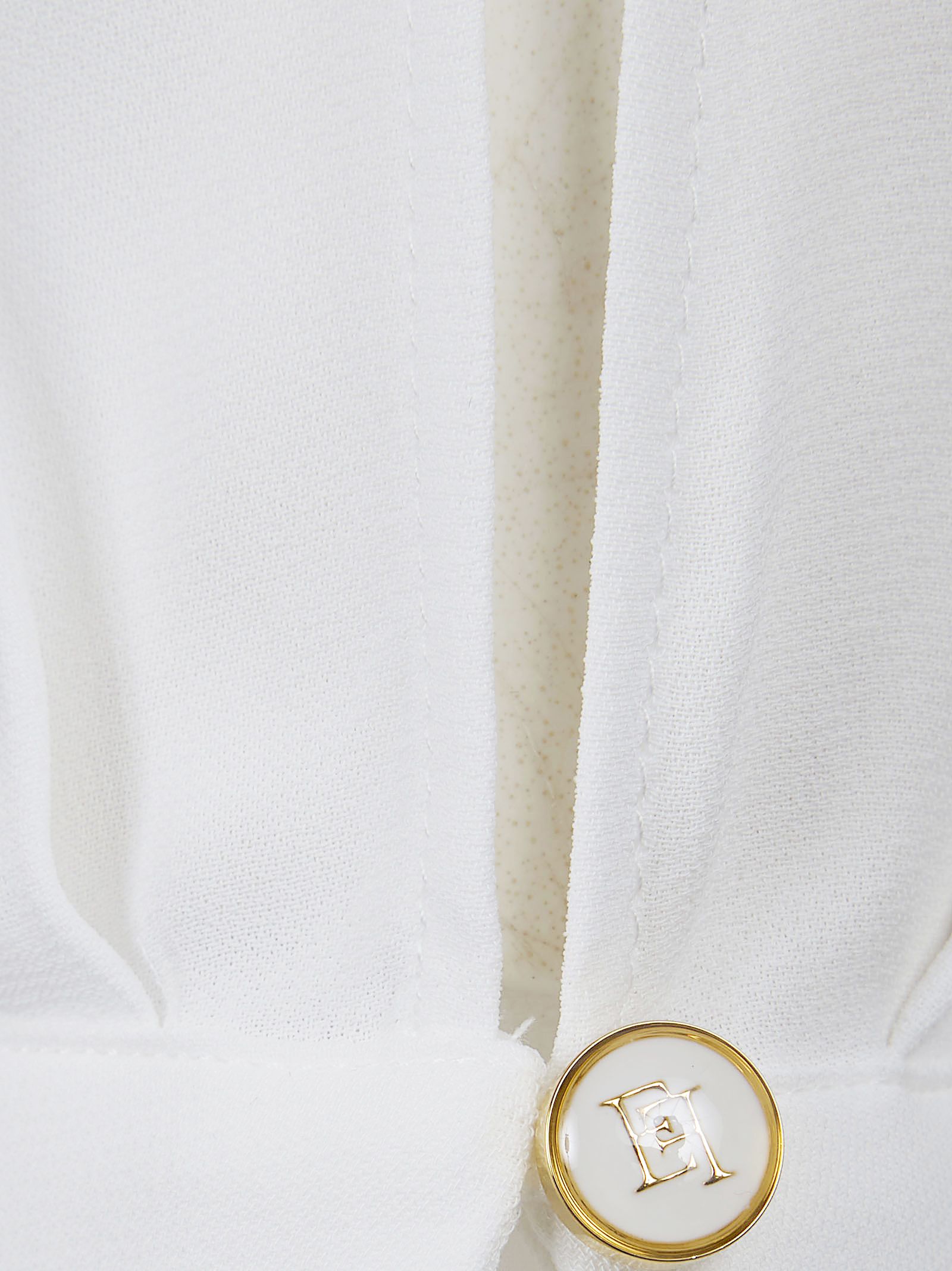 Body in georgette di viscosa di ELISABETTA FRANCHI.Scollo a V; maniche lunghe con polsini rifiniti con dettagli in organza e dai bottoni con Logo; spalline imbottite; colletto a camicia.Caratterizzato da gronda che cade sul davanti.